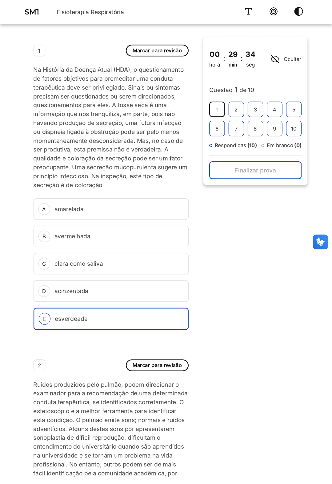 A B C D E 1 Marcar para revisão Na História da Doença Atual (HDA), o questionamento de fatores objetivos para premeditar uma conduta terapêutica deve ser privilegiado. Sinais ou sintomas precisam ser questionados ou serem direcionados, questionamentos para eles. A tosse seca é uma informação que nos tranquiliza, em parte, pois não havendo produção de secreção, uma futura infecção ou dispneia ligada à obstrução pode ser pelo menos momentaneamente desconsiderada. Mas, no caso de ser produtiva, esta premissa não é verdadeira. A qualidade e coloração da secreção pode ser um fator preocupante. Uma secreção mucopurulenta sugere um princípio infeccioso. Na inspeção, este tipo de secreção é de coloração amarelada avermelhada clara como saliva acinzentada esverdeada 2 Marcar para revisão Ruídos produzidos pelo pulmão, podem direcionar o examinador para a recomendação de uma determinada conduta terapêutica, se identificados corretamente. O estetoscópio é a melhor ferramenta para identificar esta condição. O pulmão emite sons; normais e ruídos adventícios. Alguns destes sons por apresentarem sonoplastia de difícil reprodução, dificultam o entendimento do universitário quando são aprendidos na universidade e se tornam um problema na vida profissional. No entanto, outros podem ser de mais fácil identificação pela comunidade acadêmica, por 00 hora : 29 min : 34 seg Ocultar Questão 1 de 10 Respondidas (10) Em branco (0) Finalizar prova 1 2 3 4 5 6 7 8 9 10 SM1 Fisioterapia Respiratória A B C D E A B C serem ensinados a partir de exemplos simples, considerados como padrão. Um destes é o de associar um determinado ruído adventício ao de se oferecer atrito com a ponta dos dedos a uma mecha de cabelo. Esse ruído adventício é o: ronco sibilo estertor subcreptante estertor creptante murmúrio vesicular 3 Marcar para revisão A inspeção do tórax é um ato puramente observatório. No entanto, podemos suspeitar de uma realidade diagnóstica, certificar-nos de um excesso de trabalho muscular respiratório, além de possibilitar a execução de uma fácil avaliação dos movimentos torácicos, oportunamente verificando a frequência da respiração. Portanto, a inspeção do tórax é um procedimento inquestionavelmente necessário. Ao detectar uma depressão dinâmica dos espaços intercostais, em pacientes adultos, portadores de transtornos respiratórios e em pacientes neonatos enfermos, estaríamos diante de: Um tórax em barril. Um pectus carinatum. Uma tiragem intercostal. D E A B C D E Um pectus escavatum. Do uso de músculos acessórios da respiração. 4 Marcar para revisão Na ausculta pulmonar, o conhecimento dos sons pulmonares normais e anormais (ditos: ruídos adventícios), um bom estetoscópio e uma boa capacidade auditiva, são elementos necessários para o diagnóstico correto e a melhor conduta a ser tomada. Alguns ruídos adventícios apresentam sonorização similar, no entanto condutas antagônicas. Um exemplo é o sibilo, um som auscultado que é similar a um piado ou miado de gato. Assinale a opção que indica o que representa este achado auscultatório. Presença de secreção nas vias aéreas de caráter muito fluído quando auscultados na inspiração. Presença de secreção fluída nas vias aéreas quando auscultados na expiração. Presença de espasmos brônquicos quando auscultados na inspiração. Presença de secreção de caráter muito espessa quando auscultados na expiração. Presença de espasmos brônquicos quando auscultado na expiração. 5 Marcar para revisão O Tempo Expiratório Forçado (TEF) não apresenta relevante valor diagnóstico, quando comparado à CVF, o VEF1 e a relação VEF1/CVF. Porém, sua identificação no traçado gráfico produzido pela espirometria complementa algumas informações, de forma visual, dando bases para uma possível confirmação A B C D E diagnóstica. É uma afirmação consistente de ser aceita sobre o TEF: Seu aumento sempre representa um distúrbio ventilatório. Representa o tempo entre o início súbito da expiração forçada e o platô da curva volume- tempo alcançado. Na curva volume-tempo, através dele, pode ser observado evidentemente o grau de esforço do paciente. É definido como um tempo gasto desde o VEF1 medido ao final da CVF medida. Representa o tempo entre o final da expiração forçada e o declínio do traçado da curva, durante uma manobra de capacidade vital forçada. 6 Marcar para revisão A curva fluxo-volume é igualmente precisa quando comparada à curva volume-tempo, para o registro dos volumes respiratórios a serem avaliados pela espirometria. Mesmo sendo assim considerada, os procedimentos para a construção do registro gráfico são um tanto diferentes, em comparação à curva volume-tempo. Considerando que se deva, corretamente, instruir o examinado a respeito de como irá realizar a manobra respiratória para a construção da curva fluxo-volume, analise a sequência disponibilizada abaixo: (......) O examinado, imediatamente após ao término da expiração longa, rápida e forçada (......) O examinado realiza uma pausa pós-inspiratória. (......) Realiza uma inspiração rápida de forma profunda e com o máximo esforço possível. (......) O examinado inspira profundamente com o bocal ainda longe da boca. (......) O examinado expira rápida e forçadamente. Agora assinale a alternativa que corresponde à sequência temporal correta dos procedimentos acima: A B C D E A B C D E 4 - 2 - 3 - 5 - 1. 2 - 1 - 3 - 5 - 4. 5 - 1 - 2 - 4 - 3. 1 - 2 - 4 - 3 - 5. 4 - 2 - 5 - 1 - 3. 7 Marcar para revisão Os distúrbios ventilatórios podem ser avaliados pela sua gravidade em: leve, moderado e grave. A avaliação do grau presente em um paciente restritivo depende da análise da CVF. O valor da CVF observado, para a determinação da severidade do distúrbio restritivo, deve ser computado analisando-se a % do previsto. Em um paciente port