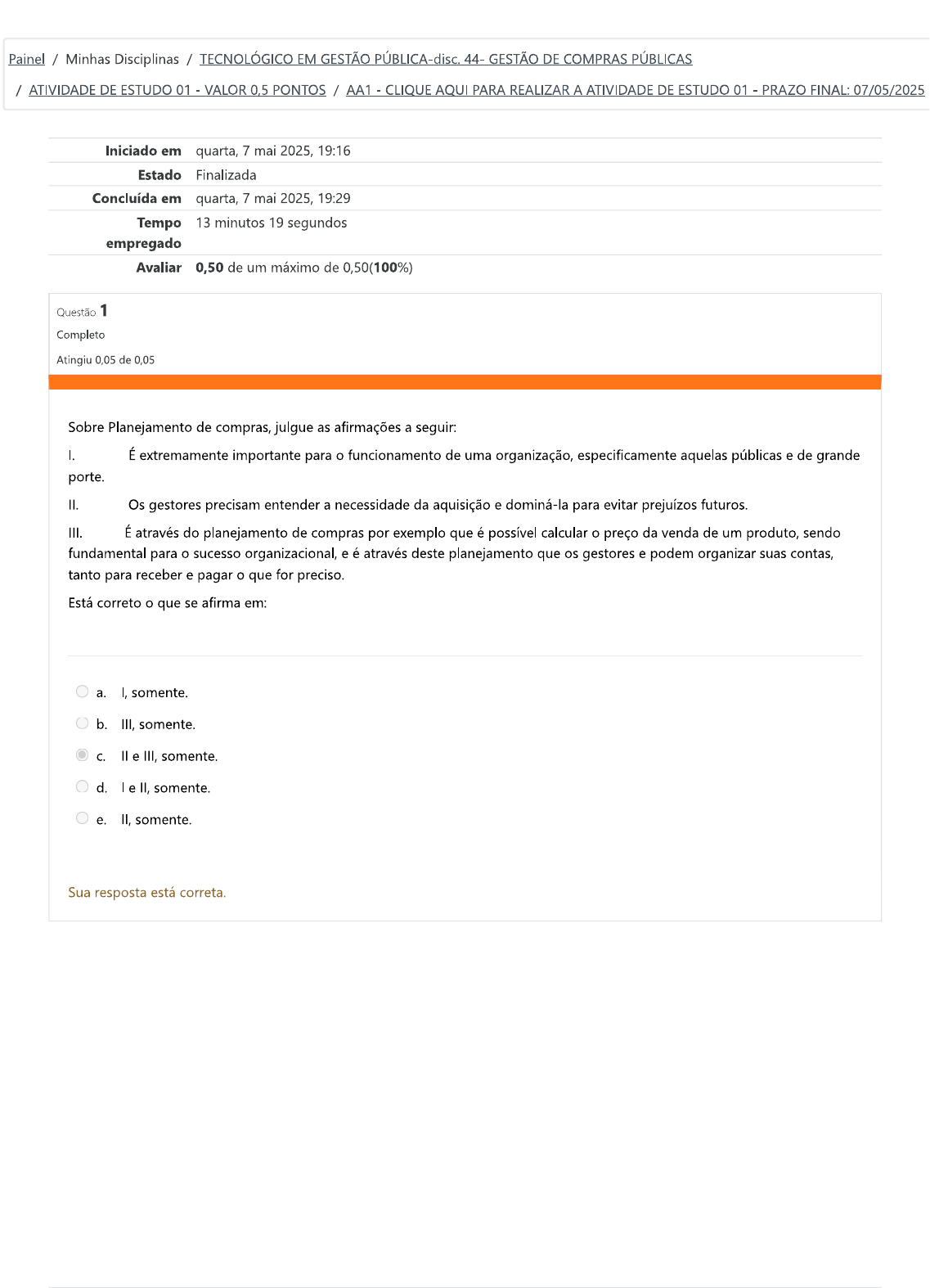 Painel / Minhas Disciplinas / TECNOLÓGICO EM GESTÃO PÚBLICA-disc. 44- GESTÃO DE COMPRAS PÚBLICAS / ATIVIDADE DE ESTUDO 01 - VALOR 0,5 PONTOS / AA1 CLIQUE AQUI PARA REALIZAR A ATIVIDADE DE ESTUDO 01 PRAZO FINAL: 07/05/2025 Iniciado em quarta, 7 mai 2025, 19:16 Estado Finalizada Concluída em quarta, 7 mai 2025, 19:29 Tempo 13 minutos 19 segundos empregado Avaliar 0,50 de um máximo de 0,50(100%) Questão 1 Completo Atingiu 0,05 de 0,05 Sobre Planejamento de compras, julgue as afirmações a seguir: I. É extremamente importante para o funcionamento de uma organização, especificamente aquelas públicas e de grande porte. II. Os gestores precisam entender a necessidade da aquisição e dominá-la para evitar prejuízos futuros III. É através do planejamento de compras por exemplo que é possível calcular o preço da venda de um produto, sendo fundamental para o sucesso organizacional, e é através deste planejamento que os gestores e podem organizar suas contas, tanto para receber e pagar o que for preciso. Está correto o que se afirma em: a. I, somente. b. III, somente. C. II e III, somente. d. le II, somente. e. II, somente. Sua resposta está correta.Questão 2 Completo Atingiu 0,05 de 0,05 Conforme artigo 38 da Lei n° 8666/93, deverá ser aberto um processo administrativo, autuado, protocolado e numerado, em formato de processo eletrônico, onde o Decreto Federal n° 8.539 de 08 de outubro de 2015 instituiu o uso obrigatório do processo administrativo eletrônico, dispondo sobre este meio para a realização do processo administrativo no âmbito da Administração Pública Federal Direta, Autárquica e Fundacional, onde seu objetivo é que, todos os atos processuais do processo administrativo sejam registrados e disponibilizados por meio eletrônico e não mais por processos arcaicos e morosos baseados em papel, como era feito anteriormente. a. Abertura da b. Fechamento do processo administrativo. C. Abertura do processo administrativo. d. Justificativa da contratação. e. Abertura do processo operacional. Sua resposta está correta. Questão 3 Completo Atingiu 0,05 de 0,05 O planejamento que tem como atribuição ditar o futuro da empresa é o: a. Tático. b. Estratégico. C. Organizacional. d. Operacional. e. Tácito. Sua resposta está correta.Questão 4 Completo Atingiu 0,05 de 0,05 O planejamento pode ser caracterizado de acordo com os níveis hierárquicos considerados, em três tipos de planejamento, que são citados a seguir: a. Planejamento Estratégico; Planejamento Tático; Planejamento Organizacional. b. Planejamento Emocional; Planejamento Tático; Planejamento Operacional. C. Planejamento Específico; Planejamento Tático; Planejamento Operacional. d. Planejamento Estratégico; Planejamento Tácito; Planejamento Operacional. e. Planejamento Estratégico; Planejamento Tático; Planejamento Operacional. Sua resposta está correta. Questão 5 Completo Atingiu 0,05 de 0,05 sistema PGC é uma ferramenta eletrônica que: I. Consolida todas as contratações que o órgão ou entidade pretende realizar no exercício subsequente, acompanhadas dos respectivos Estudos preliminares e Gerenciamento de riscos. II. A ferramenta permite a elaboração do Plano Anual de Contratações, por meio de módulos de preenchimento simplificado, estruturando as informações relativas ao planejamento das contratações públicas dos órgãos ou entidades da Administração Pública federal direta, autárquica e fundacional. III. É um exemplo de uma metodologia consagrada que persiste atualmente, mesmo após anos de sua criação. Essa matriz foi desenvolvida para análise de carteiras de produtos ou serviços de uma empresa e também para análise de unidades de negócios de grandes corporações. Está correto o que se afirma apenas em: a. e III. b. III. C. III. d. I, e III. Sua resposta está correta.Questão 6 Completo Atingiu 0,05 de 0,05 Uma licitação tem seu nascimento a partir de uma necessidade, um problema ou demanda que a Administração detecta e que precisa ser solucionado para que possa atingir seus objetivos, onde quem identifica tal problema ou necessidade é o setor requisitante a qual a necessidade está localizada ou vinculada, em que tal necessidade deve estar expressamente indicada no processo da licitação a se formar. a. Requisição do b. Abertura do processo administrativo. C. Elaboração. d. Identificação da necessidade. e. Autorização da abertura da licitação. Sua resposta está correta. Questão 7 Completo Atingiu 0,05 de 0,05 A Autoridade Competente, que no caso pode ser o chefe do poder executivo, legislativo, judiciário ou um subordinado responsável e a quem compete tal ação, avalia a conveniência e oportunidade da contratação e manifesta sua concordância ou não com a instauração da licitação. Essa autorização é o ato administrativo que formaliza o início da licitação, ou seja, sua liberação para acontecer. mesmo deve justificar então, diante da concordância com o processo, a real necessidade da contratação, indicando que o objeto do certame será o que o órgão/entidade precisa contratar para atender a sua necessidade, problema ou demanda identificada. a. Abertura do processo administrativo. b. Autorização da abertura da licitação, pela autoridade competente e justificativa da contratação. C. Planejamento. d. Identificação da necessidade. e. Análise jurídica. Sua resposta está correta.Questão 8 Completo Atingiu 0,05 de 0,05 As organizações dependem cada vez mais de a importância dos consumidores. Diante disto entender a relação entre produtos e clientes é necessário para os gestores de marketing traçar os hábitos de consumo. Mais do que compreender o que os clientes compram, é necessário entender o funcionamento de todo o processo de compra e as fases de transição. Engel, Blackwell e Minard (2013) fazem uma analogia do processo de compra a um mapa rodoviário estes autores descrevem o process