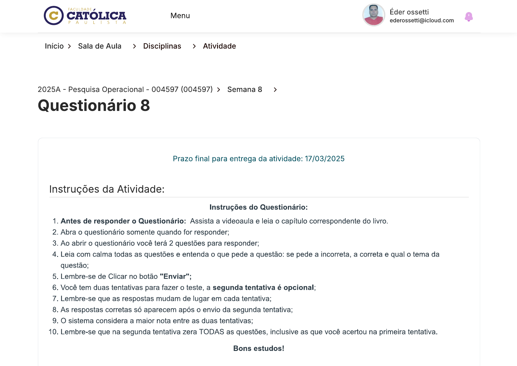 FACULDADE , C ossetti CATOLICA Menu PAULISTA ederossetti@icloud.com Início > Sala de Aula > Disciplinas > Atividade 2025A Pesquisa Operacional - 004597 (004597) > Semana 8 > Questionário 8 Prazo final para entrega da atividade: 17/03/2025 Instruções da Atividade: Instruções do Questionário: 1. Antes de responder o Questionário: Assista a videoaula e leia o capítulo correspondente do livro 2. Abra o questionário somente quando for responder; 3. Ao abrir o questionário você terá 2 questões para responder; 4. Leia com calma todas as questões e entenda o que pede a questão: se pede a incorreta, a correta e qual o tema da questão; 5. Lembre-se de Clicar no botão "Enviar"; 6. Você tem duas tentativas para fazer o teste, a segunda tentativa é opcional; 7. Lembre-se que as respostas mudam de lugar em cada tentativa; 8. As respostas corretas só aparecem após o envio da segunda tentativa; 9. O sistema considera a maior nota entre as duas tentativas; 10. Lembre-se que na segunda tentativa zera TODAS as questões, inclusive as que você acertou na primeira tentativa. Bons estudos!FACULDADE C CATOLICA Menu Éder ossetti P AULISTA ederossetti@icloud.com Nota Automática -- Nota Final: 0,200 de 0,200 pontos ederossetti@icloud.com - 03/03/2025 23:40:38 Visualizar Entrega Perguntas Pergunta 1. Pergunta 2. Pergunta 1. pontos: 0,100 Avaliação A Inteligência Artificial proporciona diversas contribuições para as empresas nos mais Nota Avaliada: diversos segmentos de negócios. A realização por parte da Inteligência Artificial de atividades 0,100 de 0,100FACULDADE , C CATOLICA Éder ossetti Menu PAULISTA ederossetti@icloud.com Múltipla Escolha: A. Tomar a decisão de quem precisa ser operado ou não B. Decidir sobre correto diagnóstico dos pacientes C. Tomar a decisão de quem deve doar sangue ou não D. Realizar a análise e resultados de exames laboratoriais E. Decidir quem será próximo paciente a ser transferido de unidade Pergunta 2. pontos: 0,100 Avaliação A Inteligência Artificial vem ganhando cada vez mais espaço nas empresas, auxiliando em Nota Avaliada: diversos processos e demandas organizacionais. Geralmente, boa parte desta contribuição 0,100 de 0,100 está associada a tarefas repetitivas como a criação de apresentações, textos, imagens e vídeos. Sobre a Inteligência Artificial, avalie as asserções a seguir e a relação entre elas - - A Inteligência Artificial busca reproduzir o pensamento e raciocínio humano. PORQUE Il - - É também conhecida como a inteligência das máquinas. Múltipla Escolha:FACULDADE C CATOLICA ossetti Menu PAULISTA ederossetti@icloud.com C. As asserções e são verdadeiras, mas a não justifica a I. D. As asserções e são falsas. E. A asserção é falsa, e a II, verdadeira. Fechar Visualização FACULDADE , Contato C CATOLICA Endereço P WhatsApp : Avenida Cristo Rei, 305 - Banzato Faculdade Católica Paulista Marília, Telefone Sede: (14)3422-1815 São Paulo - CEP: 17515-200 f Central de Atendimento: 0800 664 5583 Horário De FuncionamentoFACULDADE C CATOLICA Éder ossetti Menu U S
