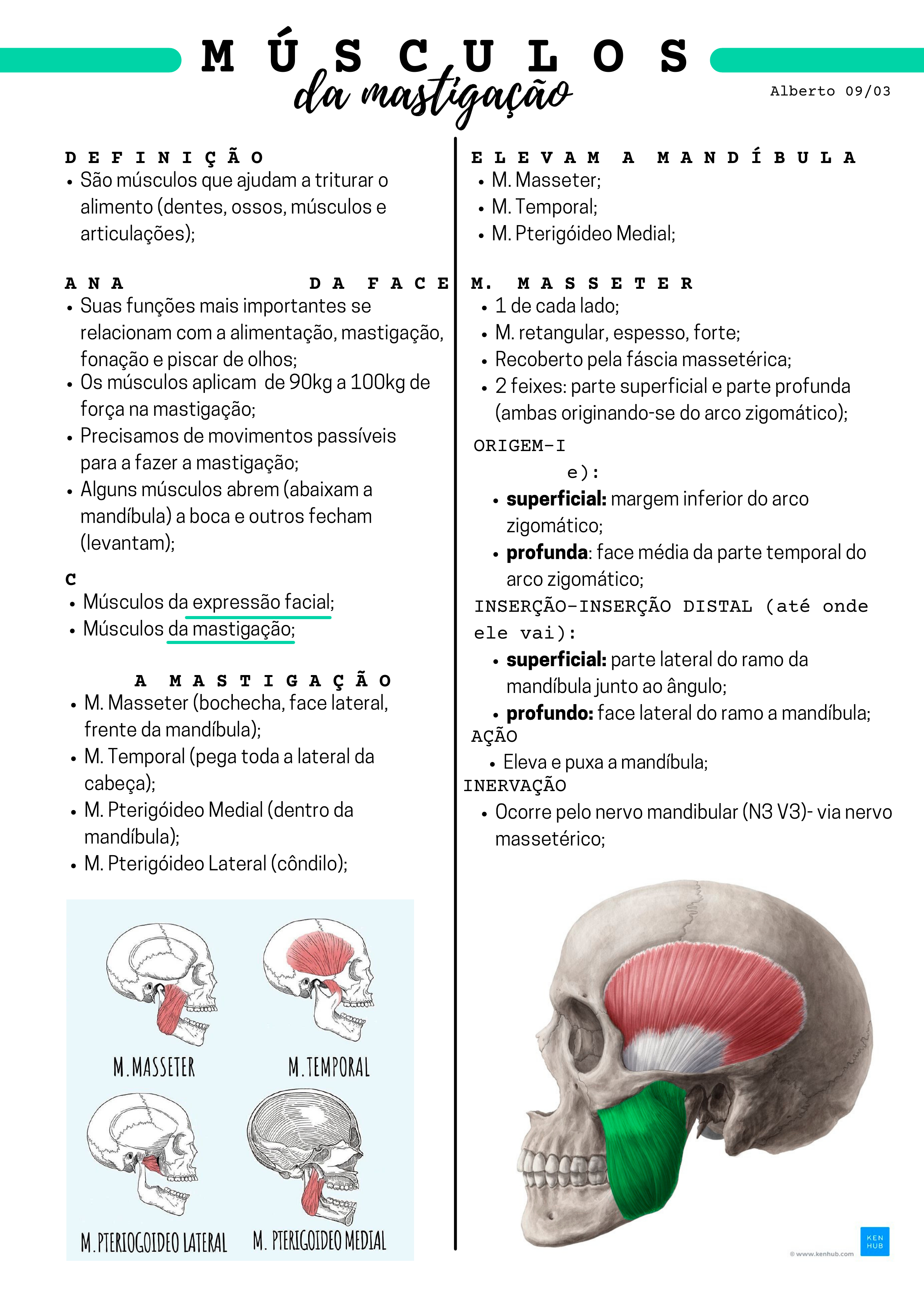 Músculos da expressão facial; Músculos da mastigação; M Ú S C U L O S da mastigação Alberto 09/03 D E F I N I Ç Ã O São músculos que ajudam a triturar o alimento (dentes, ossos, músculos e articulações); A N A T O M I A M. D A F A C E Suas funções mais importantes se relacionam com a alimentação, mastigação, fonação e piscar de olhos; C L A S S I F I C A Ç Ã O Os músculos aplicam de 90kg a 100kg de força na mastigação; Precisamos de movimentos passíveis para a fazer a mastigação; Alguns músculos abrem (abaixam a mandíbula) a boca e outros fecham (levantam); M. D A M A S T I G A Ç Ã O M. Masseter (bochecha, face lateral, frente da mandíbula); M. Temporal (pega toda a lateral da cabeça); M. Pterigóideo Medial (dentro da mandíbula); M. Pterigóideo Lateral (côndilo); E L E V A M A M A N D Í B U L A M. Masseter; M. Temporal; M. Pterigóideo Medial; M. M A S S E T E R 1 de cada lado; M. retangular, espesso, forte; Recoberto pela fáscia massetérica; 2 feixes: parte superficial e parte profunda (ambas originando-se do arco zigomático); superficial: margem inferior do arco zigomático; profunda: face média da parte temporal do arco zigomático; superficial: parte lateral do ramo da mandíbula junto ao ângulo; profundo: face lateral do ramo a mandíbula; ORIGEM-INSERÇÃO PROXIMAL (da onde ele parte): INSERÇÃO-INSERÇÃO DISTAL (até onde ele vai): Eleva e puxa a mandíbula; AÇÃO Ocorre pelo nervo mandibular (N3 V3)- via nervo massetérico; INERVAÇÃO M. T E M P O R A L 1 de cada lado; É um m. da mastigação plano, em forma de leque , localizado na lateral do crânio; Se fixa na linha temporal inferior; Possui 3 feixes: anterior (fibras verticais) média (fibras oblíquas) posterior (fibras horizontais) Linha temporal inferior (fáscia temporal); 1/3 médio da face medial do arco zigomático; Asa maior do esfenóide (parte profunda); Processo coronóide da mandíbula (o m. passa medialmente ao arco zigomático e se insere no processo coronóide da mandíbula); Levantador e retropulsor da mandíbula; Nervos temporais superficiais e profundos, que se ramificam do nervo mandibular do nervo trigêmeo; ORIGEM: INSERÇÃO: AÇÃO: INERVAÇÃO: M. P T E R I G Ó I D E O L A T E R A L É o mais curto; Relaciona-se com a articulação (disco articular, cápsula); 2 feixes: Cabeça SUPERIOR: puxa o disco para acompanhar o côndilo quando contrai; Cabeça INFERIOR: traz o côndilo para frente quando contrai; M. inserido no colo da mandíbula; Cabeça SUPERIOR (esfenoide): face temporal da asa maior do osso esfenoide e crista infratemporal e face temporal da lâmina lateral do processo pterigóideo; Cabeça INFERIOR (pterigóidea): Face lateral da lâmina lateral do processo pterigóide, processo piramidal do osso palatino e tuberosidade da maxila; Cápsula e disco articular da ATM e fóvea pterigóidea; Contração conjunta: propulsão da mandíbula e abaixamento; Contração ipsolateral: lateridade da mandíbula; Nervo pterigóideo (NC V3), também do nervo mandibular (trigêmeo); ORIGEM: INSERÇÃO: AÇÃO: INERVAÇÃO: M. P T E R I G Ó I D E O M E D I A L 1 de cada lado; Menor que o Masseter; Espesso , volumoso; Sinérgico ao Masseter; Fossa pterigóidea; Lâmina lateral do processo pterigóide; Processo piramidal do osso palatino; Tuberosidade da maxila; Tuberosidade pterigóidea da mandíbula; Levantador da mandíbula; Nervo pterigóideo medial (NC V3); Ramificação pela mandíbula (trigêmeo); ORIGEM: INSERÇÃO: AÇÃO: INERVAÇÃO: Principal abaixador; Localizado no compartimento anterior do pescoço Usa o hióide como apoio; Ventre posterior: incisura mastóidea do temporal; Ventre anterior: fossa digástrica da mandíbula; Abaixador e retropulsor da mendíbula, eleva o osso hióide na fala e gustação; Ramo do nervo mandibular (nervo milo- hióideo) ORIGEM: INSERÇÃO: AÇÃO: INERVAÇÃO: M. D I G Á S T R I C O M. Digástrico (2 ventres , abaixa e puxa p/ trás) M. milo-hióideo M. gênio-hióideo M. estilo- hióideo M. S U P R A H I Ó I D E O S Abaixadores da mandíbula; São quatro músculos que cursam da mandíbula até o osso hioide; São pares; Unem o osso hióide ao crânio; Formam o assoalho da boca; Forma de U; Os m. que sustentam ; O S S O H I Ó I D E M. M I L O H I Ó I D E O Faz o assoalho da boca; Linha milo-hióidea da mandíbula; Rafe mediana e face anterior do hióide; Abaixador da mandíbula; Eleva o hióide; Eleva o assoalho da boca e língua durante a fala e gustação; Nervo milo-hiódeo, ramo da divisão alveolar inferior da divisão mandibular do nervo trigêmeo; ORIGEM: INSERÇÃO: AÇÃO: INERVAÇÃO: Em cima do Milo-hióideo; Corpo do hióideo (face anterior); Puxa o hióide antero superiormente, encurta o assoalho da boca e alarga a faringe, abaixador e retropulsor da mandíbula; ORIGEM: espinha geniana da mandíbula; INSERÇÃO: AÇÃO: INERVAÇÃO: Nervo hipoglosso; M. G Ê N I O H I Ó I D E O M. E S T I L O H I Ó I D E O Único que não se fixa na mandíbula; Processo estiloíde do temporal; Corpo do hióide; Eleva e retrai o hióide; Ramo do facial; ORIGEM: INSERÇÃO: AÇÃO: INERVAÇÃO: Músculos Supra-Hióideos Alberto 09/03