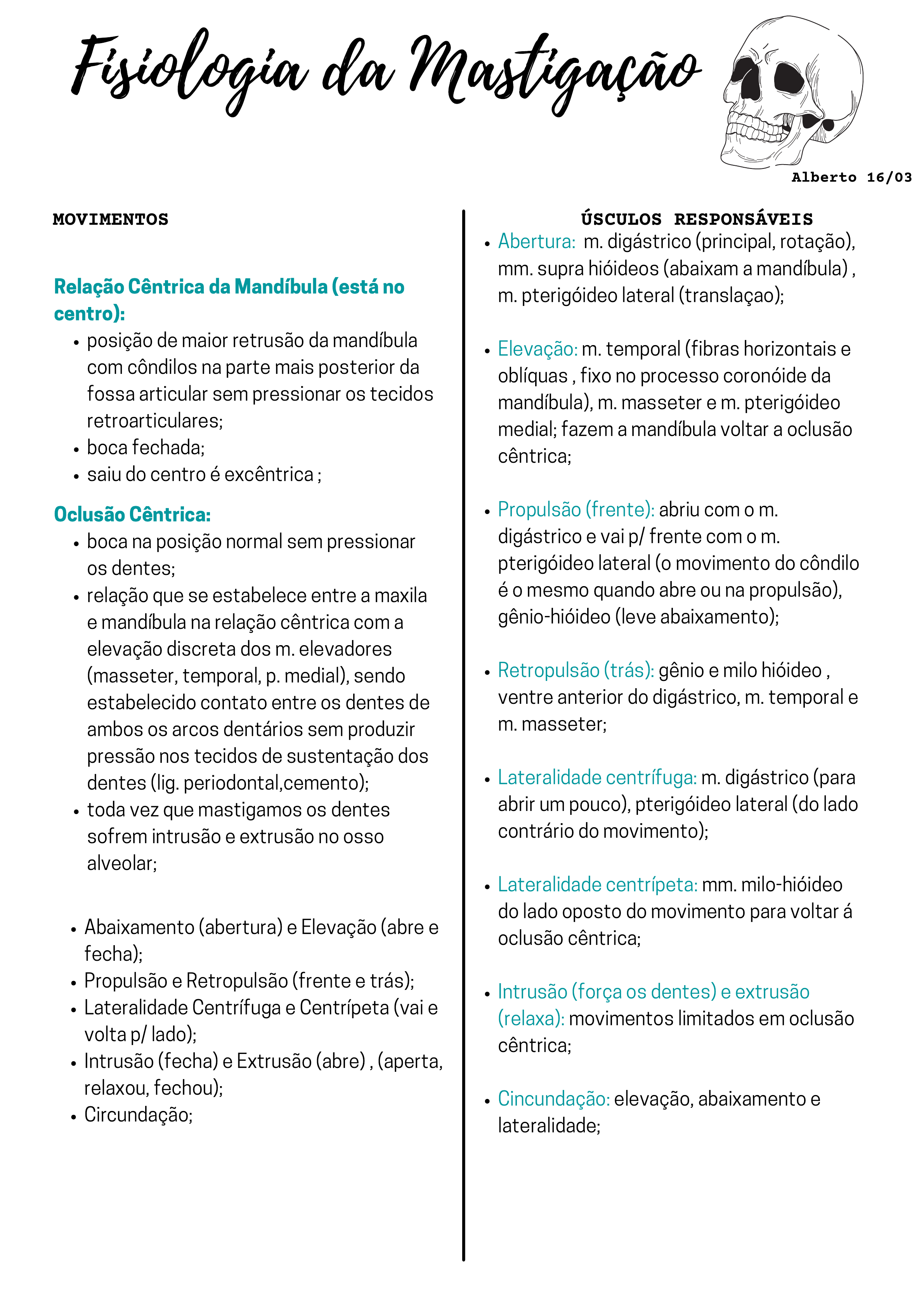 Fisiologia da Mastigação Alberto 16/03 MOVIMENTOS BÁSICOS (FISIOLÓGICOS) DA MANDÍBULA posição de maior retrusão da mandíbula com côndilos na parte mais posterior da fossa articular sem pressionar os tecidos retroarticulares; boca fechada; saiu do centro é excêntrica ; Relação Cêntrica da Mandíbula (está no centro): boca na posição normal sem pressionar os dentes; relação que se estabelece entre a maxila e mandíbula na relação cêntrica com a elevação discreta dos m. elevadores (masseter, temporal, p. medial), sendo estabelecido contato entre os dentes de ambos os arcos dentários sem produzir pressão nos tecidos de sustentação dos dentes (lig. periodontal,cemento); toda vez que mastigamos os dentes sofrem intrusão e extrusão no osso alveolar; Oclusão Cêntrica: MOVIMENTOS MANDIBULARES Abaixamento (abertura) e Elevação (abre e fecha); Propulsão e Retropulsão (frente e trás); Lateralidade Centrífuga e Centrípeta (vai e volta p/ lado); Intrusão (fecha) e Extrusão (abre) , (aperta, relaxou, fechou); Circundação; MÚSCULOS RESPONSÁVEIS Abertura: m. digástrico (principal, rotação), mm. supra hióideos (abaixam a mandíbula) , m. pterigóideo lateral (translaçao); Elevação: m. temporal (fibras horizontais e oblíquas , fixo no processo coronóide da mandíbula), m. masseter e m. pterigóideo medial; fazem a mandíbula voltar a oclusão cêntrica; Propulsão (frente): abriu com o m. digástrico e vai p/ frente com o m. pterigóideo lateral (o movimento do côndilo é o mesmo quando abre ou na propulsão), gênio-hióideo (leve abaixamento); Retropulsão (trás): gênio e milo hióideo , ventre anterior do digástrico, m. temporal e m. masseter; Lateralidade centrífuga: m. digástrico (para abrir um pouco), pterigóideo lateral (do lado contrário do movimento); Lateralidade centrípeta: mm. milo-hióideo do lado oposto do movimento para voltar á oclusão cêntrica; Intrusão (força os dentes) e extrusão (relaxa): movimentos limitados em oclusão cêntrica; Cincundação: elevação, abaixamento e lateralidade; Anotações M. temporal: 3 feixes feixe posterior do temporal e ligamentos , limitam a abertura da mandíbula; Quem limita o fechamento da mandíbula são os dentes; Mastigação: masseter, temporal, pterigóideo medial (face medial do ramo da mandíbula); Abaixador: digástrico; Fossa Mandibular: está no osso temporal; Tuberosidade articular: anteriormente a fossa mandíbular; O côndilo gira dentro da fossa mandibular, movimento de rotação, depois ele desce e vem para a frente (translação) quando abaixa a mandíbula, o côndilo se alinha com a tuberosidade articular; Translação: pterigóideo lateral Rotação: digástrico Osso Hióide: região do pescoço; Supra hióide: estabilizam o osso hióide e se contraem para abaixar a mandíbula; Infra Hióides: estabilizam o osso hióide quando a mandíbula abaixa;