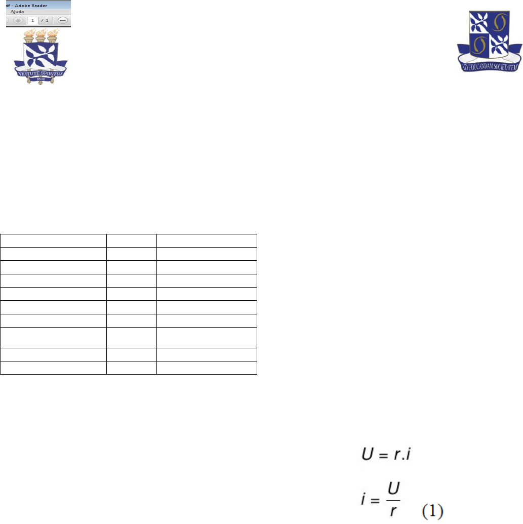 UNIVERSIDADE FEDERAL DA BAHIA INSTITUTO DE CIÊNCIA, TECNOLOGIA E INOVAÇÃO PIBIC-AF - DESENVOLVIMENTO DE KITS EXPERIMENTAIS DE BAIXO PARA APLICAÇÃO EM ESCOLAS PÚBLICAS DA CIDADE DE CAMAÇARI ORIENTADOR – IGOR LEONARDO COMES DE SOUZA ORIENTANDO - UILA SANTOS LIMA Experimento 1 – Acende ou não? 1 - Conceitos relacionados 1ª e 2ª Lei de Ohm (Tensão, Corrente e Resistência), Lei da Resistividade, Materiais Condutores e Isolantes. Grandeza elétrica Unidade Símbolo da unidade Potência elétrica Watts W Energia Joule J Intervalo de tempo Segundo s Resistência (R) Ohm Ω Corrente elétrica (I) Ámpere A Tensão (U) Volts V Resistividade (Ω.m) ρ Comprimento m L Área transversal (m²) A 2 – Objetivos O objetivo do experimento “Acende ou não” é fazer correr uma corrente elétrica num circuito simples, somente com uma pilha e uma lâmpada. Então, vai ser fechado o circuito com materiais variados para testar se o mesmo é condutor, e a lâmpada acende, ou isolante, e a lâmpada apaga. 3 - Método utilizado As duas pilhas serão presas por fita isolante (o negativo de uma com o positivo de outra) e desencape as duas pontas de um dos pedaços de fio e coloque uma delas no positivo de uma pilha. O outro pedaço de fio, também de desencapado, fixe uma extremidade na lâmpada e a outra no negativo da pilha. Encoste o fio do polo positivo na parte de baixo da lâmpada para testá-la. Se tudo estiver certo a lâmpada irá ascender. Teremos um circuito aberto e fecharemos ele com vários tipos de materiais e daí vamos analisar quais deles são condutores ou isolantes 4 – Equipamentos Dois pedaços de fio condutor (aproximadamente 30 cm de fio elétrico comum) Fios isolantes de borracha ou plástico Duas pilhas tipo comum de 1.5 Volts Uma lâmpada de 3V Um alicate de corte Um rolo de fita isolante 5 - Fundamentos Teóricos As leis de Ohm admitem calcularmos grandezas físicas fundamentais, como a tensão, corrente e a resistência elétrica dos mais variados elementos presentes em um circuito. Portanto, essas leis só podem ser aplicadas a resistências ôhmicas, isto é, corpos cujas resistências tenham módulo constante. 5.1 - 1ª lei de Ohm A 1ª lei de Ohm afirma que a diferença de potencial entre dois pontos de um resistor é proporcional à corrente elétrica que é situada nele. Além disso, conforme essa lei, a razão entre o potencial elétrico e a corrente elétrica é sempre constante para resistores ôhmicos. U – Tensão ou potencial elétrico R – resistência elétrica I – corrente elétrica A diferença de potencial elétrico entre dois pontos de um circuito, por sua vez, indica que ali existe uma resistência elétrica. Quando a corrente elétrica passa pelo elemento resistivo R, há uma queda de potencial elétrico. Essa diferença acontece por causa do consumo da energia dos elétrons, uma vez que essas partículas transferem parte de sua energia aos átomos da rede cristalina, quando conduzidos por meios que apresentem resistência à sua condução. O fenômeno que explica tal dissipação de energia é chamado de efeito Joule. Quando a corrente elétrica é conduzida em um corpo com resistência elétrica, parte de sua energia é dissipada. A corrente elétrica i mede o fluxo de cargas pelo corpo em Ampères, ou em C/s. A corrente elétrica é diretamente proporcional à resistência elétrica dos corpos: quanto maior for a resistência elétrica de um corpo, menor será a corrente elétrica a atravessá-lo. 5.2 - 2ª lei de Ohm A resistência elétrica R é uma propriedade do corpo que é percorrido por uma corrente elétrica. Essa propriedade depende de fatores geométricos, como o comprimento ou a área transversal do corpo, mas também depende de uma grandeza chamada de resistividade. Tal grandeza relaciona-se exclusivamente ao material do qual um corpo é formado. A lei que relaciona a resistência elétrica a essas grandezas é conhecida como segunda lei de Ohm. A segunda lei de Ohm é mostrada na figura abaixo: (2) R – resistência elétrica (Ω) ρ – resistividade (Ω.m) L – comprimento (m) A – área transversal (m²) Podemos chamar de resistor ôhmico todo corpo capaz de apresentar resistência elétrica constante para um determinado intervalo de tensões elétricas. O resistor pode ser considerado ôhmico no intervalo em que o seu potencial elétrico aumenta linearmente com a corrente elétrica. 5.3 - Potência elétrica pela lei de Ohm Por meio da lei de Ohm, é possível determinar a potência elétrica que é dissipada por um resistor. Tal dissipação de energia ocorre em razão do efeito Joule, por isso, ao calcularmos a potência dissipada, estamos determinando a quantidade de energia elétrica que um resistor é capaz de converter em calor, a cada segundo. Existem algumas equaçãos que podem ser usadas para calcular a potência elétrica, confira algumas delas: (3) 6 - Montagem e procedimento experimental Para montar o circuito, primeiro junte as pilhas e utilize um pedaço de fita isolante para prendê-las. Corte dois fios com 20 cm de comprimento e descasque as pontas. Em seguida fixe uma das extremidades de um dos cabos no polo positivo das pilhas. Pegue o outro cabo e fixe uma das extremidades na lâmpada e a outra extremidade no polo negativo da pilha. Agora encoste o fio do polo positivo na parte de baixo da lâmpada para testá-la. Se tudo estiver certo a lâmpada irá acender. E então os materiais serão testados encostando o fio que está ligado nas pilhas e encostando a parte de baixo no fio que está somente encostado no ponto metálico da lâmpada. Para isso, coloque-o em uma mesa (sem que se encoste à lâmpada) e sobre ele coloque algum dos materiais escolhidos. Depois basta encostar o contato da lâmpada sobre este material para fechar a conexão do circuito. E finalmente, basta verificar se a lâmpada acende o que significa que o material é condutor, ou não, e então o material é isolante. 7 - Análise 