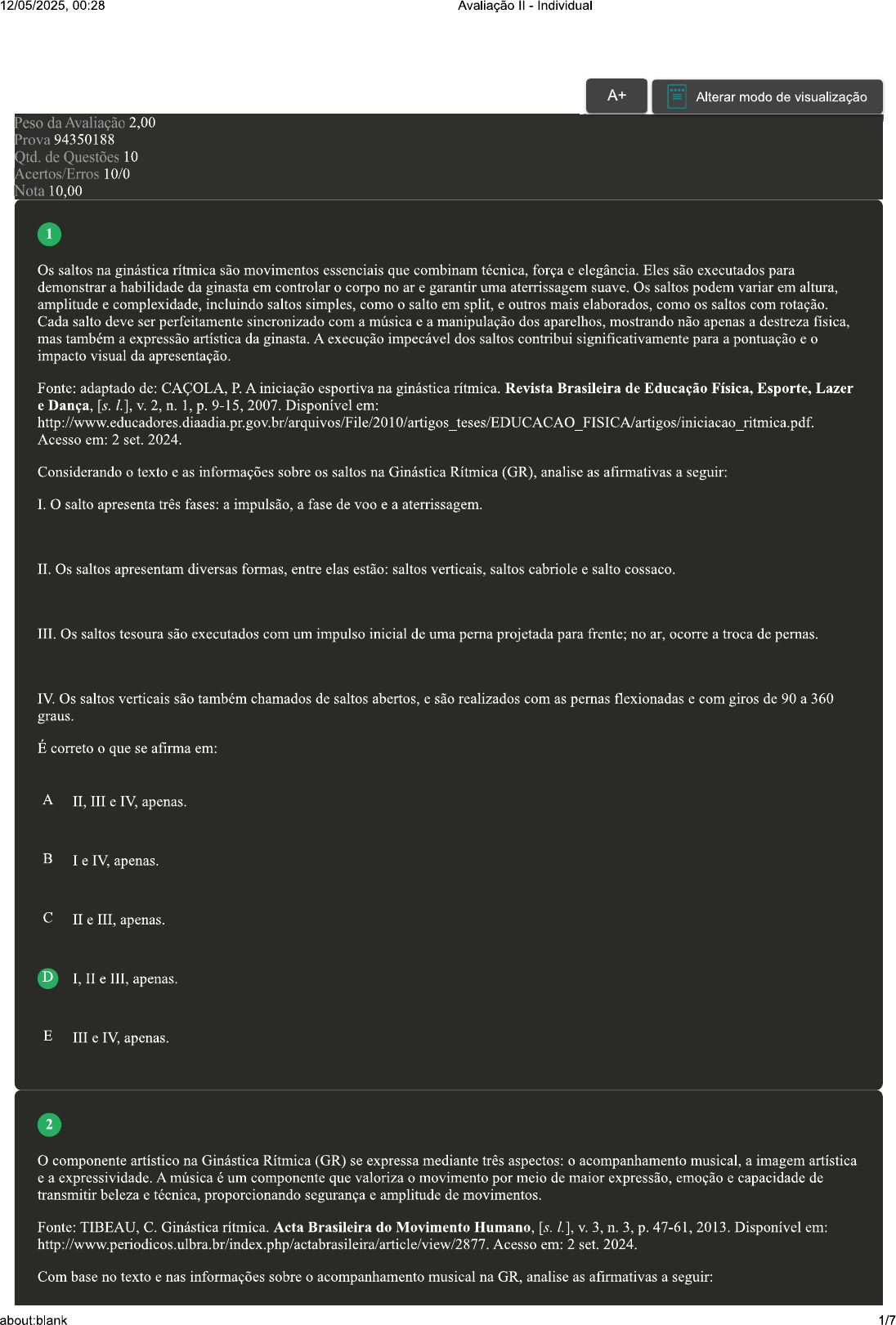 12/05/2025, 00:28 Avaliação Individual A+ Alterar modo de visualização Peso da Avaliação 2,00 Prova 94350188 Otd. de Questões 10 Acertos/Erros 10/0 Nota 10,00 1 Os saltos na ginástica rítmica são movimentos essenciais que combinam técnica, força e elegância. Eles são executados para demonstrar a habilidade da ginasta em controlar corpo no ar e garantir uma aterrissagem suave. Os saltos podem variar em altura. amplitude e complexidade, incluindo saltos simples, como salto em split, e outros mais elaborados, como os saltos com rotação. Cada salto deve ser perfeitamente sincronizado com a música e a manipulação dos aparelhos, mostrando não apenas a destreza mas também a expressão artística da ginasta. A execução impecável dos saltos contribui significativamente para a pontuação e impacto visual da apresentação. Fonte: adaptado de: P. A iniciação esportiva na ginástica rítmica. Revista Brasileira de Educação Física, Esporte, Lazer e Dança, [s. 2. n. 1. p. 9-15. 2007. Disponível em: Acesso em: 2 set. 2024. Considerando texto e as informações sobre os saltos na Ginástica Rítmica (GR), analise as afirmativas a seguir: I. salto apresenta três fases: a impulsão, a fase de e a aterrissagem. II. Os saltos apresentam diversas formas. entre elas estão: saltos verticais, saltos cabriole e salto cossaco. III. Os saltos tesoura são executados com um impulso inicial de uma perna projetada para frente: no ar. ocorre a troca de pernas. IV. Os saltos verticais são também chamados de saltos abertos, e são realizados com as pernas flexionadas e com giros de 90 a 360 graus. É correto o que se afirma em: A II. III e IV, apenas. B I e IV, apenas. C II e III, D I, II e III, apenas. E III e IV, apenas. 2 O componente artístico na Ginástica Rítmica (GR) se expressa mediante três aspectos: acompanhamento a imagem artística e a expressividade. A música é um componente que valoriza movimento por meio de maior expressão, emoção e capacidade de transmitir beleza e técnica, proporcionando segurança e amplitude de movimentos. Fonte: TIBEAU, C. Ginástica rítmica. Acta Brasileira do Movimento Humano, [s. V. 3. n. 3. p. 47-61, 2013. Disponível em: em: 2 set. 2024. Com base no texto e nas informações sobre acompanhamento musical na GR, analise as afirmativas a seguir: about:blank 1/712/05/2025, 00:28 Avaliação Individual I. A música na inicialmente, era executada apenas no piano. II. O ritmo e a expressividade que a ginasta apresenta são inspirados pela música. III. O acompanhamento musical atua como um suporte do movimento, além de ser potencializador e provocador. IV. O acompanhamento musical na GR atualmente permite músicas cantadas e com diversos instrumentos, porém com limitações. É correto que se afirma em: A III e IV, apenas. B I. II e III, apenas. C II e IV, apenas. D I. apenas. E I, II, III e IV. 3 Além dos aparelhos específicos da Ginástica Rítmica (GR), temos os elementos corporais, que são aqueles que as ginastas devem executar durante suas coreografias. Como elementos corporais fundamentais (obrigatórios), temos: saltos, equilíbrios e elementos de rotação. Fonte: G. Flexibilidade Olímpica: a relação entre a Ginástica Rítmica e Ballet. Evidence Ballet, 2021. Disponível em: Acesso em: 2 set. 2024. Considerando texto, a imagem e as informações sobre os equilíbrios, analise as afirmativas a seguir: I. O equilíbrio é dividido em três fases: a preparação, a posição em equilíbrio e a finalização. II. O equilíbrio em passé e o equilíbrio a 90 graus são considerados formas básicas de equilíbrio na III. A forma do equilíbrio é considerada quando está sobre pé em meia-ponta ou sobre pé inteiro no chão. IV. O equilíbrio atittude é semelhante ao equilíbrio em perna alta, modificando a altura do joelho em relação ao pé. É correto que se afirma em: about:blank 2/712/05/2025, 00:28 Avaliação Individual A III e IV, apenas. B III e IV, apenas. C II e III, apenas. D IV. apenas. E I, II e III, apenas. 4 A Ginástica Rítmica (GR) é um esporte que se apresenta por aderir ao corpo o uso da arte, da criatividade e de capacidades físicas a partir de sua estrutura trifásica, embalando acompanhamento musical, manejo de aparelho e elementos corporais. Isso tudo em um processo que foi constituindo-se ao percurso da história em analogia estreita com uma série de mudanças estruturais e sociais efetuadas no campo esportivo no último século. Fonte: adaptado de: PAZ, B. SOUZA, J. BARBOSA-RINALDI, A constituição de um subcampo esportivo: caso da ginástica rítmica. Movimento, [s. 24, p. 651-664, 2022. Disponível em: https://curtlink.com/JkNkqhi Acesso em: 30 ago. 2024 Com base no texto e nas informações sobre a Ginástica Rítmica (GR), analise as afirmativas a I. A GR foi criada através da motivação de valorização das mulheres. II. A GR é praticada apenas por mulheres de forma oficial e não oficial. III. A GR apresenta uma coreografia com contagem métrica musical e rigidez. IV. A GR se firmou como uma união do ballet (elegante), do teatro (drama) e da música. É correto que se afirma em: A III e IV, apenas. B II e III, apenas. C II, III e IV, apenas. D I e IV, apenas. E I, II e III, apenas 5 A Ginástica Rítmica é uma modalidade que combina dança e acrobacia com a manipulação de aparelhos específicos. são utilizados cinco aparelhos: corda, arco, maças, bola e fita. Em competições destacam-se arco. a bola, as maças e a fita. Cada aparelho requer técnicas distintas: a bola exige controle de precisão, a fita permite movimentos fluídos e sinuosos, as maças são usadas para criar padrões dinâmicos, e arco é manuseado em formas geométricas. A performance envolve a integração desses aparelhos com coreografias, expressividade e ritmo, resultando em apresentações visivelmente elegantes e complexas. Fonte: adaptado de: P. et al. Ginástica rítmica: história, características. eleme