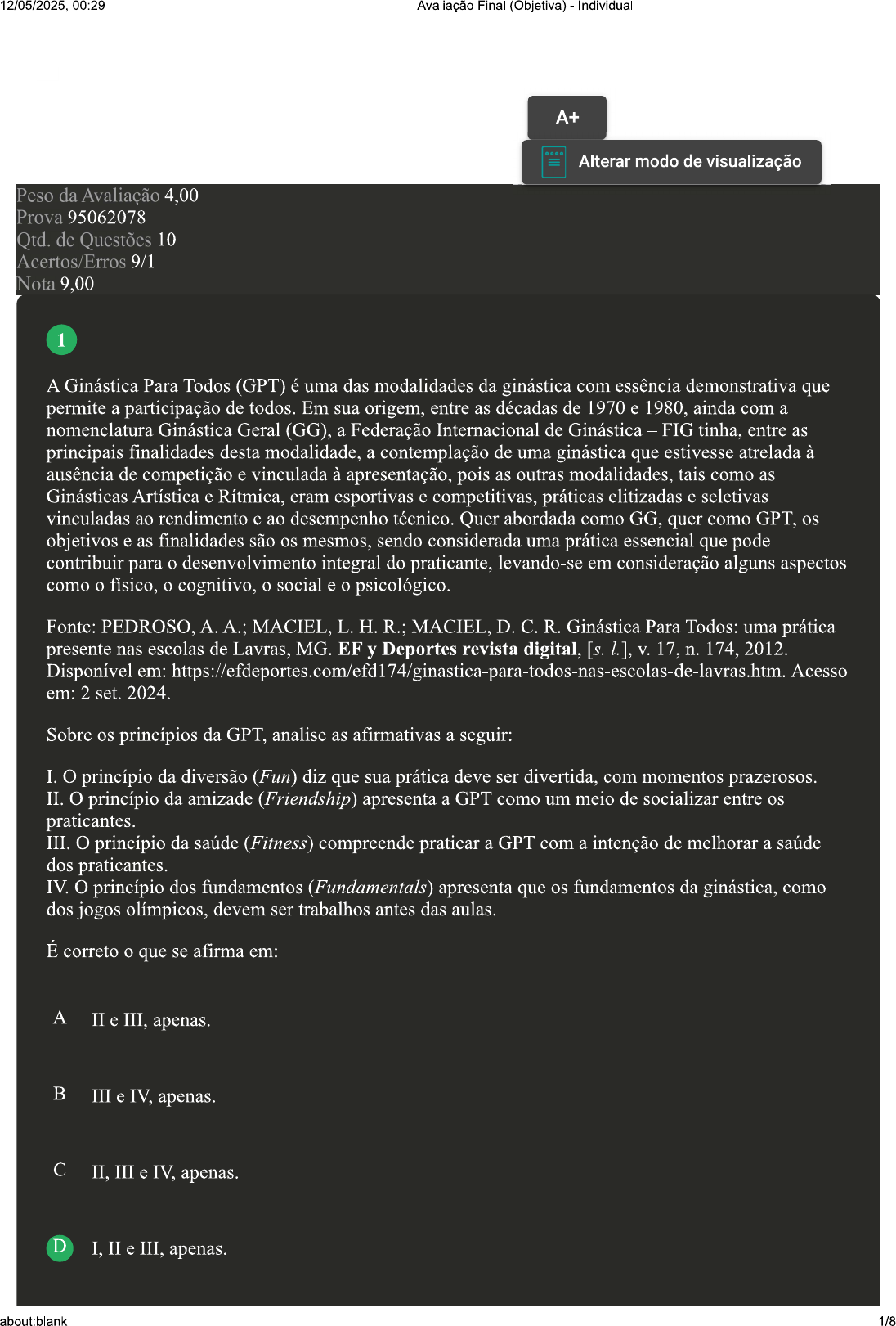 12/05/2025, 00:29 Avaliação Final (Objetiva) - Individual A+ Alterar modo de visualização Peso da Avaliação 4,00 Prova 95062078 Qtd. de Questões 10 Acertos/Erros 9/1 Nota 9,00 1 A Ginástica Para Todos (GPT) é uma das modalidades da ginástica com essência demonstrativa que permite a participação de todos. Em sua origem, entre as décadas de 1970 e 1980, ainda com a nomenclatura Ginástica Geral (GG), a Federação Internacional de Ginástica FIG tinha, entre as principais finalidades desta modalidade, a contemplação de uma ginástica que estivesse atrelada à ausência de competição e vinculada à apresentação, pois as outras modalidades, tais como as Ginásticas Artística e Rítmica, eram esportivas e competitivas, práticas elitizadas e seletivas vinculadas ao rendimento e ao desempenho técnico. Quer abordada como GG, quer como GPT, os objetivos e as finalidades são os mesmos, sendo considerada uma prática essencial que pode contribuir para desenvolvimento integral do praticante, levando-se em consideração alguns aspectos como físico, cognitivo, social e psicológico. Fonte: PEDROSO, A. A.; MACIEL, L. H. R.; MACIEL, D. C. R. Ginástica Para Todos: uma prática presente nas escolas de Lavras, MG. EF y Deportes revista digital, [s. V. 17, n. 174, 2012. Disponível em: 2 set. 2024. Sobre os princípios da GPT, analise as afirmativas a seguir: I. O princípio da diversão (Fun) diz que sua prática deve ser divertida, com momentos prazerosos. II. O princípio da amizade (Friendship) apresenta a GPT como um meio de socializar entre os praticantes. III. O princípio da saúde (Fitness) compreende praticar a GPT com a intenção de melhorar a saúde dos praticantes. IV. O princípio dos fundamentos (Fundamentals) apresenta que os fundamentos da ginástica, como dos jogos olímpicos, devem ser trabalhos antes das aulas. É correto que se afirma em: A II e III, apenas. B III e IV, apenas. C II, III e IV, apenas. D I, II e III, apenas. about:blank 1/812/05/2025, 00:29 Avaliação Final (Objetiva) Individual E I e IV, apenas. 2 Nos últimos anos, cresceram no Brasil as produções que relatam a presença do circo em diversos espaços, tais como academias, projetos sociais e, principalmente, na escola (Bortoleto; 2003; 2016; Zaim-de-Melo et 2020). quer seja em projetos interdisciplinares, nas aulas de Arte e, sobretudo, nas aulas de Educação Física. Segundo Ribeiro et al. (2021, p. 247), com as atividades circenses, temos a "possibilidade de uma educação corporal artística e consequentemente ultrapassando a perspectiva motora. Fonte: OLIVEIRA, F. D. de et al. Circo nas aulas de Educação Física: para além do domínio motor. Motrivivência, V. 34, n. 65. p. 1-22. 2022. Disponível em: https://periodicos.ufsc.br/index.php/motrivivencia/article/view/83701. Acesso em: 2 set. 2024. Considerando texto e as informações sobre os conteúdos do circo, analise as afirmativas a seguir: I. As acrobacias, os equilíbrios, as manipulações e a encenação são modalidades circenses. II. Os elementos corporais acrobáticos de solo, além de serem utilizados nas modalidades gímnicas, são aplicados no circo. III. O malabarismo e a mágica são considerados elementos de manipulação, sendo malabarismo dividido em quatro categorias. IV. A encenação é uma modalidade fácil de ser trabalhada no ambiente escolar. Ela estimula a criatividade, a expressão corporal e a comunicação. É correto que se afirma em: A II e IV, apenas. B I, II e III, apenas. I, II, III e IV. D III e IV, apenas. E I, apenas. 3 A Ginástica Rítmica (GR) é uma atividade física que parte da cultura corporal de movimento, um esporte que obedece a regras do Código de Pontuação Internacional de Ginástica, e é, por essa regulamentação, essencialmente feminina. Possui características expressivas marcantes, deve ser executada com composição e execução de encadeamentos fundamentados sobre uma técnica corporal bem definida, com manipulação técnica específica de materiais oficiais e suporte musical apropriado. about:blank 2/812/05/2025, 00:29 Avaliação Final (Objetiva) Individual Fonte: TIBEAU, C. Ginástica rítmica. Acta Brasileira do Movimento Humano, V. 3, n. 3, p. 47-61, 2013. Disponível Acesso em: 5 set. 2024. Considerando texto e as informações sobre as características da Ginástica Rítmica (GR), analise as afirmativas a seguir: I. A corda, arco, as maças, a bola e a fita são os aparelhos que fazem parte da II. Os saltos, os equilíbrios e as rotações são movimentos corporais da GR chamados de dificuldades. III. O acompanhamento musical não é fundamental na GR, porém a música atua como um suporte do movimento. É correto que se afirma em: A III, apenas. B II e III, apenas. C I, II e III. D I, apenas. E I e II, apenas. 4 São cinco os materiais oficiais da Ginástica Rítmica (GR), e cada um possui especificações com relação às medidas, material de que é confeccionado e movimentos técnicos característicos. Além disso, cada material deve privilegiar grupos de movimentos corporais obrigatórios durante seu manuseio. Fonte: TIBEAU, C. Ginástica rítmica. Acta Brasileira do Movimento Humano, V. 3, n. 3, p. 47-61, 2013. Disponível em: Acesso em: 5 set. 2024. Sobre os movimentos técnicos na Ginástica Rítmica (GR), analise as afirmativas a seguir: I. Os lançamentos são movimentos em que aparelho é lançado ao ar, como a corda. II. As recuperações dependem dos lançamentos e podem ser feitas pelas mãos, pernas ou outra parte do corpo. III. Os balanceios são movimentos que realizam um balanço com uma trajetória em formato de "U". e são feitos com uma ou duas mãos. IV. As circunduções podem ser executadas em diferentes planos e direções, e todos os aparelhos da GR realizam esse movimento técnico. É correto que se afirma em: A II e IV, apenas. about:blank 3/812/05/2025, 00:29 Avaliação Final (Objetiva) - Individual B III e IV, apenas. C I, apenas. D I