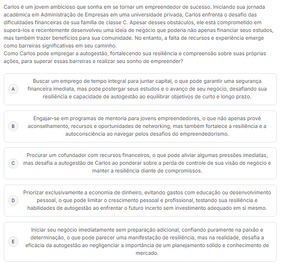 Carlos é um jovem ambicioso que sonha em se tornar um empreendedor de sucesso. Iniciando sua jornada acadêmica em Administração de Empresas em uma universidade privada, Carlos enfrenta desafio das dificuldades financeiras de sua família de classe C. Apesar desses ele está comprometido em superá-los e recentemente desenvolveu uma ideia de negócio que poderia não apenas financiar seus estudos, mas também trazer para sua No entanto, a falta de recursos e experiência emerge como barreiras significativas em seu Como Carlos pode empregar a autogestão, fortalecendo sua resiliência e compreensão sobre suas próprias ações, para superar essas barreiras e realizar seu sonho de empreender? Buscar um emprego de tempo integral para juntar capital, que pode garantir uma segurança A financeira imediata, mas pode postergar seus estudos e avanço de seu negócio, desafiando sua resiliência e capacidade de autogestão ao equilibrar objetivos de curto e longo prazo. Engajar-se em programas de mentoria para jovens empreendedores, que não apenas provê B aconselhamento, recursos e oportunidades de mas também fortalece a resiliência e a autoconsciência ao navegar pelos desafios do empreendedorismo. Procurar um cofundador com recursos financeiros, que pode aliviar algumas pressões imediatas, mas desafia a autogestão de Carlos ao ponderar sobre a perda de controle de sua visão de negócio e manter a resiliência diante de compromissos. Priorizar exclusivamente a economia de dinheiro, evitando gastos com educação ou desenvolvimento D pessoal, que pode limitar crescimento pessoal e profissional, testando sua resiliência e habilidades de autogestão ao enfrentar futuro incerto sem investimento adequado em si mesmo. Iniciar seu negócio imediatamente sem preparação adicional, confiando puramente na paixão e determinação, que pode parecer uma manifestação de resiliência, mas na realidade, desafia a E eficácia da autogestão ao negligenciar a importância de um planejamento sólido e conhecimento de mercado.