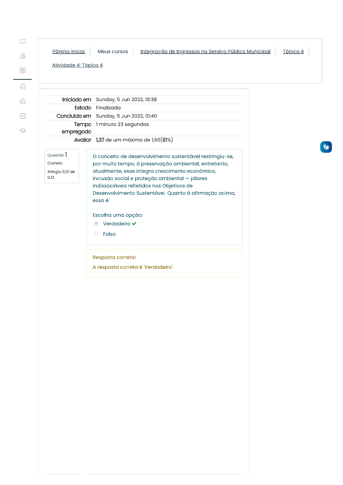 Página inicial Meus cursos Integração de Ingressos no Serviço Público Municipal Tópico 4 Atividade 4: Tópico 4 Iniciado em Sunday, 5 Jun 2022, 10:38 Estado Finalizada Concluída em Sunday, 5 Jun 2022, 10:40 Tempo 1 minuto 23 segundos empregado 1,37 de um máximo de 1,50(91%) Questão 1 conceito de desenvolvimento sustentável restringiu-se, Correto por muito tempo, à preservação ambiental; entretanto, Atingiu 0,12 de atualmente, esse integra crescimento econômico, 0,12 inclusão social e proteção ambiental - pilares indissociáveis refletidos nos Objetivos de Desenvolvimento Sustentável. Quanto à afirmação acima, essa é: Escolha uma opção: Verdadeiro Falso Resposta correta! A resposta correta éQuestão 2 Os Objetivos de Desenvolvimento do Milênio (ODM), Correto adotados em 2000 por meio da Declaração do Milênio Atingiu 0,25 de das Nações Unidas, consistiam em 8 objetivos e 21 metas 0,25 a serem implementadas até 2015, constituindo a primeira grande pactuação global acerca do desenvolvimento e antecedendo os Objetivos de Desenvolvimento Sustentável (ODS). Dessa forma, assingle a alternativa que contém as influências, congruências e divergências dos ODM em comparação ODS Escolha uma: a. Os ODM tiveram impacto negativo na construção dos ODS. Ambos acordos configuram uma pactuação global voltada para o desenvolvimento, norteando a ação governamental em níveis internacionais, com a presença de temas sociais, econômicos e ambientais, bem como voltados países em desenvolvimento. processo de negociação dos ODS contou com a participação da sociedade civil e outros entes, enquanto o dos ODM restringiu-se ao debate entre líderes nacionais e especialistas. b. legado e sucesso dos ODM serviram de base para a formulação dos ODS. Ambos acordos configuram uma pactuação global voltada para o desenvolvimento, norteando a ação governamental em níveis internacionais, nacionais e locais, com a presença de temas sociais. Os ODS, cujo processo de negociação contou com a participação da sociedade civil e outros entes, abrangem temáticas de desenvolvimento social, econômico e ambiental, com alcance mais amplo que as ODM, além de aplicarem- se a todos os países. Resposta correta! C. Os ODM não tiveram nenhum impacto na construção dos ODS. Ambos acordos configuram uma pactuação global voltada para o desenvolvimento, norteando a ação governamental em níveis internacionais, nacionais e locais, com a presença de temas sociais. Os ODM destinavam-se aos países desenvolvidos e abrangiam temáticas de desenvolvimento social, econômico e ambiental, com alcance mais amplo que as ODS. Sua resposta está correta. A resposta correta é: legado e sucesso dos ODM serviram de base para a formulação dos ODS. Ambos acordos configuram uma pactuação global voltada para o desenvolvimento, norteando a ação governamental em níveis internacionais, nacionais e locais, com a presença de temas sociais. Os ODS, cujo processo de negociação contou com a participação da sociedade civil e outros entes, abrangem temáticas de desenvolvimento social, econômico e ambiental, com alcance mais amplo que as ODM, além de aplicarem-se a todos os países.Questão 3 Considerando-se a ênfase dada aos meios de Correto implementação pela Agenda 2030, explique como se dá o Atingiu 0,25 de processo de internalização e interiorização dos ODS. 0,25 Escolha uma: a. Ainda que os países apresentem cenários econômicos, sociais e ambientais diversos, tais especificidades não são suficientes para que necessite-se de um processo de modificação dos ODS. Assim, as metas e objetivos podem ser aplicados ao contexto nacional e local sem demais adequações, criando-se somente os indicadores para acompanhamento do progresso e desempenho dos ODS. b. No processo de implementação dos ODS, guiando-se pelas metas globais contidas na Agenda 2030, cada país deve converter, conforme suas necessidades e particularidades, tais metas em políticas específicas, estabelecendo indicadores e traçando estratégias próprias de concretização segundo o contexto nacional. Em seguida, tais metas nacionais devem ser incorporadas e adaptadas às realidades locais (estaduais e municipais). Esse processo deve contar com mecanismos de disseminação de conhecimento sobre os objetivos e metas, bem como sobre o contexto da região em que serão aplicados, visando capacitar lideranças nacionais e locais, com a disponibilização das ferramentas necessárias e o fomento de parcerias. Resposta correta! C. Os objetivos e metas da Agenda 2030 devem ser importados aos contextos nacional e local exatamente como constam no texto original, já que se adequam perfeitamente a todos os países signatários. Sua resposta está correta. A resposta correta é: No processo de implementação dos ODS, guiando-se pelas metas globais contidas na Agenda 2030, cada país deve converter, conforme suas necessidades e particularidades, tais metas em políticas específicas, estabelecendo indicadores e traçando estratégias próprias de concretização segundo contexto nacional. Em seguida, tais metas nacionais devem ser incorporadas e adaptadas às realidades locais (estaduais e municipais). Esse processo deve contar com mecanismos de disseminação de conhecimento sobre os objetivos e metas, bem como sobre o contexto da região em que serão aplicados, visando capacitar lideranças nacionais e locais, com a disponibilização das ferramentas necessárias e o fomento de parcerias..Questão 4 desenvolvimento sustentável é definido como o Correto desenvolvimento que procura satisfazer as necessidades Atingiu 0,13 de da geração atual, sem comprometer a capacidade das 0,13 futuras gerações de satisfazerem as suas próprias necessidades. Escolha uma opção: Verdadeiro Falso Resposta correta! A resposta correta é Questão 5 Quantos são os Objetivos de Desenvolvimento Correto Sustentável e suas metas? Ating