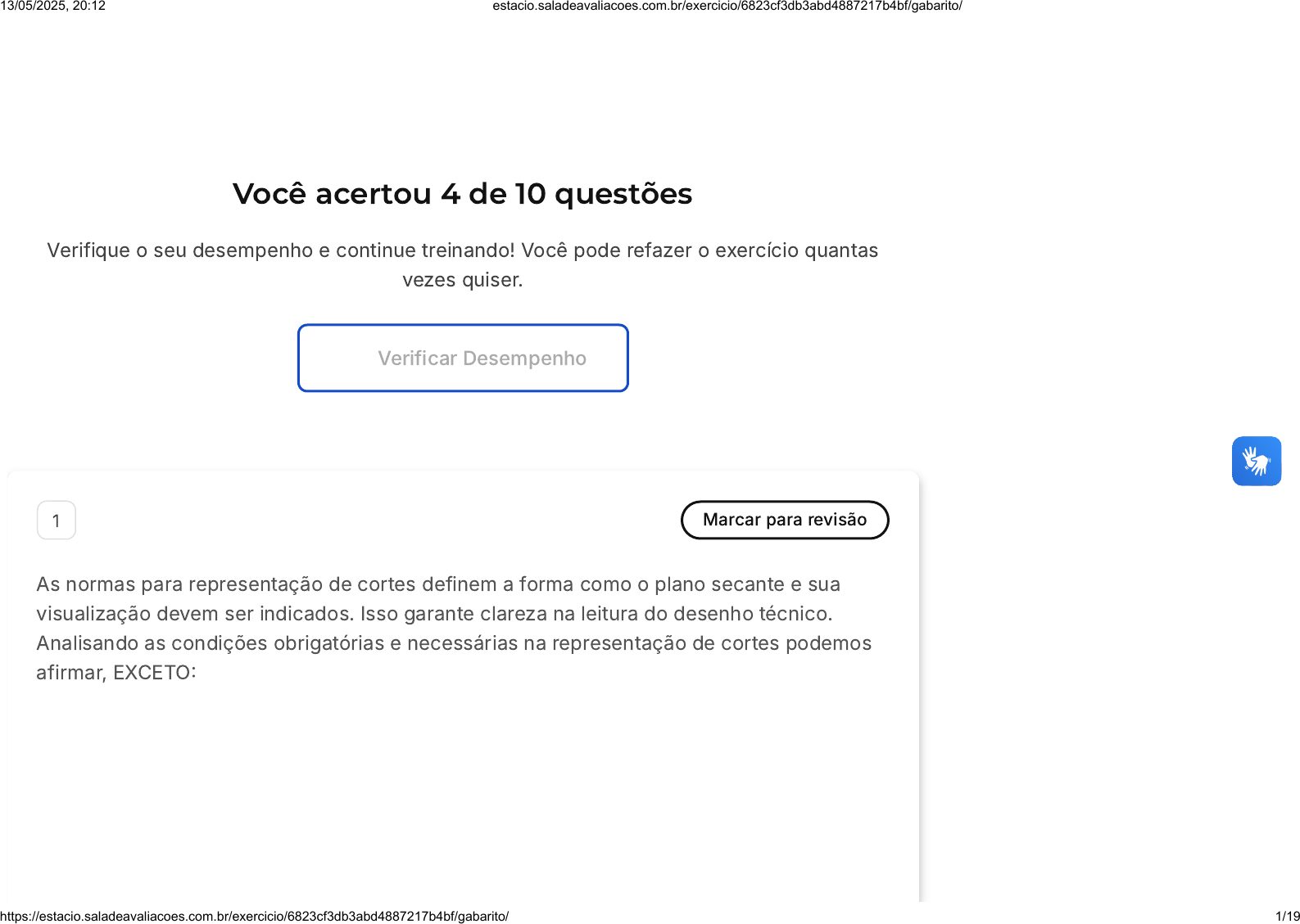 Você acertou 4 de 10 questões Verifique o seu desempenho e continue treinando! Você pode refazer o exercício quantas vezes quiser. Verificar Desempenho 1 Marcar para revisão As normas para representação de cortes definem a forma como o plano secante e sua visualização devem ser indicados. Isso garante clareza na leitura do desenho técnico. Analisando as condições obrigatórias e necessárias na representação de cortes podemos afirmar, EXCETO: 13/05/2025, 20:12 estacio.saladeavaliacoes.com.br/exercicio/6823cf3db3abd4887217b4bf/gabarito/ https://estacio.saladeavaliacoes.com.br/exercicio/6823cf3db3abd4887217b4bf/gabarito/ 1/19 A B C D E A posição do plano secante é indicada com linha mista: traço e pontoestreita com extremos em linha contínua larga. As setas junto das linhas contínuas largas indicam a visualização do observador do corte, que deve ser a mesma posição adotada para a vista ortográfica que está sendo substituída. Abaixo de cada corte deve ser colocada a nomenclatura do corte (por exemplo: CORTE A-A). É indicado apenas um corte por representação, não deve ser usado, por exemplo, corte total e meio corte em duas vistas. Caso existam, as linhas traço e ponto indicativas de linhas de eixo e de centro devem ser posicionadas adequadamente no corte. Resposta correta Parabéns, você selecionou a alternativa correta. Confira o gabarito comentado! Gabarito Comentado As afirmativas I, III, IV e V estão corretas. A posição do plano secante deve ser indicada por linha mista com extremos largos (I), cada corte precisa ser identificado com sua nomenclatura (III), diferentes tipos de corte podem ser usados em conjunto (IV) e linhas de centro devem ser posicionadas adequadamente (V). A afirmativa II está 13/05/2025, 20:12 estacio.saladeavaliacoes.com.br/exercicio/6823cf3db3abd4887217b4bf/gabarito/ https://estacio.saladeavaliacoes.com.br/exercicio/6823cf3db3abd4887217b4bf/gabarito/ 2/19 A B C incorreta porque não há exigência de coincidência obrigatória entre a visualização do observador e uma vista ortográfica específica. 2 Marcar para revisão Analisando as condições obrigatórias e necessárias na representação de cortes, podemos afirmar, EXCETO: A posição do plano secante é indicada com linha mista: traço e ponto fina (estreita) com extremos em linha contínua larga. As setas junto das linhas contínuas grossas indicam a visualização do observador do corte, que deve ser a mesma posição adotada para a vista ortográfica que está sendo substituída. Abaixo de cada corte deve ser colocada a nomenclatura do corte (por exemplo: CORTE A-A). 13/05/2025, 20:12 estacio.saladeavaliacoes.com.br/exercicio/6823cf3db3abd4887217b4bf/gabarito/ https://estacio.saladeavaliacoes.com.br/exercicio/6823cf3db3abd4887217b4bf/gabarito/ 3/19 D E Nas vistas em corte sempre são representadas arestas invisíveis, ou seja, a sobreposição entre hachuras e linhas tracejadas é permitida e recomendada. Caso existam, as linhas traço e ponto indicativas de linhas de eixo e de centro devem ser posicionadas adequadamente no corte. Resposta incorreta Opa! A alternativa correta é a letra D. Confira o gabarito comentado! Gabarito Comentado A alternativa D é a única que não está correta. Nas vistas em corte, não são sempre representadas arestas invisíveis. A sobreposição entre hachuras e linhas tracejadas não é permitida e recomendada. As hachuras representam a superfície de corte e as linhas tracejadas representam arestas e contornos não visíveis. Sua sobreposição pode causar confusão na interpretação do desenho técnico. 3 Marcar para revisão Petrobras (Técnico de Manutenção Júnior – Mecânica – PSP RH 1/2012). A figura representa uma peça em vista isométrica, onde os furos cilíndricos com rebaixo são furos cegos, o rasgo oblongoé passante, e a guia tem seção reta semicircular.As vistas frontal, superior e lateral direita, no primeiro diedro, são: 13/05/2025, 20:12 estacio.saladeavaliacoes.com.br/exercicio/6823cf3db3abd4887217b4bf/gabarito/ https://estacio.saladeavaliacoes.com.br/exercicio/6823cf3db3abd4887217b4bf/gabarito/ 4/19 13/05/2025, 20:12 estacio.saladeavaliacoes.com.br/exercicio/6823cf3db3abd4887217b4bf/gabarito/ https://estacio.saladeavaliacoes.com.br/exercicio/6823cf3db3abd4887217b4bf/gabarito/ 5/19 A B 13/05/2025, 20:12 estacio.saladeavaliacoes.com.br/exercicio/6823cf3db3abd4887217b4bf/gabarito/ https://estacio.saladeavaliacoes.com.br/exercicio/6823cf3db3abd4887217b4bf/gabarito/ 6/19 C D 13/05/2025, 20:12 estacio.saladeavaliacoes.com.br/exercicio/6823cf3db3abd4887217b4bf/gabarito/ https://estacio.saladeavaliacoes.com.br/exercicio/6823cf3db3abd4887217b4bf/gabarito/ 7/19 E Resposta incorreta Opa! A alternativa correta é a letra D. Confira o gabarito comentado! Gabarito Comentado A alternativa correta apresenta corretamente as vistas frontal, superior e lateral direita, conforme o método do primeiro diedro, respeitando a correspondência entre as faces da peça e sua representação gráfica. As demais opções não seguem adequadamente a convenção do primeiro diedro, resultando em incoerência entre as vistas. 4 Marcar para revisão Analise as sentenças a seguir referentes aos conceitos de corte: 13/05/2025, 20:12 estacio.saladeavaliacoes.com.br/exercicio/6823cf3db3abd4887217b4bf/gabarito/ https://estacio.saladeavaliacoes.com.br/exercicio/6823cf3db3abd4887217b4bf/gabarito/ 8/19 A B C D E I. O corte é um recurso de desenho técnico que facilita a representação de objetos com detalhes presentes em seu interior. II. Na vista em corte, o objeto é cortado por um plano secante imaginário e a parte anterior ao plano é vista pelo observador, que muda de posição para olhar o objeto cortado. III. A porção sólida do objeto, cortada pelo plano secante, é indicada na vista em corte pela presença de hachuras, internas às arestas cortadas pelo plano. IV. Existem vários tipos de corte: corte pleno, meio corte, corte e
