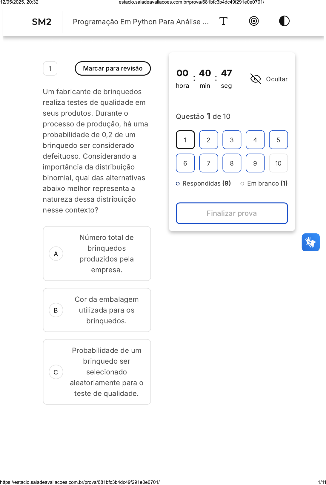 A B C 1 Marcar para revisão Um fabricante de brinquedos realiza testes de qualidade em seus produtos. Durante o processo de produção, há uma probabilidade de 0,2 de um brinquedo ser considerado defeituoso. Considerando a importância da distribuição binomial, qual das alternativas abaixo melhor representa a natureza dessa distribuição nesse contexto? Número total de brinquedos produzidos pela empresa. Cor da embalagem utilizada para os brinquedos. Probabilidade de um brinquedo ser selecionado aleatoriamente para o teste de qualidade. 00 hora : 40 min : 47 seg Ocultar Questão 1 de 10 Respondidas (9) Em branco (1) Finalizar prova 1 2 3 4 5 6 7 8 9 10 SM2 Programação Em Python Para Análise … 12/05/2025, 20:32 estacio.saladeavaliacoes.com.br/prova/681bfc3b4dc49f291e0e0701/ https://estacio.saladeavaliacoes.com.br/prova/681bfc3b4dc49f291e0e0701/ 1/11 D E A B Identificação única de cada brinquedo produzido. Média aritmética da quantidade de brinquedos defeituosos encontrados nos testes. 2 Marcar para revisão Uma empresa de streaming de música realiza uma pesquisa para analisar a preferência musical dos usuários. Considerando a definição de variável aleatória discreta, qual das alternativas abaixo melhor representa a natureza da variável aleatória nesse contexto? Número total de usuários que participaram da pesquisa. Duração das músicas mais reproduzidas pelos usuários. 12/05/2025, 20:32 estacio.saladeavaliacoes.com.br/prova/681bfc3b4dc49f291e0e0701/ https://estacio.saladeavaliacoes.com.br/prova/681bfc3b4dc49f291e0e0701/ 2/11 C D E A B Probabilidade de um usuário preferir um determinado gênero musical. Identificação única de cada usuário participante da pesquisa. Média aritmética das preferências musicais dos usuários. 3 Marcar para revisão Em um experimento de qualidade de produtos eletrônicos, uma empresa selecionou aleatoriamente 10 aparelhos de uma linha de produção que contém 20% de itens defeituosos. A variável aleatória X representa o número de produtos defeituosos encontrados na amostra de 10 aparelhos. Qual é a média aritmética esperada do número de aparelhos defeituosos nessa amostra? 2. 4. 12/05/2025, 20:32 estacio.saladeavaliacoes.com.br/prova/681bfc3b4dc49f291e0e0701/ https://estacio.saladeavaliacoes.com.br/prova/681bfc3b4dc49f291e0e0701/ 3/11 C D E A B 6. 8. 10. 4 Marcar para revisão Em uma pesquisa de opinião, foi questionado a um grupo de pessoas qual a sua preferência de sorvete: chocolate, baunilha, morango ou pistache. Os resultados foram registrados e analisados utilizando a função de massa de probabilidade. Considerando essa situação, qual das alternativas abaixo melhor representa a natureza da função de massa de probabilidade nesse contexto? Número total de pessoas entrevistadas na pesquisa. Cor dos questionários utilizados na coleta de dados. 12/05/2025, 20:32 estacio.saladeavaliacoes.com.br/prova/681bfc3b4dc49f291e0e0701/ https://estacio.saladeavaliacoes.com.br/prova/681bfc3b4dc49f291e0e0701/ 4/11 C D E A B Probabilidade de uma pessoa preferir um sabor específico de sorvete. Identificação única de cada pessoa que participou da pesquisa. Média aritmética das preferências de sorvete registradas na pesquisa. 5 Marcar para revisão Um fabricante de smartphones deseja analisar a vida útil de suas baterias em horas de uso. Para isso, coletou dados sobre o tempo de duração das baterias de uma amostra de smartphones. Qual das alternativas abaixo melhor representa a natureza da esperança matemática nesse contexto? Número total de smartphones na amostra. Marca e modelo de cada smartphone. 12/05/2025, 20:32 estacio.saladeavaliacoes.com.br/prova/681bfc3b4dc49f291e0e0701/ https://estacio.saladeavaliacoes.com.br/prova/681bfc3b4dc49f291e0e0701/ 5/11 C D E Porcentagem de carga da bateria no momento da medição. Tempo exato de duração de uma bateria selecionada ao acaso. Média aritmética dos tempos de duração das baterias da amostra. 6 Marcar para revisão Em um experimento sobre a altura de uma população de árvores em uma floresta, um pesquisador mediu as alturas das árvores selecionadas aleatoriamente. Ele registrou os valores em metros. Considerando que a altura das árvores pode variar de forma contínua, qual das alternativas abaixo melhor representa a natureza da variável aleatória nesse experimento? 12/05/2025, 20:32 estacio.saladeavaliacoes.com.br/prova/681bfc3b4dc49f291e0e0701/ https://estacio.saladeavaliacoes.com.br/prova/681bfc3b4dc49f291e0e0701/ 6/11 A B C D E Número de árvores com altura superior a 10 metros. Tipo de árvore (pinheiro, carvalho, eucalipto, etc.). Intervalo de tempo entre o nascimento de duas árvores consecutivas. Quantidade de ramos presentes em cada árvore. Altura exata de uma árvore selecionada ao acaso. 7 Marcar para revisão Seja X uma variável aleatória que representa o preço, em reais, do litro da gasolina, com função de distribuição acumulada dada por: A probabilidade de que X seja maior do que R$ 2,50 é: F(x) = 0, se, X ≤ 2 F(x) = , se 2 31 x2 12/05/2025, 20:32 estacio.saladeavaliacoes.com.br/prova/681bfc3b4dc49f291e0e0701/ https://estacio.saladeavaliacoes.com.br/prova/681bfc3b4dc49f291e0e0701/ 7/11 A B C D E 0,45 0,50 0,55 0,60 0,69 8 Marcar para revisão A PMC- Pesquisa mensal do comércio, divulga todos os meses o valor comercializado por atividade. Suponha que temos os seguintes dados sobre as vendas no comércio por atividade para um determinado mês: Eletrônico: R$ 20.000,00 Roupas: R$ 12.000,00 Alimentos: R$ 8.000,00 Outros: R$ 5.000,00 Qual é o código do Python para gerar um gráfico de setores (ou pizza) mostrando a proporção de vendas de cada atividade? 12/05/2025, 20:32 estacio.saladeavaliacoes.com.br/prova/681bfc3b4dc49f291e0e0701/ https://estacio.saladeavaliacoes.com.br/prova/681bfc3b4dc49f291e0e0701/ 8/11 A B C D E 9 Marcar para revisão O Prêmio de seguro é calculado a partir de todo gasto da seguradora. Uma seguradora de