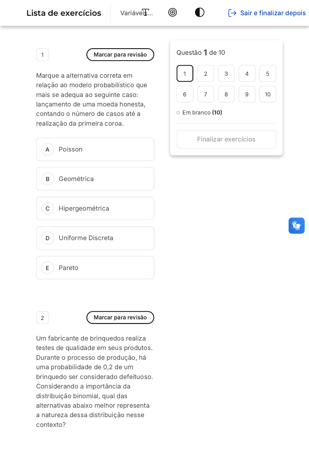 A B C D E 1 Marcar para revisão Marque a alternativa correta em relação ao modelo probabilístico que mais se adequa ao seguinte caso: lançamento de uma moeda honesta, contando o número de casos até a realização da primeira coroa. Poisson Geométrica Hipergeométrica Uniforme Discreta Pareto 2 Marcar para revisão Um fabricante de brinquedos realiza testes de qualidade em seus produtos. Durante o processo de produção, há uma probabilidade de 0,2 de um brinquedo ser considerado defeituoso. Considerando a importância da distribuição binomial, qual das alternativas abaixo melhor representa a natureza dessa distribuição nesse contexto? Questão 1 de 10 Em branco (10) 1 2 3 4 5 6 7 8 9 10 Finalizar exercícios Lista de exercícios Variáveis… Sair e finalizar depois A B C D E Número total de brinquedos produzidos pela empresa. Cor da embalagem utilizada para os brinquedos. Probabilidade de um brinquedo ser selecionado aleatoriamente para o teste de qualidade. Identificação única de cada brinquedo produzido. Média aritmética da quantidade de brinquedos defeituosos encontrados nos testes. 3 Marcar para revisão Uma empresa de delivery de pizzas recebe uma média de 4 pedidos por hora durante a noite. A empresa está interessada em analisar a ocorrência de um determinado evento: o número de pedidos recebidos em um intervalo contínuo de 2 horas. Qual das seguintes afirmações sobre a distribuição de Poisson é correta para esse contexto? A B C D E A média e a variância do número de pedidos recebidos em 2 horas são iguais a 4. A distribuição de Poisson é adequada para modelar o número de pedidos recebidos em um intervalo contínuo de tempo. O parâmetro λ, que representa a taxa média de ocorrência de eventos, é igual a 8. Os eventos de pedidos são dependentes entre si. A distribuição de Poisson é aplicada somente a eventos frequentes. 4 Marcar para revisão Um empresário, investindo em um determinado empreendimento, espera ter os seguintes lucros em função dos cenários "Bom", "Médio" e "Ruim": A expectância e a variância do respectivo lucro são, em R ) , respectivamente: e(R 2 A B C D E A B C D E 5.500,00 e 3.160.000 5.300,00 e 3.510.000 5.300,00 e 3.160.000 5.000,00 e 3.510.000 5.000,00 e 3.160.000 5 Marcar para revisão Um estudante marca, ao acaso, as respostas de um teste de 10 questões de múltipla escolha, com 4 alternativas por questão. O número mais provável de acertos é: 1. 2. 3. 4. 5. A B C D E 6 Marcar para revisão Em uma urna contendo 30 bolas, sendo 10 vermelhas e 20 azuis, deseja-se retirar uma amostra de 5 bolas sem reposição. Considerando a distribuição hipergeométrica, qual das alternativas abaixo melhor representa a natureza da variável aleatória X nesse contexto? Número total de bolas na urna. Cor das bolas na amostra selecionada. Probabilidade de uma bola vermelha ser selecionada na amostra. Identificação única de cada bola na urna. Média aritmética do número de bolas vermelhas na amostra. 7 Marcar para revisão Um jogador de basquete está prestes a realizar um lance livre. Em cada lance, ele pode acertar a cesta ou errar. Considerando a distribuição de Bernoulli, qual das alternativas abaixo melhor representa a natureza da variável aleatória X nesse contexto? A B C D E A B C Número total de lances livres feitos pelo jogador. Cor do uniforme utilizado pelo jogador. Probabilidade de o jogador acertar um lance livre específico. Identificação única de cada lance livre realizado. Média aritmética das cestas convertidas pelo jogador. 8 Marcar para revisão A entrada de clientes em uma loja segue um processo de Poisson homogêneo com intensidade λ por hora. Considerando que, em um determinado dia, chegaram 8 clientes em um período de 8 horas, qual é a probabilidade de que tenham chegado exatamente 5 clientes nas primeiras 4 horas? (128/3) × e−4 70 × (1/3)4 × (2/3)4 (125/24) × e−4 D E A B C D E (256/30) × e−4 3003 × (1/2)15 9 Marcar para revisão Em um experimento de qualidade de produtos eletrônicos, uma empresa selecionou aleatoriamente 10 aparelhos de uma linha de produção que contém 20% de itens defeituosos. A variável aleatória X representa o número de produtos defeituosos encontrados na amostra de 10 aparelhos. Qual é a média aritmética esperada do número de aparelhos defeituosos nessa amostra? 2. 4. 6. 8. 10. 10 Marcar para revisão Em uma pesquisa de opinião, foi questionado a um grupo de pessoas qual a sua preferência de sorvete: A B C D E chocolate, baunilha, morango ou pistache. Os resultados foram registrados e analisados utilizando a função de massa de probabilidade. Considerando essa situação, qual das alternativas abaixo melhor representa a natureza da função de massa de probabilidade nesse contexto? Número total de pessoas entrevistadas na pesquisa. Cor dos questionários utilizados na coleta de dados. Probabilidade de uma pessoa preferir um sabor específico de sorvete. Identificação única de cada pessoa que participou da pesquisa. Média aritmética das preferências de sorvete registradas na pesquisa.