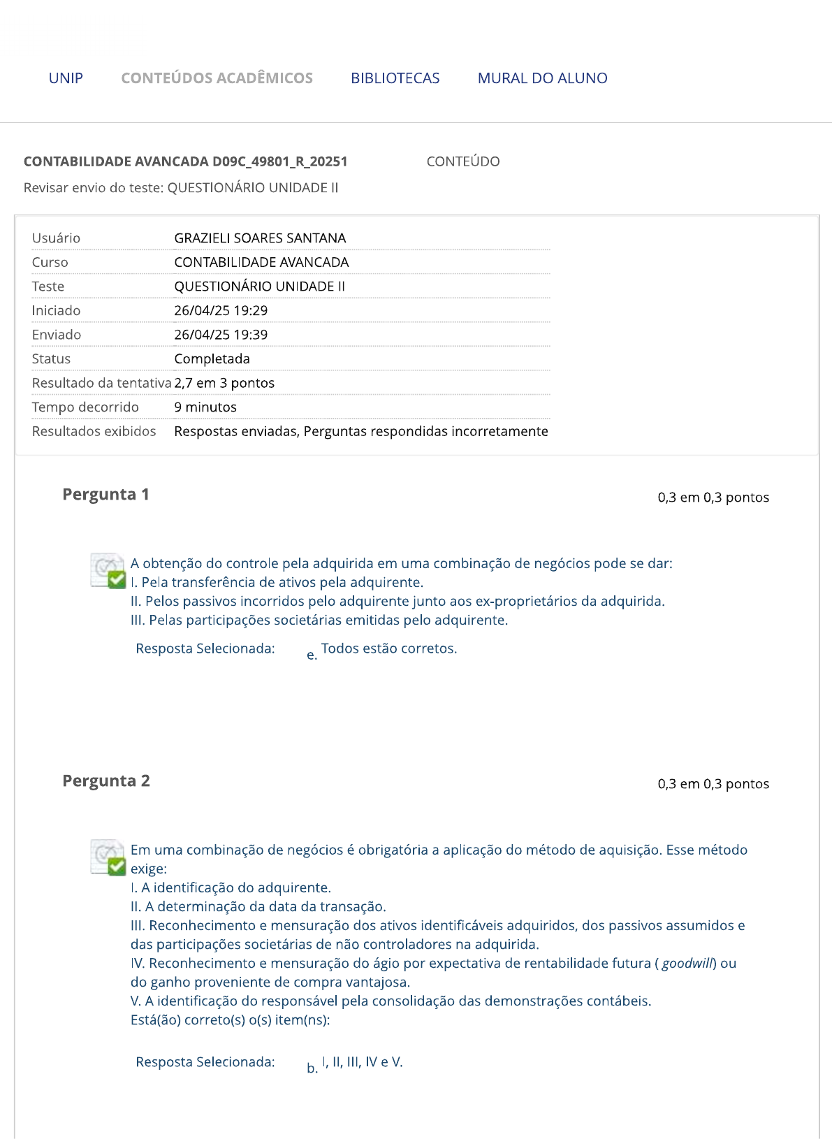 UNIP CONTEÚDOS ACADÊMICOS BIBLIOTECAS MURAL DO ALUNO CONTABILIDADE AVANCADA D09C_49801_R_20251 CONTEÚDO Revisar envio do teste: QUESTIONÁRIO UNIDADE Usuário GRAZIELI SOARES SANTANA Curso CONTABILIDADE AVANCADA Teste QUESTIONÁRIO UNIDADE Iniciado 26/04/25 19:29 Enviado 26/04/25 19:39 Status Completada Resultado da tentativa 2,7 em 3 pontos Tempo decorrido 9 minutos Resultados exibidos Respostas enviadas, Perguntas respondidas incorretamente Pergunta 1 0,3 em 0,3 pontos A obtenção do controle pela adquirida em uma combinação de negócios pode se dar: I. Pela transferência de ativos pela adquirente. II. Pelos passivos incorridos pelo adquirente junto aos ex-proprietários da adquirida. III. Pelas participações societárias emitidas pelo adquirente. Resposta Selecionada: Todos estão corretos. e. Pergunta 2 0,3 em 0,3 pontos Em uma combinação de negócios é obrigatória a aplicação do método de aquisição. Esse método exige: I. A identificação do adquirente. II. A determinação da data da transação. III. Reconhecimento e mensuração dos ativos identificáveis adquiridos, dos passivos assumidos e das participações societárias de não controladores na adquirida. IV. Reconhecimento e mensuração do ágio por expectativa de rentabilidade futura ( goodwill) ou do ganho proveniente de compra vantajosa. V. A identificação do responsável pela consolidação das demonstrações contábeis. Está(ão) correto(s) o(s) item(ns): Resposta Selecionada: b. I, II, III, IV e V.Pergunta 3 0,3 em 0,3 pontos A sociedade investidora A adquiriu 100% do capital da sociedade investida B por R$ 1.000.000,00 pagos em dinheiro. Na data da aquisição, o valor líquido dos ativos identificáveis adquiridos e dos passivos assumidos da sociedade investida B, mensurados de acordo com a NBC TG 15 (R1) combinações de negócios, somava R$ 900.000,00. Na mesma data, o saldo contábil do patrimônio líquido da sociedade investida B era de Como resultado dessa combinação de negócios, a sociedade investidora A deverá registrar: Resposta a. Selecionada: Um ágio por expectativa de rentabilidade futura goodwill de R$ 100.000,00 em conta do ativo não circulante. Pergunta 4 0 em 0,3 pontos Observe com atenção o Balanço Patrimonial das empresas A e B antes da incorporação: BP A B Outros ativos 2.000 800 Investimentos 3.500 1.000 Equipamentos 2.500 3.000 Total 8.000 4.800 Outros passivos 1.000 1.000 Capital 5.000 3.000 Reserva de lucros 2.000 800 Nessa operação, a empresa A incorpora a B e a incorporada deixa de existir. Como essa operação não mudou o controle acionário de nenhuma das duas empresas, não é preciso ajustar os ativos pelo seu valor justo, basta somar os balanços. aumento do capital social da incorporadora corresponde ao valor do patrimônio líquido da incorporada. Acerca da contabilização, os lançamentos a serem realizados na incorporadora são: Resposta a. Selecionada: ativos: 4.000 a incorporação: 4.000; incorporação: 1.100 a passivos: 1.100; incorporação: 3.810 a capital social: 3.810. Pergunta 5 0,3 em 0,3 pontos Uma sociedade empresária adquiriu o controle de duas outras sociedades durante o ano de 2013. Na aquisição do controle da sociedade A, foi apurado um ágio por expectativa de rentabilidade futura goodwill no valor de R$ 2.000.000,00. Na aquisição do controle dasociedade B, foi apurada uma compra vantajosa no valor de R$ 200.000,00. O registro contábil dos valores apurados irá gerar: Resposta a. Selecionada: Um aumento de R$ 2.000.000,00 no ativo não circulante e um aumento de R$ 200.000,00 no resultado do período. Pergunta 6 0,3 em 0,3 pontos Entende-se por fusão de empresas: Resposta d. Selecionada: A operação em que se unem duas ou mais empresas para formar uma nova sociedade, que lhes sucederá em todos os direitos e as obrigações. Pergunta 7 0,3 em 0,3 pontos Assinale a alternativa verdadeira: Resposta C. Selecionada: Entende-se por cisão total de empresas a operação em que a sociedade transfere a totalidade de seus bens, direitos e obrigações para uma ou mais empresas, que lhes sucederá em todos os direitos e as obrigações. Pergunta 8 0,3 em 0,3 pontos Nas operações de cisão, podem ocorrer as seguintes situações, exceto: Resposta d. Selecionada: Cisão parcial com versão de todo o patrimônio para a mesma sociedade. Pergunta 9 0,3 em 0,3 pontos O patrimônio da empresa A é transferido para a empresa B. A empresa A é encerrada. Trata-se de um processo de:Resposta Selecionada: b. Incorporação. Pergunta 10 0,3 em 0,3 pontos A empresa B tem em seu Patrimônio Líquido: Capital social de R$ 3.000 e Reserva de Lucros de R$ 800. A empresa A fundiu-se com a empresa B. A empresa A possui 70% do capital de B; a operação não mudou o controle acionário das entidades. Nessa operação, as empresas A e B deixam de existir, e surge uma nova empresa, denominada C. Como a empresa A tem o controle acionário da empresa B, é necessário fazer a eliminação dos investimentos da empresa A e do patrimônio líquido da B. Assim os valores a serem eliminados do Patrimônio Líquido de B são: Resposta Selecionada: b. Capital Social = R$ 2.100 e Reserva de Lucros = R$ 560. Terça-feira, 13 de Maio de 2025 21h46min42s BRT OK