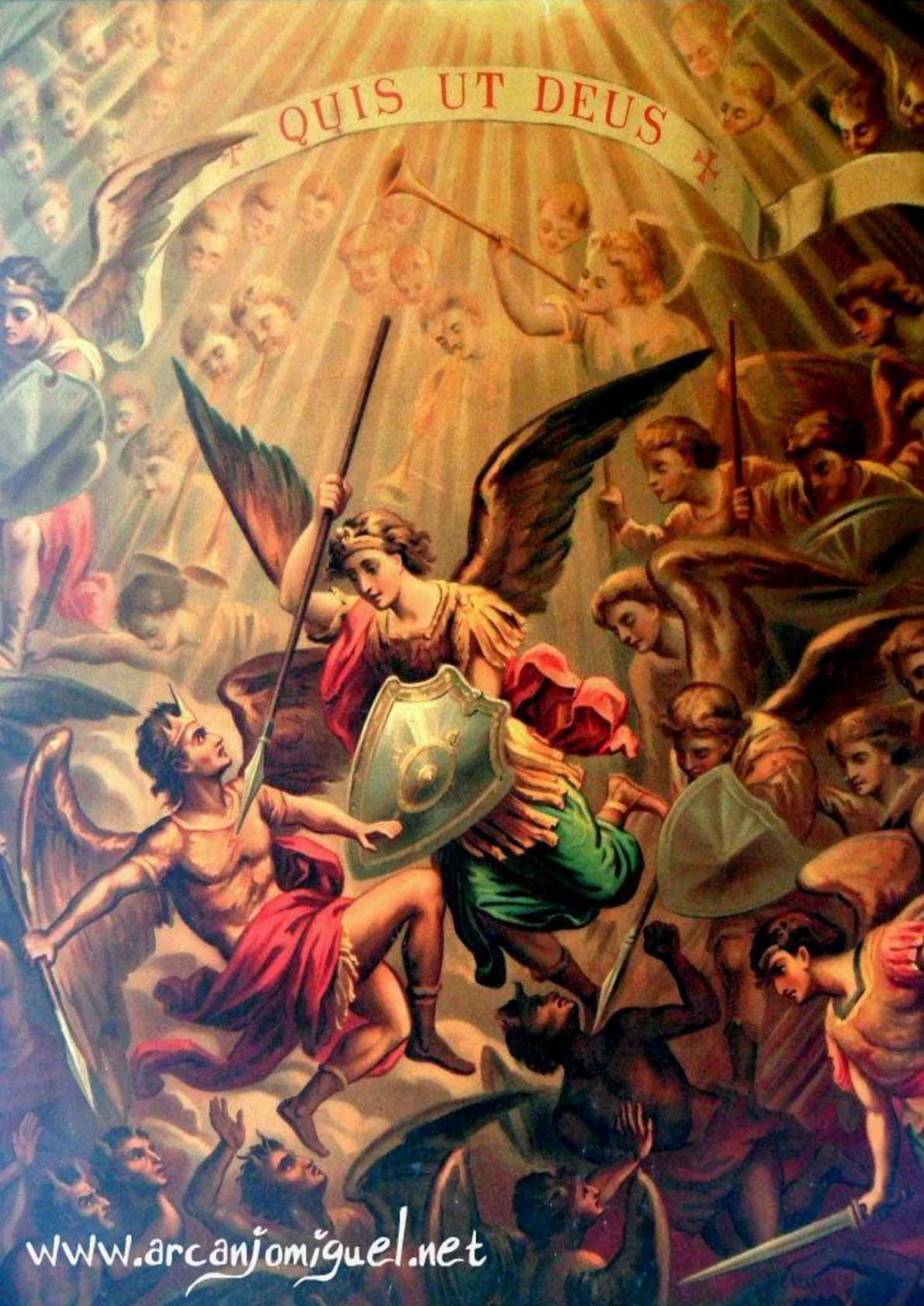 Da preparação do lugar Materiais: Toalha Vermelha; Imagem ou Quadro de São Miguel Arcanjo; Dois castiçais; Duas velas brancas abençoadas; Ornamento com flores; Caixa para as intenções da Quaresma; Preparar um pequeno altar com toalha vermelha e sobre ela colocar a imagem ou o quadro de São Miguel. Desse modo coloque os dois castiçais com duas velas brancas abençoadas. Ornamente com flores e caso seja oportuno coloque também uma caixinha contendo as intenções pelas quais será feita a Quaresma. Das orações a serem feitas por toda Quaresma Sinal da Cruz; Credo; Pai-Nosso; Ave-Maria; São Miguel Arcanjo, defendei-nos no Combate, cobri-nos com o vosso escudo contra os embustes e ciladas do demônio. Subjugue-o Deus, instantemente o pedimos, e vós, Príncipe da Milícia Celeste, pelo Divino Poder, precipitai no inferno a Satanás e a todos os espíritos malignos que andam pelo mundo para perder as almas. Amém! Sancte Michael Archangele, defende nos in praelio; contra nequitiam et insidias diaboli esto praesidium. Imperet illi Deus, supplices deprecamur: tuque, Princeps militiae caelestis, Satanam aliosque spiritus malignos, qui ad perditionem animarum pervagantur in mundo, divina virtute in infernum detrude. Amen. 1. Primeira Súplica Ó Glorioso Príncipe dos Exércitos Angelicais suplicantes te pedimos, vinde com toda a Corte Celestial ajudar-nos a desmascarar todas as estratégias que o inimigo e o seu maléfico séquito de seguidores têm tramado contra os Filhos da Luz. Rezar: 1 Pai- Nosso; 3 Ave-Marias; 1 Glória ao Pai em cada súplica; 2. Segunda Súplica Ó Glorioso Guardião da Igreja Militante suplicantes te pedimos, guardai incólume a Santa Mãe Igreja da mão de todos os seus perseguidores e fazei que se cumpram todos os dias as promessas saída dos lábios de seu Esposo muito Amado de que as portas do inferno não prevaleceriam contra ela. 3. Terceira Súplica Ó Glorioso Socorro da Igreja Padecente suplicantes te pedimos, introduzi na Mansão Celestial todas as almas que padecem agonizantes no Purgatório e apressai-vos a vir em nosso socorro quando chegar a nossa hora. 4. Quarta Súplica Ó Glorioso Adorador de Deus vós que recebestes a incumbência de presidir o Culto de Adorador que a Ele é prestado no Céu, suplicantes te pedimos levantai um Exército de almas adoradoras na terra abrasadas de amor por Jesus Eucarístico. 5. Quinta Súplica Ó Glorioso General da Milícia Celeste suplicantes te pedimos, extirpai de nós todo orgulho para que não nos suceda o mesmo que a Lúcifer que fora expulso da presença do Senhor. 6. Sexta Súplica Ó Glorioso Guerreiro do Altíssimo suplicantes te pedimos, não permitais que sejamos contaminados por um espírito de revolta contra Deus e contra a Santa Mãe Igreja. 7. Sétima Súplica Ó Glorioso Vencedor das hostes infernais suplicantes te pedimos, assim como vencestes a Satanás e a toda legião de anjos descaídos, vinde em nosso auxilio a fim de que também nós alcancemos a coroa da vitória. 8. Oitava Súplica Ó Glorioso Defensor dos que combatem suplicantes te pedimos, defendei-nos no combate contra o inimigo, contras as forças que no mundo querem nos afastar de Deus e contra nós mesmos. 9. Nona Súplica Ó Glorioso Modelo de Obediência suplicantes te pedimos, tornai-nos submissos a vontade de Deus ajudando-nos a cumpri-la mesmo quando nossa humanidade relutar a aceitá-la. - Quem como Deus? R. Ninguém como Deus! - Quem como Deus? R. Ninguém como Deus! - Quem como Deus? R. Ninguém como Deus! Oração (Oremos) Ó Glorioso São Miguel, Príncipe das Hostes Divinas, Santo defensor do Povo de Deus; Vencedor do dragão e que agora defende vigilantemente a Igreja de Deus contras as portas do inferno, instantemente vos pedimos: ajudai-nos no doloroso combate que temos que travar contra o mesmo inimigo que derrotastes. Ficai conosco, ó Príncipe Poderoso para que possamos lutar corajosamente e derrotar Satanás e com vosso auxílio alcançar o prêmio das Bem-aventuranças. Amém! Litania de São Miguel Arcanjo Senhor, tende piedade de nós. Jesus Cristo, tende piedade de nós. Senhor, tende piedade de nós. Jesus Cristo, ouvi-nos. Jesus Cristo, atendei-nos. Pai Celeste, que sois Deus, tende piedade de nós. Filho, Redentor do Mundo, que sois Deus, tende piedade de nós. Espírito Santo, que sois Deus, tende piedade de nós. Trindade Santa, que sois um único Deus, tende piedade de nós. Santa Maria, Rainha dos Anjos, rogai por nós. São Miguel, rogai por nós. São Miguel, cheio da graça de Deus, São Miguel, perfeito adorador do Verbo Divino, São Miguel, coroado de honra e de glória, São Miguel, poderosíssimo Príncipe dos exércitos do Senhor, São Miguel, porta estandarte da Santíssima Trindade, São Miguel, Guardião do Paraíso, São Miguel, guia e consolador do povo israelita, São Miguel, esplendor e fortaleza da Igreja Militante, São Miguel, honra e alegria da Igreja Triunfante, São Miguel, Luz dos Anjos, São Miguel, baluarte da verdadeira fé, São Miguel, força daqueles que combatem pelo estandarte da Cruz, São Miguel, luz e confiança das almas no último momento da vida, São Miguel, socorro muito certo, São Miguel, nosso auxílio em todas as adversidades, São Miguel, mensageiro da sentença eterna, São Miguel, consolador das almas que estão no Purgatório, vós a quem o Senhor incumbiu de receber as almas que estão no Purgatório, São Miguel, nosso Príncipe, São Miguel, nosso Advogado, Cordeiro de Deus, que tirais o pecado do mundo, perdoai-nos, Senhor. Cordeiro de Deus, que tirais o pecado do mundo, atendei-nos, Senhor. Cordeiro de Deus, que tirais o pecado do mundo, tende piedade de nós. Rogai por nós, ó Glorioso São Miguel para que sejamos dignos das promessas de Jesus Cristo. Oremos Senhor Jesus Cristo, santificai-nos por uma bênção sempre nova e concedei-nos, pela intercessão de São Miguel, a sabedoria que nos ensina a ajuntar riquezas no Céu e a trocar os bens