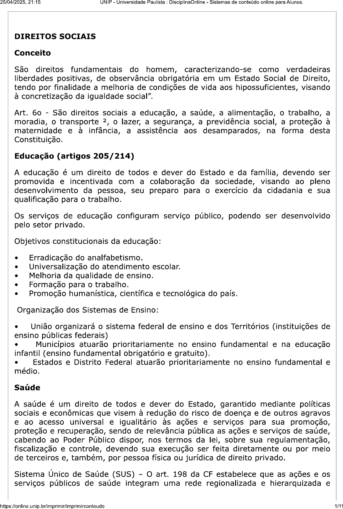 25/04/2025, 21:15 UNIP Universidade Paulista DisciplinaOnline Sistemas de conteúdo online para Alunos. DIREITOS SOCIAIS Conceito São direitos fundamentais do homem, caracterizando-se como verdadeiras liberdades positivas, de observância obrigatória em um Estado Social de Direito, tendo por finalidade a melhoria de condições de vida aos hipossuficientes, visando à concretização da igualdade social". Art. São direitos sociais a educação, a saúde, a alimentação, o trabalho, a moradia, o transporte o lazer, a segurança, a previdência social, a proteção à maternidade e à infância, a assistência aos desamparados, na forma desta Constituição. Educação (artigos 205/214) A educação é um direito de todos e dever do Estado e da família, devendo ser promovida e incentivada com a colaboração da sociedade, visando ao pleno desenvolvimento da pessoa, seu preparo para o exercício da cidadania e sua qualificação para o trabalho. Os serviços de educação configuram serviço público, podendo ser desenvolvido pelo setor privado. Objetivos constitucionais da educação: Erradicação do analfabetismo. Universalização do atendimento escolar. Melhoria da qualidade de ensino. Formação para o trabalho. Promoção humanística, científica e tecnológica do país. Organização dos Sistemas de Ensino: União organizará o sistema federal de ensino e dos Territórios (instituições de ensino públicas federais) Municípios atuarão prioritariamente no ensino fundamental e na educação infantil (ensino fundamental obrigatório e gratuito). Estados e Distrito Federal atuarão prioritariamente no ensino fundamental e médio. Saúde A saúde é um direito de todos e dever do Estado, garantido mediante políticas sociais e econômicas que visem à redução do risco de doença e de outros agravos e ao acesso universal e igualitário às ações e serviços para sua promoção, proteção e recuperação, sendo de relevância pública as ações e serviços de saúde, cabendo ao Poder Público dispor, nos termos da lei, sobre sua regulamentação, fiscalização e controle, devendo sua execução ser feita diretamente ou por meio de terceiros e, também, por pessoa física ou jurídica de direito privado. Sistema Único de Saúde (SUS) O art. 198 da CF estabelece que as ações e os serviços públicos de saúde integram uma rede regionalizada e hierarquizada e https://online.unip.br/imprimir/imprimirconteudo 1/1125/04/2025, 21:15 UNIP Universidade Paulista DisciplinaOnline Sistemas de conteúdo online para Alunos. constituem um sistema único, organizado, com atribuições, controle e fiscalização dos serviços de saúde. Alimentação Decorrente do direito humano à alimentação adequada. Deve o Poder Público adotar as políticas e ações que se façam necessárias para promover e garantir a segurança alimentar e nutricional da população. Trabalhadores legislador constituinte definiu o trabalhador subordinado como sendo o empregado, ou seja, aquele que tiver algum vínculo empregatício, no entanto, a CF será aplicada aos demais trabalhadores nela expressamente indicados. As normas relativas aos direitos sociais previstos constitucionalmente são normas de ordem pública, e, portanto, invioláveis pela vontade das partes contraentes da relação trabalhista. Rol dos direitos sociais - No art. da CF foram definidos alguns direitos dos trabalhadores urbanos e rurais, além de outros que visem à melhoria de sua condição social. Trata-se de rol exemplificativo, de forma que os direitos previstos não esgotam os direitos fundamentais que se encontram no corpo da CF/88. Dentre eles destacam-se: proteção contra despedida arbitrária ou sem justa causa; FGTS; irredutibilidade de salário; salário mínimo; 13° salário; remuneração do trabalho noturno superior à do diurno; jornada de trabalho; horas extras; repouso semanal remunerado; férias anuais remuneradas com mais 1/3; licença maternidade, aviso prévio, inclusive direito de greve. Direito à Moradia De acordo com o artigo 23, IX da CF: "É competência comum da União, dos Estados, do Distrito Federal e dos Municípios: IX promover programas de construção de moradias e a melhoria das condições habitacionais e de saneamento básico. Decorre do princípio da dignidade humana (art. 1°, III), compreendendo os artigos 5°, X, direito à intimidade e à privacidade e de ser a casa asilo inviolável (art. 5°, XI). Lazer Artigo 217, parágrafo terceiro da CF: "O Poder Público incentivará o lazer, como forma de promoção social" lazer se apresenta como prestação estatal que interfere nas condições de trabalho e qualidade de vida, em estreita correlação com o direito ao meio ambiente equilibrado (art. 225). Segurança No artigo o conceito de segurança aparece como Segurança Pública, dever do Estado, direito e responsabilidade de todos, sendo exercido para a preservação da ordem pública e da incolumidade das pessoas e do patrimônio. Os órgãos da Segurança Pública estão previstos no artigo 144 da CF (Polícia Federal, Polícia Rodoviária Federal, Polícia Ferroviária Federal, Polícias Civis, Polícias Militares e Corpos de Bombeiros militares). https://online.unip.br/imprimir/imprimirconteudo 2/1125/04/2025, 21:15 UNIP Universidade Paulista : DisciplinaOnline Sistemas de conteúdo online para Alunos. Previdência Social Refere-se aos direitos relativos à Seguridade Social financiados pelo INSS. Organizada sob a forma de regime geral, de caráter contributivo e de filiação obrigatória, atendendo aos seguintes preceitos: Cobertura dos eventos de doença, invalidez, morte e idade avançada. Proteção à maternidade, especialmente à gestante. Proteção ao Trabalhador em situação de desemprego involuntário. Salário-família e auxílio-reclusão para os dependentes dos segurados de baixa renda. Pensão por morte do segurado, homem ou mulher, ao cônjuge ou companheiro e dependentes. 