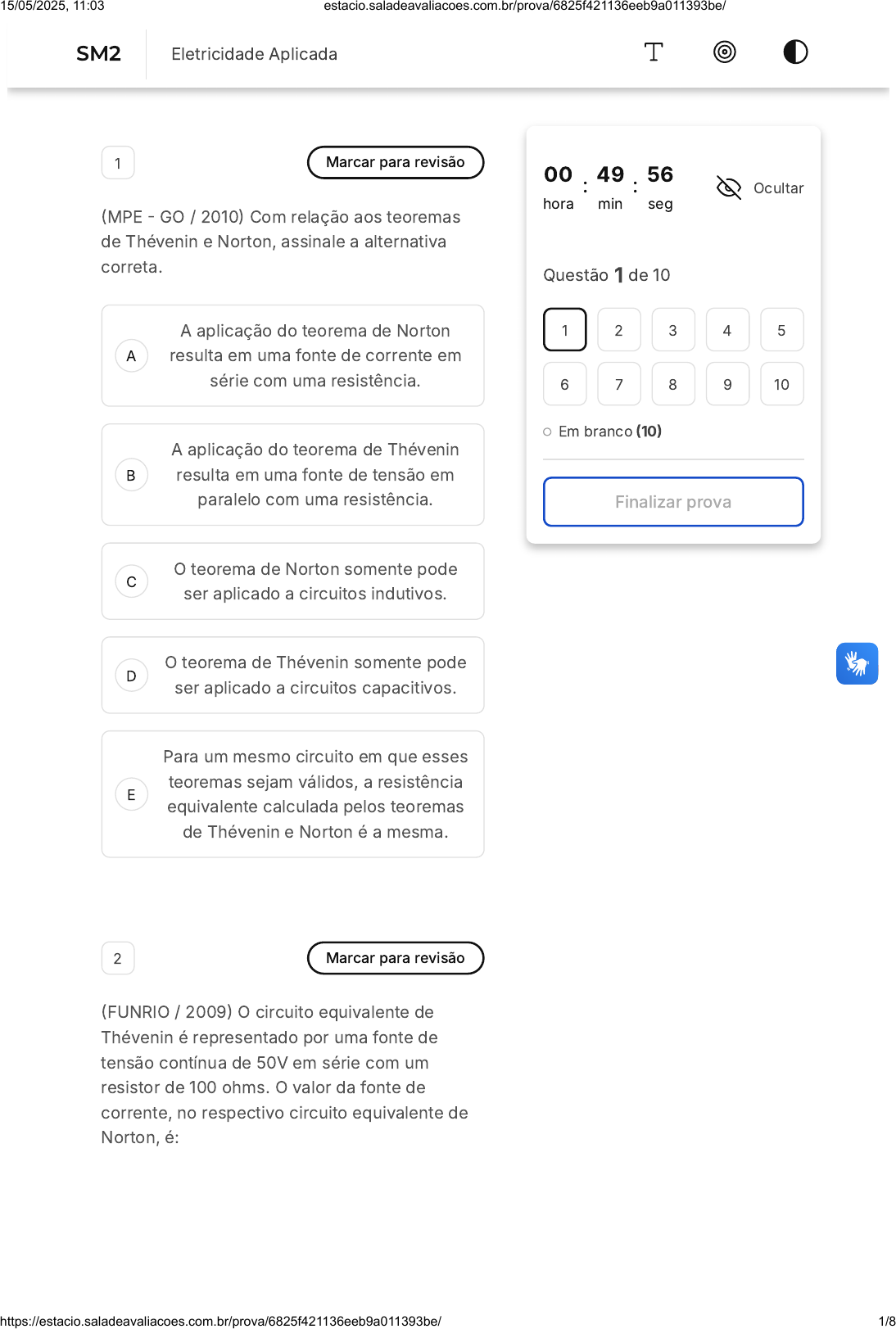 A B C D E 1 Marcar para revisão (MPE - GO / 2010) Com relação aos teoremas de Thévenin e Norton, assinale a alternativa correta. A aplicação do teorema de Norton resulta em uma fonte de corrente em série com uma resistência. A aplicação do teorema de Thévenin resulta em uma fonte de tensão em paralelo com uma resistência. O teorema de Norton somente pode ser aplicado a circuitos indutivos. O teorema de Thévenin somente pode ser aplicado a circuitos capacitivos. Para um mesmo circuito em que esses teoremas sejam válidos, a resistência equivalente calculada pelos teoremas de Thévenin e Norton é a mesma. 2 Marcar para revisão (FUNRIO / 2009) O circuito equivalente de Thévenin é representado por uma fonte de tensão contínua de 50V em série com um resistor de 100 ohms. O valor da fonte de corrente, no respectivo circuito equivalente de Norton, é: 00 hora : 49 min : 56 seg Ocultar Questão 1 de 10 Em branco (10) Finalizar prova 1 2 3 4 5 6 7 8 9 10 SM2 Eletricidade Aplicada 15/05/2025, 11:03 estacio.saladeavaliacoes.com.br/prova/6825f421136eeb9a011393be/ https://estacio.saladeavaliacoes.com.br/prova/6825f421136eeb9a011393be/ 1/8 A B C D E A B C D E 0,25A 0,50A 0,75A 1,00A 1,50A 3 Marcar para revisão (TELEBRAS / 2013) Para a figura abaixo apresentada, determine a tensão equivalente de Thévenin vista dos pontos C-D do circuito e assinale a alternativa correta. 30V 35V 35,5V 37V 37,5V 15/05/2025, 11:03 estacio.saladeavaliacoes.com.br/prova/6825f421136eeb9a011393be/ https://estacio.saladeavaliacoes.com.br/prova/6825f421136eeb9a011393be/ 2/8 A B C D E 4 Marcar para revisão (IADES - AL - GO / 2019) O teorema de Thévenin é amplamente utilizado para simplificar a análise de circuitos. Com base no circuito elétrico da figura apresentada, deseja- se determinar o circuito equivalente de Thévenin entre os terminais A e B. Se VTh é a tensão equivalente de Thévenin e RTh é a resistência equivalente de Thévenin, então: Figura A: Complementar ao exercício VTh = 10V e RTh = 1Ω. VTh = 10V e RTh = 2Ω. VTh = 10V e RTh = 3Ω. VTh = 30V e RTh = 1Ω. VTh = 30V e RTh = 3Ω. 5 Marcar para revisão O circuito ilustrado na Figura 49 apresenta arranjos de resistores que podem ser convertidos considerando as transformações estrela e triângulo. Com base nessas transformações para solução do circuito, a corrente que flui da fonte de tensão é de:Io 15/05/2025, 11:03 estacio.saladeavaliacoes.com.br/prova/6825f421136eeb9a011393be/ https://estacio.saladeavaliacoes.com.br/prova/6825f421136eeb9a011393be/ 3/8 A B C D E Figura 49: Simulado - Exercício 12 - Fonte: Isabela Oliveira Guimarães 997,4 mA 875,5 mA 342,6 mA 694,2 mA 537,8 mA 6 Marcar para revisão O circuito ilustrado na Figura 41 está ligado em triângulo. Os valores de , e , referentes aos resistores de seu equivalente em estrela, são, respectivamente: Figura 41: Simulado - Exercício 4 - Fonte: Isabela Oliveira Guimarães R1 R2 R3 15/05/2025, 11:03 estacio.saladeavaliacoes.com.br/prova/6825f421136eeb9a011393be/ https://estacio.saladeavaliacoes.com.br/prova/6825f421136eeb9a011393be/ 4/8 A B C D E A B C D E 8Ω, 4Ω, 4Ω 4Ω, 4Ω, 8Ω 8Ω, 8Ω, 8Ω 4Ω, 4Ω, 4Ω 8Ω, 8Ω, 4Ω 7 Marcar para revisão Com base nas equações de transformação entre circuitos equivalentes estrela e triângulo, a resistência equivalente entre os terminais A e B do circuito ilustrado na Figura 44 vale: Figura 44: Simulado - Exercício 7 - Fonte: Isabela Oliveira Guimarães 42,5 Ω 18,75 Ω 25,5 Ω 36,25 Ω 12,35 Ω 15/05/2025, 11:03 estacio.saladeavaliacoes.com.br/prova/6825f421136eeb9a011393be/ https://estacio.saladeavaliacoes.com.br/prova/6825f421136eeb9a011393be/ 5/8 A B C D E 8 Marcar para revisão Considere o circuito linear genérico ilustrado na Figura 50. Foram feitos 4 testes de laboratório para exemplificar o princípio da linearidade. É possível afirmar, portanto, que as medidas x, y e z na Tabela 1 são, respectivamente: Figura 50: Simulado - Exercício 13 - Fonte: Isabela Oliveira Guimarães Tabela 1: Dados do Exercício 13 - Fonte: Isabela Oliveira Guimarães x = 18V, y = 3V, z = -2V x = 6V, y = 0,5V, z = -12V x = 24V, y = 3V, z = -6V x = 24V, y = 1V, z = -6V x = 22V, y = 3V, z = -8V 9 Marcar para revisão O circuito ilustrado na Figura 56 está ligado na conexão triângulo. A resistência total 15/05/2025, 11:03 estacio.saladeavaliacoes.com.br/prova/6825f421136eeb9a011393be/ https://estacio.saladeavaliacoes.com.br/prova/6825f421136eeb9a011393be/ 6/8 A B C D E equivalente é dada por: Figura 56: Simulado - Exercício 20 - Fonte: Isabela Oliveira Guimarães RT 6, 45Ω 10, 66Ω 9, 58Ω 15, 43Ω 5, 32Ω 10 Marcar para revisão (Fundação Getulio Vargas - FGV - 2013 - MPE/MS) A figura a seguir apresenta um circuito de corrente contínua, composto de uma fonte e três resistores. O circuito equivalente de Norton, visto pelo resistor R, entre os pontos A e B, é composto por: 15/05/2025, 11:03 estacio.saladeavaliacoes.com.br/prova/6825f421136eeb9a011393be/ https://estacio.saladeavaliacoes.com.br/prova/6825f421136eeb9a011393be/ 7/8 A B C D E uma fonte de 3A e um resistor em série de 50Ω. uma fonte de 3A e um resistor em série de 12Ω. uma fonte de 3A e um resistor em paralelo de 12Ω. uma fonte de 6A e um resistor em paralelo de 30Ω. uma fonte de 6A e um resistor em série de 40Ω. 15/05/2025, 11:03 estacio.saladeavaliacoes.com.br/prova/6825f421136eeb9a011393be/ https://estacio.saladeavaliacoes.com.br/prova/6825f421136eeb9a011393be/ 8/8