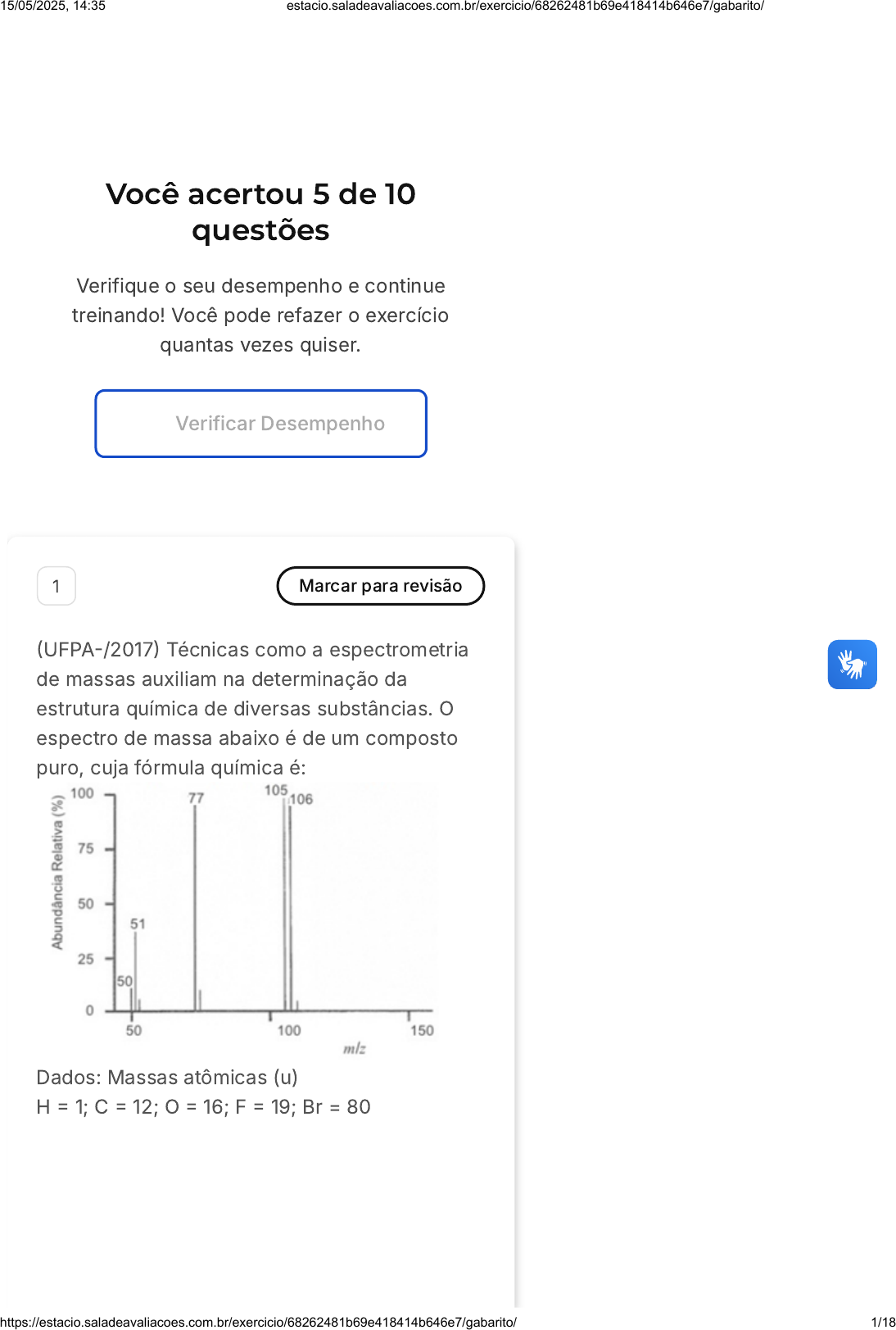 Você acertou 5 de 10 questões Verifique o seu desempenho e continue treinando! Você pode refazer o exercício quantas vezes quiser. Verificar Desempenho 1 Marcar para revisão (UFPA-/2017) Técnicas como a espectrometria de massas auxiliam na determinação da estrutura química de diversas substâncias. O espectro de massa abaixo é de um composto puro, cuja fórmula química é: Dados: Massas atômicas (u) H = 1; C = 12; O = 16; F = 19; Br = 80 15/05/2025, 14:35 estacio.saladeavaliacoes.com.br/exercicio/68262481b69e418414b646e7/gabarito/ https://estacio.saladeavaliacoes.com.br/exercicio/68262481b69e418414b646e7/gabarito/ 1/18 A B C D E C H6 6. CH Br.3 CH F .2 2 C H CHO.6 5 C H CH CH .6 5 2 3 Resposta incorreta Opa! A alternativa correta é a letra D. Confira o gabarito comentado! Gabarito Comentado O fragmento de m/z 106 é formado devido a perda de um hidrogênio (106-105 = 1), uma fragmentação comum de aldeídos. Observa-se também a perda de um fragmento de massa m/z 28 (105 - 77 = 28), que correspondente ao grupo CO. Além disso o fragmento em m/z 77 é típico de aromáticos, C H . Assim, o espectro pertence ao composto C H CHO. 6 5 + 6 5 2 Marcar para revisão De um espectro de massas pode-se extrair muitas informações sobre o analito sob análise. A tabela a seguir resume a proporção m/z e suas respectivas abundâncias relativas (%) 15/05/2025, 14:35 estacio.saladeavaliacoes.com.br/exercicio/68262481b69e418414b646e7/gabarito/ https://estacio.saladeavaliacoes.com.br/exercicio/68262481b69e418414b646e7/gabarito/ 2/18 A B C D E para os picos de um espectro de massa de um composto puro. Da tabela, o pico base e o pico devido ao íon molecular do composto são, respectivamente, os de proporção m/z igual a: 31 e 32. 15 e 14. 13 e 12. 29 e 15. 30 e 13. Resposta correta Parabéns, você selecionou a alternativa correta. Confira o gabarito comentado! Gabarito Comentado O pico-base se referente à forma da molécula com maior estabilidade (abundância relativa 100%), o pico do íon- molecular é aquele que possui a mesma massa molecular do composto original, não é, necessariamente, o fragmento iônico 15/05/2025, 14:35 estacio.saladeavaliacoes.com.br/exercicio/68262481b69e418414b646e7/gabarito/ https://estacio.saladeavaliacoes.com.br/exercicio/68262481b69e418414b646e7/gabarito/ 3/18 mais estável, logo a abundância pode ser baixa. 3 Marcar para revisão O efeito da blindagem é uma influência crucial no deslocamento químico dos prótons, e compreendê-lo é fundamental para a interpretação precisa dos espectros de RMN. Qual dos compostos abaixo corresponde ao espectro de RMN H a seguir?1 15/05/2025, 14:35 estacio.saladeavaliacoes.com.br/exercicio/68262481b69e418414b646e7/gabarito/ https://estacio.saladeavaliacoes.com.br/exercicio/68262481b69e418414b646e7/gabarito/ 4/18 A B C 15/05/2025, 14:35 estacio.saladeavaliacoes.com.br/exercicio/68262481b69e418414b646e7/gabarito/ https://estacio.saladeavaliacoes.com.br/exercicio/68262481b69e418414b646e7/gabarito/ 5/18 D E Resposta incorreta Opa! A alternativa correta é a letra A. Confira o gabarito comentado! Gabarito Comentado O espectro de RMN de hidrogênio apresenta somente dois sinais singletos, tendo em vista que os hidrogênios no anel aromático são equivalentes, e os hidrogênios do grupo metila também são equivalentes. Como o espectro possui um sinal na região de hidrogênios aromáticos, em torno de 7 ppm e outro sinal na região 15/05/2025, 14:35 estacio.saladeavaliacoes.com.br/exercicio/68262481b69e418414b646e7/gabarito/ https://estacio.saladeavaliacoes.com.br/exercicio/68262481b69e418414b646e7/gabarito/ 6/18 de hidrogênios de cadeia carbônica, em torno de 2 ppm, a alternativa correta é a letra A. Os espectros dos compostos das letras B e C apresentam dois sinais com deslocamentos químicos mais altos e o composto da alternativa C, apenas um singleto, já o composto da letra E apresentará outros sinais com multiplicidades diferentes. 4 Marcar para revisão (UERR-CODESAIMA/2017) A espectroscopia de RMN tem uma enorme relevância nas áreas de pesquisa e desenvolvimento em química orgânica, inorgânica e físico-química, produção e desenvolvimento de agroquímicos, na indústria farmacêutica, de polímeros e de alimentos, em pesquisas bioquímicas e biológicas. Sobre a Ressonância Magnética Nuclear (RMN), são dadas as seguintes afirmações: I. A ressonância magnética nuclear é a técnica mais importante para a elucidação estrutural de uma molécula e permite a detecção de muitos núcleos, tais como H, C, C, N e P. II. Os espectros de RMN de C geralmente são realizados com desacoplamento do núcleo de H. III. As radiações de radiofrequência são as responsáveis por transições de spin nuclear e, por isso, utilizadas na técnica de RMN. Assinale a alternativa correta. 1 13 12 15 31 13 1 15/05/2025, 14:35 estacio.saladeavaliacoes.com.br/exercicio/68262481b69e418414b646e7/gabarito/ https://estacio.saladeavaliacoes.com.br/exercicio/68262481b69e418414b646e7/gabarito/ 7/18 A B C D E Apenas I é verdadeira. Apenas II é verdadeira. Apenas III é verdadeira. I e II são verdadeiras. II e III são verdadeiras. Resposta incorreta Opa! A alternativa correta é a letra E. Confira o gabarito comentado! Gabarito Comentado A ressonância magnética nuclear permite a detecção de muitos núcleos, que possuem estados de spin nuclear de +1/2 e -1/2. tais como H, C, N, F e P. Os espectros de RMN de C podem ser acoplados ou desacoplados, sendo mais comum o desacoplamento do núcleo de H, resultando em um espectro com picos únicos, singletos. As radiações que ocorrem na região da radiofrequência, radiação de baixíssima energia, são que permitem a mudança de spin nuclear e são as utilizadas na técnica de RMN. 1 13 15 19 31 13 1 5 Marcar para revisão 15/05/2025, 14:35 estacio.saladeavaliacoes.com.br/exercicio/68262481b69e418414b646e7/gabarito/ https://estacio.saladeavaliacoes.com.br/exercicio/6826248