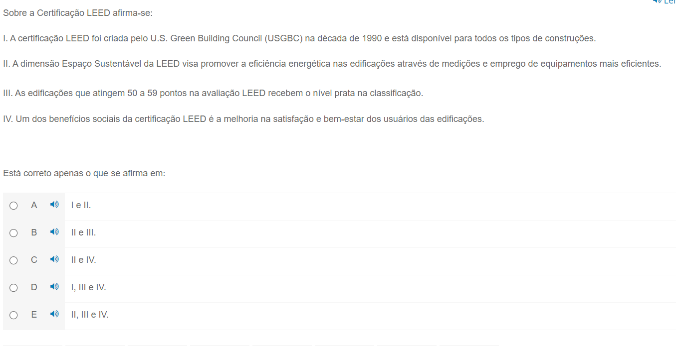 Sobre a Certificação LEED afirma-se: I. A certificação LEED foi criada pelo U.S. Green Building Council (USGBC) na década de 1990 e está disponível para todos os tipos de construções. II. A dimensão Espaço Sustentável da LEED visa promover a eficiência energética nas edificações através de medições e emprego de equipamentos mais eficientes. III. As edificações que atingem 50 a 59 pontos na avaliação LEED recebem o nível prata na classificação. IV. Um dos benefícios sociais da certificação LEED é a melhoria na satisfação e bem-estar dos usuários das edificações. Está correto apenas que se afirma em: A II. e III. e IV. I, III e IV. II, III e IV.
