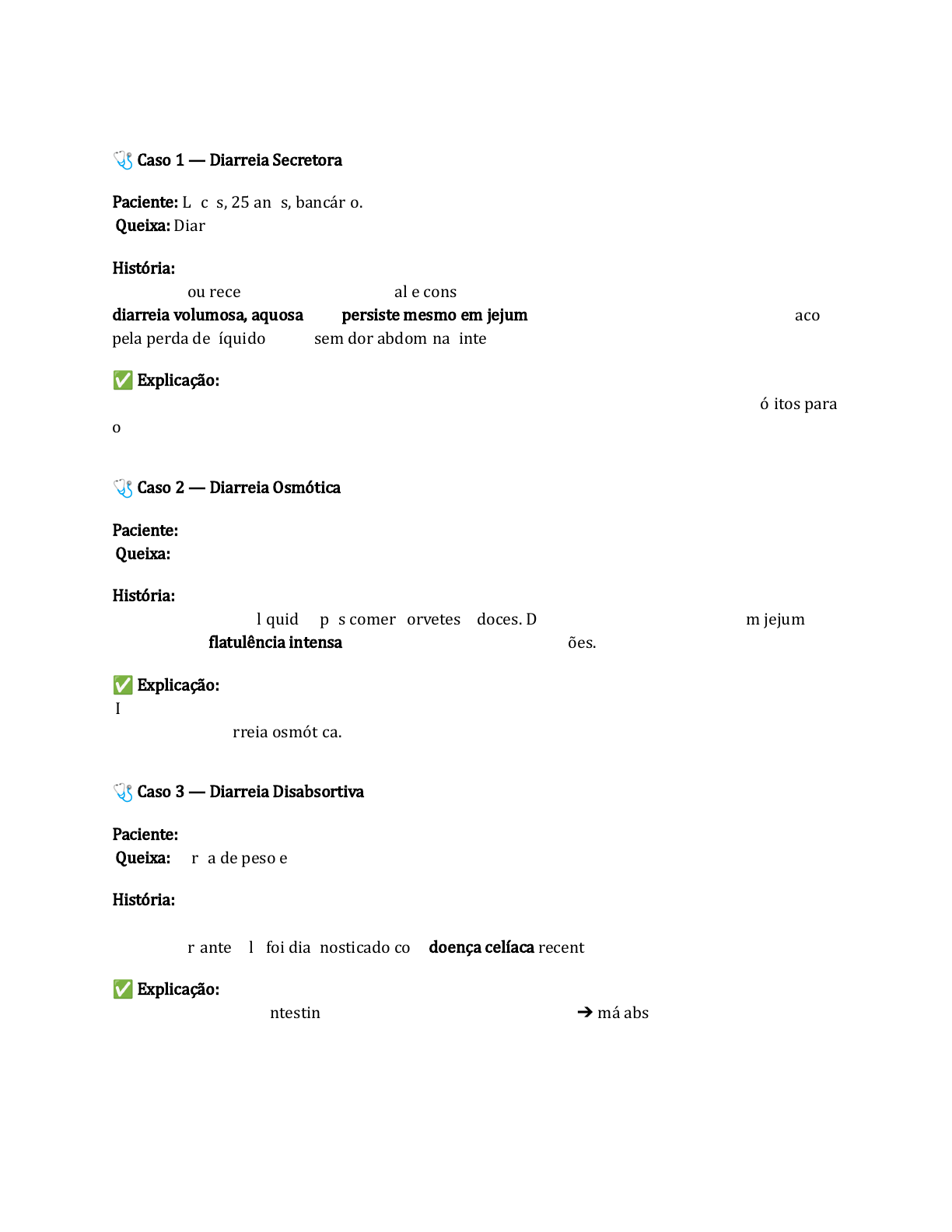 🩺 Caso 1 — Diarreia Secretora Paciente: Lucas, 25 anos, bancário. Queixa: Diarreia há 2 dias. História: Lucas viajou recentemente para o litoral e consumiu frutos do mar crus. Desde então, apresenta diarreia volumosa, aquosa, que persiste mesmo em jejum. Não há sangue nas fezes. Sente-se fraco pela perda de líquidos, mas sem dor abdominal intensa. ✅ Explicação: Enterotoxinas bacterianas (ex.: Vibrio cholerae) estimulam secreção ativa de água e eletrólitos para o lúmen → diarreia secretora. 🩺 Caso 2 — Diarreia Osmótica Paciente: Ana, 30 anos, professora. Queixa: Distensão abdominal e diarreia após refeições. História: Ana refere diarreia líquida após comer sorvetes e doces. Diz que melhora quando fica em jejum. Queixa-se de flatulência intensa e "barriga inchada" após refeições. ✅ Explicação: Intolerância à lactose ➔ a lactose não digerida acumula no intestino ➔ aumenta a osmolaridade ➔ puxa água ➔ diarreia osmótica. 🩺 Caso 3 — Diarreia Disabsortiva Paciente: Marcos, 45 anos, engenheiro. Queixa: Perda de peso e fezes gordurosas. História: Marcos relata fezes volumosas, brilhantes, com cheiro fétido (esteatorreia), associadas a perda de peso importante. Ele foi diagnosticado com doença celíaca recentemente. ✅ Explicação: Lesão da mucosa do intestino delgado (atrofia das vilosidades) ➔ má absorção de nutrientes ➔ diarreia disabsortiva. 1 🩺 Caso 4 — Diarreia Inflamatória Paciente: Paula, 28 anos, advogada. Queixa: Diarreia com sangue há 1 semana. História: Paula refere febre, cólicas abdominais e diarreia com presença de sangue e muco. Sente vontade urgente de evacuar (tenesmo). Relata que o quadro iniciou após viagem para o interior. ✅ Explicação: Provavelmente uma colite infecciosa (ex.: Shigella) ou início de uma doença inflamatória intestinal ➔ lesão da mucosa ➔ extravasamento de sangue, muco e pus ➔ diarreia inflamatória. 🩺 Caso 5 — Diarreia Motora/Funcional Paciente: Carolina, 22 anos, estudante. Queixa: Alternância de diarreia e constipação. História: Carolina relata diarreia intercalada com constipação, associada a dor abdominal que melhora depois de evacuar. Relata que o quadro piora com estresse. Não há sangue nas fezes. ✅ Explicação: Síndrome do Intestino Irritável (SII) ➔ alteração da motilidade intestinal ➔ diarreia motora/funcional, sem inflamação nem infecção. 🩺 CASO CLÍNICO – SÍNDROME DO INTESTINO IRRITÁVEL Paciente: Juliana, 26 anos, estudante de direito Queixa: Dor abdominal crônica e diarreia intercalada com constipação há meses. História clínica: Juliana relata dor abdominal tipo cólica, principalmente no quadrante inferior esquerdo, há mais de 6 meses. A dor melhora após evacuar. Ela percebe também alteração do hábito intestinal, alternando entre diarreia e prisão de ventre, com períodos de fezes pastosas e, às vezes, endurecidas. Relata sensação de distensão abdominal, flatulência e urgência para evacuar em algumas situações, especialmente quando está estressada ou nervosa. Nega sangue nas fezes, febre, emagrecimento ou sintomas noturnos. 2 Exame físico: ● Abdome: levemente distendido, com ruídos normais e sensibilidade difusa à palpação profunda, sem sinais de defesa. ● Sem sinais de alarme (sem massa palpável, sem linfadenomegalia). Exames laboratoriais: ● Hemograma, PCR e função tireoidiana normais. ● Sorologia negativa para doença celíaca. ● Calprotectina fecal dentro dos valores normais. ● Colonoscopia: normal. 🧠 Interpretação Clínica e Diagnóstico: Juliana apresenta os critérios de Roma IV: ● Dor abdominal recorrente, 1x/semana nos últimos 3 meses, associada a pelo menos 2 dos seguintes: 1. Relação com evacuação ✅ 2. Mudança na frequência das evacuações ✅ 3. Mudança na forma das fezes ✅ ✅ Diagnóstico: Síndrome do Intestino Irritável (SII) tipo mista (constipação e diarreia alternadas) 🔬 Fisiopatologia (em linguagem simples): ● Motilidade alterada: intestino funciona mais rápido ou mais devagar. ● Hipersensibilidade visceral: Juliana sente dor mesmo com distensão leve. ● Alterações do eixo intestino-cérebro: estresse piora o quadro. ● Disbiose intestinal e baixa tolerância a FODMAPs podem contribuir. 🚨 Sinais de Alarme (que Juliana não tem): ● Sangue nas fezes ● Febre ● Perda de peso ● Anemia ● Início após os 50 anos ● Massa palpável 3 💊 Conduta: ● Explicação e tranquilização da paciente ● Dieta com restrição de FODMAPs ● Atividade física e manejo do estresse ● Em casos com sintomas intensos: ○ Antiespasmódicos para dor (ex: escopolamina) ○ Loperamida para episódios de diarreia ○ Laxantes suaves para constipação (psyllium) ○ Antidepressivos tricíclicos ou ISRS, se dor intensa ou ansiedade 🩺 CASO CLÍNICO — DOENÇA CELÍACA Paciente: Camila, 32 anos, nutricionista. Queixa principal: Diarreia crônica, emagrecimento e fraqueza. História clínica: Camila relata diarreia intermitente há mais de 6 meses, com episódios de fezes volumosas, amolecidas, brilhantes e de odor muito forte. Também refere flatulência frequente, distensão abdominal após refeições e perda de 5 kg nos últimos meses, mesmo comendo normalmente. Sente-se muito cansada e recentemente descobriu uma anemia ferropriva resistente à reposição oral. Nega febre, sangue nas fezes, vômitos ou dor abdominal intensa. Refere histórico familiar de tireoidite autoimune. Exame físico: ● Emagrecida, pele pálida, unhas frágeis ● Abdome: globoso, com ruídos aumentados à ausculta ● Sem visceromegalias, sem dor à palpação Exames laboratoriais: ● Hemograma: anemia microcítica hipocrômica ● Ferritina: baixa ● Anticorpo antitransglutaminase IgA: positivo ● IgA total: normal ● EDA com biópsia duodenal: atrofia de vilosidades, hiperplasia de criptas e linfocitose intraepitelial (Marsh III) 4 🧠 Di