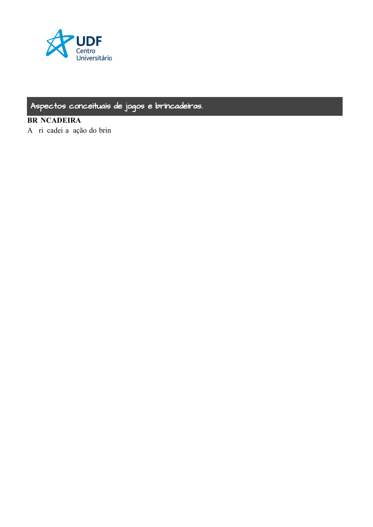 SGAS 903 Bloco D Lote 79 70390 030 Brasília DF T 55 61 3704 8884 www.udf.edu.br SEP SUL EQ 704/904 Conj A 70390 045 Brasília DF T 55 61 3704 8888 Aspectos conceituais de jogos e brincadeiras. BRINCADEIRA A brincadeira, ação do brincar, se distingue por alguma estruturação e pela utilização de regras. Seguem algumas brincadeiras amplamente conhecidas: Brincar de casinha, pique pega, telefone sem fio, bolinha de gude, carrinho etc. A brincadeira é uma atividade que pode ser tanto coletiva quanto individual. Na brincadeira a existência das regras não limita a ação lúdica, a criança pode modificá-la, ausentar-se quando desejar, incluir novos membros, adotar as próprias regras, por fim, existe maior liberdade de ação para as crianças. Brougére (2002) define o brincar como um espaço de criação cultural por excelência. Segundo o autor, é no brincar que a criança encontra uma distância com o mundo real. Na concepção de Freud, o brincar seria uma forma de prazer oposta à realidade. O brincar segundo Brougére (2002), não é uma dinâmica interna do indivíduo, mas sim uma atividade repleta de significados sociais e que precisa de aprendizagem, desse modo podemos dizer que a criança não nasce sabendo brincar. BRINQUEDO De acordo com a autora KISHIMOTO (1994) o brinquedo é representado como um "objeto suporte da brincadeira", ou seja, o brinquedo aqui estará concebido por objetos como piões, bonecas, carrinhos etc. Os brinquedos podem ser considerados: estruturados e não estruturados. São designados de brinquedos estruturados aqueles que já são adquiridos prontos, é o caso dos exemplos acima. Os brinquedos não estruturados não são provenientes de indústrias, assim são simples objetos como paus ou pedras, que nas mãos das crianças adquirem novo significado, podendo transformar-se em um brinquedo. A pedra se transforma em comidinha e o pau se transforma em cavalinho. Desse modo, os brinquedos podem ser estruturados ou não estruturados dependendo de sua origem ou da alteração criativa da criança sobre o objeto. JOGO O jogo é uma atividade livre e voluntária, exterior à vida habitual, capaz de absorver o jogador de maneira intensa e prazerosa. Para Kishimoto (2007), definir jogo não é fácil, pois uma mesma ação pode ser jogo ou entendida como não - jogo, tudo dependerá do significado a ele atribuído, por exemplo, uma criança indígena atirando uma flecha, um observador pode interpretar como um divertimento, mas para a criança é um trabalho. Para entendermos melhor a significação de jogo, Kishimoto (2007) nos fala de três níveis de diferenciação de jogos, são eles: O resultado de um sistema linguístico que funciona dentro de um SGAS 903 Bloco D Lote 79 70390 030 Brasília DF T 55 61 3704 8884 www.udf.edu.br SEP SUL EQ 704/904 Conj A 70390 045 Brasília DF T 55 61 3704 8888 contexto social; um sistema de regras; um objeto. No primeiro caso o jogo assume uma postura de acordo com o que a sociedade atribui. No segundo, se refere a uma estrutura sequencial, o que faz com que um jogo seja diferenciado do outro pelas regras. O terceiro se resume ao jogo enquanto puro objeto, o xadrez, por exemplo, não é possível sem o tabuleiro. Portanto, a concepção de jogo está integrada tanto ao objeto (brinquedo) quanto à brincadeira. É uma atividade mais estruturada e estabelecida por um princípio de regras mais explícitas. Exemplos clássicos seriam: Jogo de Mímica, de Cartas, de Tabuleiro, de Construção, de Faz-de-Conta etc. Uma particularidade importante do jogo é o seu emprego tanto por crianças quanto por adultos. Jogos Culturais/Populares/Tradicionais - Amarelinha, elástico, pique bandeirinha…(Brincadeiras e jogos populares do Brasil e do mundo Brincadeiras e jogos de matriz indígena e africana); Jogos de Mesa/Tabuleiro/Salão - Xadrez; Jogos Desportivos - Golzinho, pelada com os amigos…Jogos Eletrônicos - Precisam de um objeto (enredo, motor e interface). LUDICIDADE Ludicidade é um termo utilizado na educação infantil e que tem origem na palavra latina "ludus", que significa jogo. O conceito de ludicidade compreende os jogos e brincadeiras, mas não se restringe a elas. Atividades lúdicas são aquelas que permitem que as crianças aprendam e desenvolvam suas capacidades por meio de brincadeiras, do uso da sua imaginação e da fantasia, próprias do mundo infantil. De acordo com Luckesi (2000), ludicidade foca a experiência lúdica como uma experiência interna do sujeito que vivencia a atividade. No entanto, as buscas sobre um conceito definitivo não são encontradas nos dicionários. Alguns autores descrevem a ludicidade como (BROUGÈRE, 2003) a atividade lúdica; o sistema de regras bem definidas (que existem independentemente dos jogadores) e o objeto (instrumento SGAS 903 Bloco D Lote 79 70390 030 Brasília DF T 55 61 3704 8884 www.udf.edu.br SEP SUL EQ 704/904 Conj A 70390 045 Brasília DF T 55 61 3704 8888 ou brinquedo) que os indivíduos usam para jogar. Já a palavra jogo, relacionada à ludicidade, é de origem latina e significa “gracejo”. Desse modo, além das características que favorecem o desenvolvimento no processo de aprendizagem, os jogos proporcionam prazer e diversão. Sendo assim, podemos dizer que as atividades lúdicas promovem a imaginação, a integração desde a educação infantil, sendo de grande importância na transformação do sujeito. Quando tratamos do lúdico e do brincar, é importante que saibamos que há legislação e diretrizes educacionais que contemplam essas ações. Veja algumas observações importantes sobre quem proporciona a brincadeira e o espaço de brincar.Os agentes do brincar são as pessoas que, com conhecimento e competência, criam as oportunidades para que as crianças brinquem livremente. Podem ser: jovens, pais, educadores, profissionais, estudantes, voluntários de organizações da sociedade civil, pessoas na terceira idade, etc. Em um ambiente ad