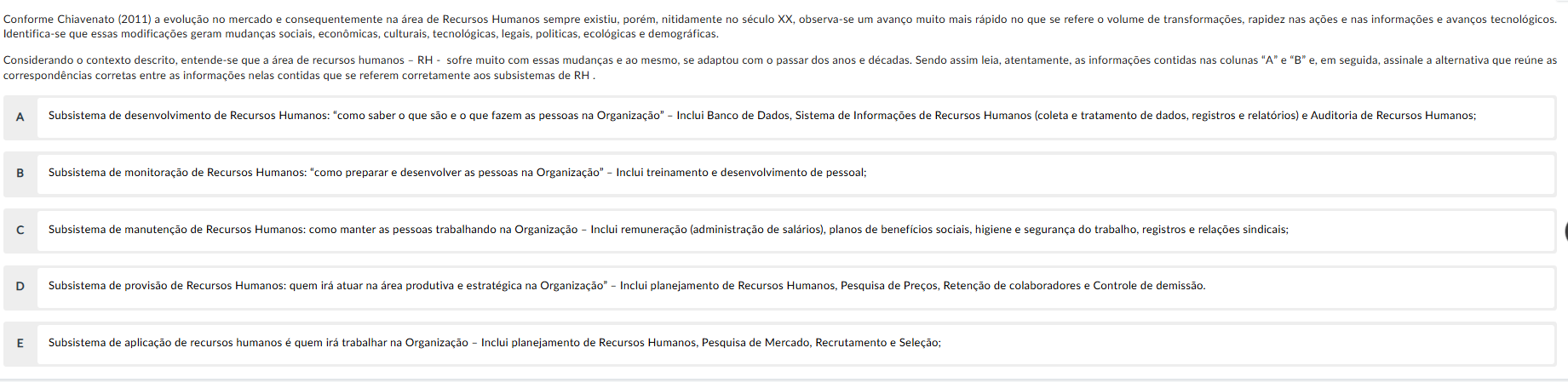 Conforme Chiavenato (2011) a evolução no mercado e consequentemente na área de Recursos Humanos sempre existiu, nitidamente no século XX, observa-se um avanço muito mais rápido no que se refere o volume de rapidez nas ações e nas informações e avanços tecnológicos. Identifica-se que essas modificações geram mudanças sociais, econômicas, tecnológicas, legais, ecológicas e Considerando o contexto entende-se que a área de recursos humanos RH sofre muito com essas mudanças e ao se adaptou com o passar dos anos e Sendo assim leia, as informações contidas nas colunas "A" e "B" em seguida, assinale a alternativa que reune as correspondências corretas entre as informações nelas contidas que se referem corretamente aos subsistemas de RH. A Subsistema de desenvolvimento de Recursos Humanos: "como saber o que são e o que fazem as pessoas na Organização" - Inclui Banco de Dados, Sistema de Informações de Recursos Humanos (coleta e tratamento de dados, registros e relatórios) e Auditoria de Recursos B Subsistema de monitoração de Recursos Humanos: "como preparar e desenvolver as pessoas na Organização" - Inclui treinamento e desenvolvimento de Subsistema de manutenção de Recursos Humanos: como manter as pessoas trabalhando na Organização Inclui remuneração (administração de salários), planos de benefícios higiene e segurança do trabalho, registros e relações sindicais: D Subsistema de provisão de Recursos Humanos: quem irá atuar na área produtiva e estratégica na Organização" - Inclui planejamento de Recursos Humanos, Pesquisa de Preços, Retenção de colaboradores e Controle de demissão. E Subsistema de aplicação de recursos humanos é quem irá trabalhar na Organização - Inclui planejamento de Recursos Pesquisa de Recrutamento e