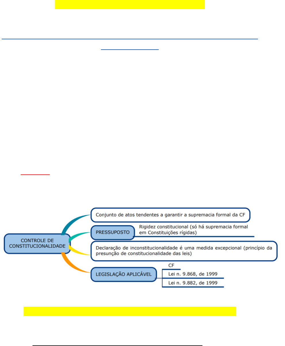 CONTROLE DE CONSTITUCIONALIDADE VIDE SÚMULAS STF: https://portal.stf.jus.br/publicacaotematica/vertema.asp?lei=5235 · Entre os pressupostos do controle de constitucionalidade, destacam-se a supremacia da CF e a rigidez constitucional. · Em consequência da supremacia formal da Constituição Federal, todas as normas constitucionais equivalem-se em termos de hierarquia. · Só se fala em supremacia formal da Constituição em Estados que adotam a Constituição do tipo rígida. Inconstitucionalidade por Ação e por Omissão · A inconstitucionalidade por ação diz respeito à verificação da compatibilidade vertical entre as normas jurídicas e os atos do Poder Público com o seu parâmetro de controle, a Constituição Federal.Significa um fazer inconstitucional do Poder Público. · A inconstitucionalidade por omissão decorre de um não fazer do Estado que ofende uma determinação constitucional. · A aferição desta inconstitucionalidade por omissão pode se dar pela via concentrada, por meio de uma ação direta de inconstitucionalidade por omissão, ou pela via difusa, por meio de mandado de injunção. MI= DIFUSO/CONCRETO ADI = CONCENTRADO/ABSTRATO · Essa omissão inconstitucional pode ser total (ausência total da norma regulamentadora do direito constitucionalmente previsto) ou parcial (existe a norma regulamentadora, mas a normatização é deficiente). Inconstitucionalidade Material e Formal · Inconstitucionalidade material (também chamada de nomoestática) quando o vício está no conteúdo da norma (na sua matéria). · Inconstitucionalidade formal (ou nomodinâmica), o vício está no processo legislativo. Essa inconstitucionalidade formal subdivide-se em: · Subjetiva: o vício está na iniciativa para a propositura do projeto de lei. · Objetiva: o vício estará situado nas demais fases do processo legislativo, como, por exemplo, uma lei complementar, que exige um quórum de maioria absoluta (art. 69), aprovada por maioria simples. · Orgânica: aqui, o vício está na repartição constitucional de competências, como, por exemplo, uma lei estadual que legisle sobre trânsito. Inconstitucionalidade Total ou Parcial · A inconstitucionalidade total atinge todo o ato normativo, ao passo que, na inconstitucionalidade parcial, apenas parte da lei é atingida pelo vício de inconstitucionalidade. · A declaração de inconstitucionalidade parcial pelo Poder Judiciário pode recair sobre fração de artigo, parágrafo, inciso ou alínea, até mesmo sobre uma única palavra de um desses dispositivos da lei. · No entanto, o Poder Judiciário não poderá subverter o intuito da lei, mudando o sentido e o alcance da norma, sob pena de ofensa ao princípio da separação dos poderes. Sistemas de Controle de Constitucionalidade · No controle jurisdicional ou judicial, a competência para realizar o controle de constitucionalidade é conferida aos órgãos que integram o Poder Judiciário. · No controle político, o controle de constitucionalidade recai sobre órgãos que não integram o Poder Judiciário (exemplo: na França, o controle de constitucionalidade é realizado pelo Conselho Constitucional Francês). · Já no controle misto, parte das leis são fiscalizadas por órgãos de natureza política, alheios à estrutura do Poder Judiciário, e outra parte são fiscalizadas pelo próprio Poder Judiciário (exemplo: na Suíça, as leis nacionais submetem-se ao controle político; já as leis locais são submetidas ao controle judicial). · No Brasil, o controle é predominantemente judicial. Não se trata de um modelo jurisdicional puro, haja vista existir, pontualmente, controles de natureza política realizados pelos demais Poderes da República. São exemplos de controle político no Brasil: a) a competência das Comissões de Constituição e Justiça para verificarem a constitucionalidade dos projetos de lei; b) o veto jurídico do Presidente da República pela inconstitucionalidade do projeto de lei (art. 66, § 1º); e c) o enunciado da Súmula 347, do STF, permite que os Tribunais de Contas, no exercício de suas atribuições, aprecie a constitucionalidade das leis e dos atos do poder público. Essa competência dos Tribunais de Contas para realizarem controle de constitucionalidade SEMPRE se dará no concreto, jamais no abstrato. · No Brasil, quem detém a competência para realizar o controle de constitucionalidade é o Poder Judiciário, havendo apenas traços de controle político. Momento do Controle de Constitucionalidade · Quanto ao momento do controle de constitucionalidade, pode ser preventivo ou repressivo. · Será preventivo quando se fiscaliza um projeto de lei, com o fim de se evitar que seja inserida no ordenamento jurídico uma norma incompatível com a Constituição. · Todos os Poderes da República têm a possibilidade de atuar no controle preventivo. · No caso do Poder Legislativo, o controle preventivo fica a cargo das já citadas Comissões de Constituição e Justiça da Câmara dos Deputados e do Senado Federal. · O Poder Executivo exerce o controle preventivo por meio do veto jurídico do Presidente da República previsto no art. 61, § 1º. O Poder Judiciário atua no controle preventivo em apenas uma única hipótese: quando houver um mandado de segurança impetrado no Supremo Tribunal Federal por parlamentar da própria Casa legislativa em que esteja o projeto de lei pela inobservância do devido processo legislativo constitucional. Por sua vez, o controle será repressivo quando recair sobre uma lei já existente. Também é realizado por todos os Poderes da República. O Poder Legislativo atua no controle repressivo nas seguintes hipóteses: a) art. 49, V – a competência exclusiva do Congresso Nacional para sustar os atos normativos do Poder Executivo que exorbitem do poder regulamentar ou dos limites de delegação legislativa; b) art. 52, X – a possibilidade de o Senado Federal suspender a execução, no todo ou em 
