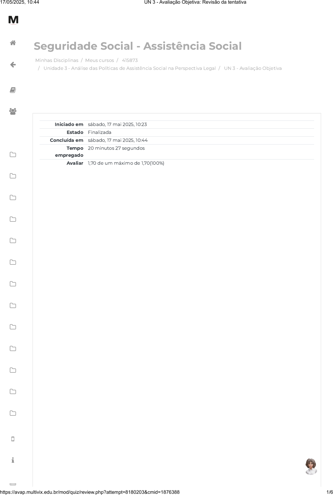 Minhas Disciplinas / Meus cursos / 415873 / Unidade 3 - Análise das Políticas de Assistência Social na Perspectiva Legal / UN 3 - Avaliação Objetiva Seguridade Social - Assistência Social Iniciado em sábado, 17 mai 2025, 10:23 Estado Finalizada Concluída em sábado, 17 mai 2025, 10:44 Tempo empregado 20 minutos 27 segundos Avaliar 1,70 de um máximo de 1,70(100%) 17/05/2025, 10:44 UN 3 - Avaliação Objetiva: Revisão da tentativa https://avap.multivix.edu.br/mod/quiz/review.php?attempt=8180203&cmid=1876388 1/6 https://avap.multivix.edu.br/my/ https://avap.multivix.edu.br/course/view.php?id=33034 https://avap.multivix.edu.br/course/view.php?id=33034§ion=4 https://avap.multivix.edu.br/mod/quiz/view.php?id=1876388 https://avap.multivix.edu.br/my/ https://avap.multivix.edu.br/course/view.php?id=33034 https://avap.multivix.edu.br/user/index.php?id=33034 https://avap.multivix.edu.br/course/view.php?id=33034§ion=1 https://avap.multivix.edu.br/course/view.php?id=33034§ion=2 https://avap.multivix.edu.br/course/view.php?id=33034§ion=3 https://avap.multivix.edu.br/course/view.php?id=33034§ion=4 https://avap.multivix.edu.br/course/view.php?id=33034§ion=5 https://avap.multivix.edu.br/course/view.php?id=33034§ion=6 https://avap.multivix.edu.br/course/view.php?id=33034§ion=7 https://avap.multivix.edu.br/course/view.php?id=33034§ion=8 https://avap.multivix.edu.br/course/view.php?id=33034§ion=9 https://avap.multivix.edu.br/course/view.php?id=33034§ion=10 https://avap.multivix.edu.br/course/view.php?id=33034§ion=11 https://avap.multivix.edu.br/course/view.php?id=33034§ion=12 https://avap.multivix.edu.br/course/view.php?id=33034§ion=13 https://avap.multivix.edu.br/hooks/portal/ https://avap.multivix.edu.br/mod/page/view.php?id=1252%2F%22%20target%3D%22_blank https://avap.multivix.edu.br/calendar/view.php/ https://avap.multivix.edu.br/ https://avap.multivix.edu.br/ https://avap.multivix.edu.br/ https://avap.multivix.edu.br/ https://avap.multivix.edu.br/ https://avap.multivix.edu.br/ https://avap.multivix.edu.br/ Questão 1 Correto Atingiu 0,34 de 0,34 A política de Assistência Social, legalmente reconhecida como direito social e dever estatal pela Constituição de 1988 e pela Lei Orgânica de Assistência Social (LOAS), vem sendo regulamentada intensivamente pelo Governo Federal, com aprovação pelo Conselho Nacional de Assistência Social (CNAS), por meio da Política Nacional de Assistência Social (2004) e do Sistema Único de Assistência Social (2005). O objetivo com esse processo é consolidar a Assistência Social como política de Estado; para estabelecer critérios objetivos de partilha de recursos entre os serviços sócioassistenciais e entre estados, DF e municípios; para estabelecer uma relação sistemática e interdependente entre programas, projetos, serviços e benefícios, como o Benefício de Prestação Continuada (BPC) e o Bolsa Família, para fortalecer a relação democrática entre planos, fundos, conselhos e órgão gestor; para garantir repasse automático e regular de recursos fundo a fundo e para instituir um sistema informatizado de acompanhamento e monitoramento, até então inexistente. Para a efetivação da Assistência Social como política pública, contudo, é imprescindível sua integração e articulação à seguridade social e às demais políticas sociais. Por isso, a concepção de Assistência Social e sua materialização em forma de proteção social básica e especial (de média e alta complexidades), conforme previsto na PNAS/SUAS, requer situar e articular estas modalidades de proteção social ao conjunto das proteções previstas pela Seguridade Social. Dito de outro modo, a Assistência Social não pode ser entendida como uma política exclusiva de proteção social, mas deve-se articular seus serviços e benefícios aos direitos assegurados pelas demais políticas sociais, a fim de estabelecer, no âmbito da Seguridade Social, um amplo sistema de proteção social Fonte: Conselho Federal de Serviço Social – CFESS. Parâmetros para Atuação de Assistentes Sociais na Política de Assistência Social. Disponível em: ;. Acesso em 31 de março de 2019. A respeito da política de assistência social, assinale a opção correta. Escolha uma opção: a. O governo federal criou um sistema de financiamento próprio, destinando recursos para as ações da política de assistência social, somente para os municípios. b. A Constituição Federal pouco observou a questão federativa brasileira, sendo desenvolvida exclusivamente pelo Governo Federal c. Ao desenvolver a política de assistência social, Estados e Municípios se tornaram autônomos perante o governo federal. d. Quando se trata de política de Assistência Social, a mesma foi desenvolvida nos anos 30 e aperfeiçoada ao longo do tempo. e. Ganhou incentivo com a Constituição de 1988 e vem se aprimorando com legislações pertinentes a temática. 17/05/2025, 10:44 UN 3 - Avaliação Objetiva: Revisão da tentativa https://avap.multivix.edu.br/mod/quiz/review.php?attempt=8180203&cmid=1876388 2/6 http://www.cfess.org.br/arquivos/Cartilha_CFESS_Final_Grafica.pdf%3E https://avap.multivix.edu.br/my/ https://avap.multivix.edu.br/course/view.php?id=33034 https://avap.multivix.edu.br/user/index.php?id=33034 https://avap.multivix.edu.br/course/view.php?id=33034§ion=1 https://avap.multivix.edu.br/course/view.php?id=33034§ion=2 https://avap.multivix.edu.br/course/view.php?id=33034§ion=3 https://avap.multivix.edu.br/course/view.php?id=33034§ion=4 https://avap.multivix.edu.br/course/view.php?id=33034§ion=5 https://avap.multivix.edu.br/course/view.php?id=33034§ion=6 https://avap.multivix.edu.br/course/view.php?id=33034§ion=7 https://avap.multivix.edu.br/course/view.php?id=33034§ion=8 https://avap.multivix.edu.br/course/view.php?id=33034§ion=9 https://avap.multivix.edu.br/course/view.php?id=33034§ion=10 https://avap.multivix.edu.br/course/view.php?id=33034§ion=11 https://avap.mu