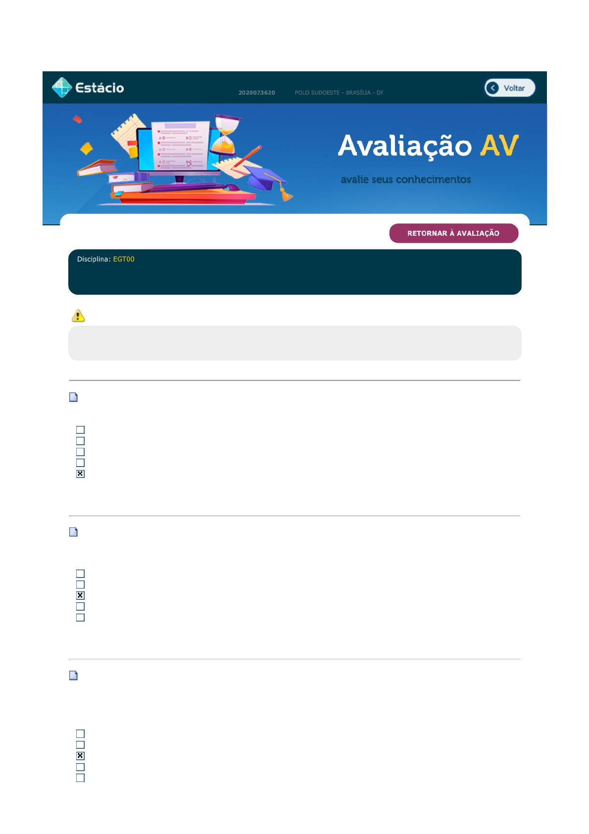 Impresso por Leca Ferreira, E-mail lecaferreiira10@gmail.com para uso pessoal e privado. Este material pode ser protegido por direitos autorais e não pode ser reproduzido ou repassado para terceiros. 17/05/2025, 13:59:58 11/06/2022 13:22 EPS https://simulado.estacio.br/alunos/ 1/4 Sergio Oliveira de Almeida RETORNAR À AVALIAÇÃO Disciplina: Período: EGT0063 - GESTÃO DE SISTEMAS DE INFORMAÇÃO 2022.1 EAD (GT) AV / Aluno: Matrícula: SERGIO OLIVEIRA DE ALMEIDA 202007362081 Data: Turma: 11/06/2022 13:21:38 9001 ATENÇÃO 1. Veja abaixo, as suas respostas gravadas no nosso banco de dados.todas 2. Caso você queira voltar à prova clique no botão " ".Retornar à Avaliação 1a Questão (Ref.: 202012828029) Qual dos itens abaixo não é uma fase do processo de implantação de projetos de TI? Definição do método. Testes e aprovações. Elaboração do cronograma. Orquestração da implantação. Levantamento de requisitos. 2a Questão (Ref.: 202012828013) Maximização do uso da informática, aprimoramento do negócio, relação com parceiros diretamente, são atitudes de que tipo de empresa? Empresas Sociais. Empresas de Transformação Digital. Empresas Digitais. Empresas Modernas. Empresas Tecnológicas. 3a Questão (Ref.: 202012826943) A TI é extremamente valiosa para o negócio, mas depende de fatores internos e externos, incluindo recursos organizacionais complementares e de parceiros comerciais, bem como do macroambiente e do ambiente competitivo. Um dos fatores para o sucesso da organização é a comunicação eficaz entre o negócio e a TI. Porém, a comunicação ainda é um desafio para as empresas. Um dos motivos pelos quais existe essa dificuldade é porque: os profissionais do negócio conhecem pouco dos seus processos. os empregados da empresa desconhecem as regras dos sistemas; os profissionais de negócios e de TI usam jargões diferentes; as linguagens de programação não são padronizadas; os profissionais de TI produzem dados incompreensíveis; Impresso por Leca Ferreira, E-mail lecaferreiira10@gmail.com para uso pessoal e privado. Este material pode ser protegido por direitos autorais e não pode ser reproduzido ou repassado para terceiros. 17/05/2025, 13:59:58 11/06/2022 13:22 EPS https://simulado.estacio.br/alunos/ 2/4 4a Questão (Ref.: 202012826896) Fonte: NBS - 2021 - Prefeitura de Irati - PR - Médico - Ambulatorial e PSF. São exemplos de hardware: I. Monitor II. Navegador III. Planilha IV. Fone de ouvido V. Editor de texto Assinale a alternativa correta. I e II IV e V II e III I e IV III e IV 5a Questão (Ref.: 202012078635) Ano: 2015 Banca: FCC Órgão: TRT - 9ª REGIÃO (PR) Prova: FCC - 2015 - TRT - 9ª REGIÃO (PR) - Técnico Judiciário - Área Apoio Especializado - Tecnologia da Informação Uma plataforma de Business Intelligence envolve o DW − Data Warehouse e diversos componentes, dentre os quais, encontram-se: I. Um subconjunto de informações do DW que podem ser identificados por assuntos ou departamentos específicos. II. Ferramentas com capacidade de análise em múltiplas perspectivas das informações armazenadas. III. Ferramentas com capacidade de descoberta de conhecimento relevante. Encontram correlações e padrões dentro dos dados armazenados. IV. Processo de extração, tratamento e limpeza dos dados para inserção no DW. Os componentes de I a IV são, correta e respectivamente, Data Mart − OLAP − Data Mining − ETL. Staging Area − OLAP − Data Mining − Cubos de Dados OLTP − Drill Through − Drill Across − Staging Area. Staging Area − Data Mining − OLAP − ETL. Cubo de dados − Data Mining − OLTP − Cubos de Dados 6a Questão (Ref.: 202012078642) Ano: 2020 Banca: IBFC Órgão: EBSERH Prova: IBFC - 2020 - EBSERH - Analista de Tecnologia da Informação Dado os três conceitos técnicos a seguir, assinale a alternativa que corresponda respectivamente à tecnologia referente a cada um desses conceitos. 1. Processo de explorar grandes quantidades de dados à procura de padrões consistentes. 2. Refere-se ao processo de coleta, organização, análise, compartilhamento e monitoramento de informações que oferecem suporte a gestão de negócios. 3. Depósito de dados digitais que serve para armazenar informações detalhadas relativamente a uma empresa. 1.Data Mining - 2.Data Warehouse - 3.Business Intelligence 1.Data Mining - 2.Business Intelligence - 3.Data Warehouse 1.Business Intelligence - 2.Data Mining - 3.Data Warehouse 1.Business Intelligence - 2.Data Warehouse - 3.Data Mining 1.Data Warehouse - 2.Business Intelligence - 3.Data Mining Impresso por Leca Ferreira, E-mail lecaferreiira10@gmail.com para uso pessoal e privado. Este material pode ser protegido por direitos autorais e não pode ser reproduzido ou repassado para terceiros. 17/05/2025, 13:59:58 11/06/2022 13:22 EPS https://simulado.estacio.br/alunos/ 3/4 7a Questão (Ref.: 202012634938) Para que a governança de TI seja implantada e seja bem-sucedida, alguns fatores críticos de sucesso devem ser observados e ter o total apoio da alta administração. Para complementar esse apoio podemos afirmar que: Não é necessário o envolvimento de todos os executivos da organização para que a governança de TI seja implantada. Um executivo deve liderar o processo e deve garantir os investimentos necessários na implantação da governança de TI. Apenas o apoio de um executivo basta para que a implantação da governança de TI seja bem-sucedida. Não existe a necessidade da implantação da Governança de TI ser avaliada quanto o seu desempenho. Apenas o Diretor de TI deve se envolver na implantação da governança de TI na organização. 8a Questão (Ref.: 202012634937) Podemos afirmar que o ITIL é: Uma metodologia proposta pela ISO - International Organization for Standardization que se tornou uma melhor prática em gestão de serviços de TI. Um conjunto de regras estáticas que podem ser aplicadas em qualquer organização com o objetivo de r