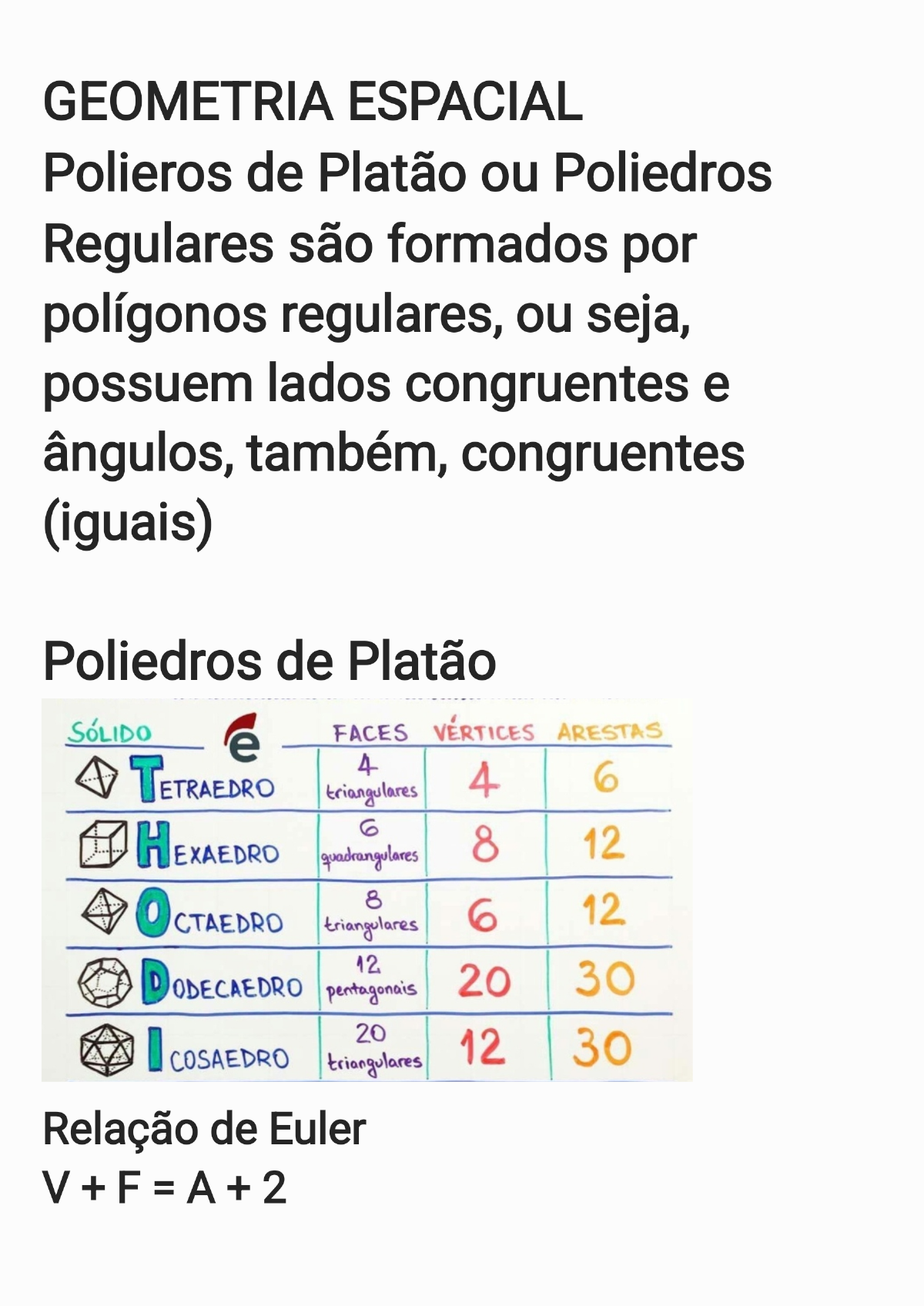 Polieros de Platão ou Poliedros Regulares são formados por polígonos regulares, ou seja, possuem lados congruentes e ângulos, também, congruentes (iguais) Poliedros de Platão e FACES VERTICES ARESTAS 4 triangulares 4 6 6 EXAEDRO quadrangulares 8 12 8 CTAEDRO 6 12 triangulares 12 D ODECAEDRO pentagonais 20 30 20 COSAEDRO triangulares 12 30 Relação de EulerGEOMETRIA ESPACIAL POLIEDROS PRISMAS POLIEDROS } Acesse: Ligado em FORMAS ESPACIAIS CUJAS SUPERFÍCIES SÃO Prof. Lisiane Amplatz Vértice RELAÇÃO DE Aresta EULER PRISMAS DUAS BASES PARALELAS (A V+F=A+2 DEPENDER DO E LATERAIS Face ÁREA LATERAL 3 X DE RETÂNGULO ÁREA LATERAL = 6 X DE RETÂNGULO Alateral = 3.b.h PRISMA DE BASE Alateral = 6.b.h PRISMA DE BASE TRIANGULAR ÁREA BASE 2 X ÁREA DO HEXAGONAL BASE = 2 X ÁREA DO HEXAGONO EQUILÁTERO Abase 2. 4 Abase 4 TOTAL LATERAL ÁREA DA TOTAL = LATERAL DA BASE = base ou BASE ATotal = ABases + ALaterais medida do ATotal = ABases + h altura do lado do h altura do prisma base ou triângulo VOLUME = ÁREA DE UMA BASE X ALTURA DO prisma medida do VOLUME = DE UMA BASE X ALTURA DO equilátero PRISMA lado do PRISMA V = h 4 h ÁREA LATERAL = ÁREA DE RETÂNGULO ÁREA LATERAL X DE RETÂNGULO PRISMA DE BASE Alateral = QUADRADA Alateral = 4.b.h BASE = 2 X DO QUADRADO PARALELEPIPEDO BASE = 2 X ÁREA DO RETÂNGULO Abase = 2.b2 Abase = 2.b.h b TOTAL = ÁREA LATERAL DA (altura) TOTAL = LATERAL DA BASE BASE b base ou altura do ATotal = + ALaterais medida do ATotal = prisma (profundidade) lado do VOLUME ÁREA DE UMA BASE X ALTURA DO a VOLUME ÁREA DE UMA BASE X ALTURA DO quadrado PRISMA (comprimento) PRISMA 1 deGEOMETRIA ESPACIAL POLIEDROS - PIRÂMIDES E POLIEDROS Acesse: Ligado em POLIEDROS DE PLATÃO Prof. Lisiane Amplatz PIRÂMIDES APENAS UMA BASE (A POLIEDROS POSSUI TODAS AS FACES DEPENDER DO E LATERAIS DE PLATÃO FORMADAS POR ÁREA LATERAL X AREA DO TETRAEDRO: OCTAEDRO: DODECAEDRO: ICOSAEDRO: DE FACES 8 FACES 12 FACES 20 FACES Alat 3. TRIANGULARES TRIANGULARES PENTAGONAIS TRIANGULARES BASE QUADRADA 2 4 = altura da BASE = DO QUADRADO face lateral altura da pirâmide Ahase TOTAL = AREA LATERAL + DA BASE ATotal = ABases + ALaterais HEXAEDRO (CUBO): 6 FACES QUADRANGULARES d = diagonal VOLUME = ÁREA DA BASE X ALTURA DA da face do f= medida do lado cubo do (lateral) TOTAL = DOS 6 QUADRADOS base ou medida do 3 A Cubo = 6.12 lado do quadrado ATENÇÃO! As faces VOLUME = DA BASE X ALTURA altura da laterais podem ser face lateral triângulos =13 (triângulo) ou isósceles! Triângulo DIAGONAL DA FACE DO CUBO h altura da medida pirâmide D = diagonal do do lado do DIAGONAL DO CUBO cubo quadrado D = Metade do lado da baseGEOMETRIA ESPACIAL NÃO POLIEDROS - CORPOS REDONDOS Acesse: Ligado em ou SOLIDOS DE REVOLUÇÃO Prof. Lisiane Amplatz NÃO POLIEDROS Gerado a Gerado a partir CILINDRO ESFERA partir da da revolução de Gerado a partir da revolução de um retângulo CONE revolução de um um semicirculo triângulo h altura do g = geratriz cone g geratriz R do R Raio do R = do R círculo da círculo da base base = altura do cilindro Relação Importante: LATERAL = DE UM LATERAL = DOS SETOR TOTAL RETÂNGULO CIRCULAR ALat.Cil. DAS BASES = 2 X DO AREA DAS BASES= 2 X DO VOLUME = DA BASE X ALTURA CÍRCULO CÍRCULO = = = 3 TOTAL = LATERAL TOTAL = LATERAL + DAS BASES DAS BASES ATotal Cone = ATotal.Cil. = VOLUME = DA BASE X ALTURA VOLUME = DA BASE X ALTURA Vcil = = 3GEOMETRIA ESPACIAL TRONGO DE PIRAMIDE DE CONE Ae B A das H B bases R VT = H [A+VAB+B] VT = - 3 H [ R Rr K h a Ab vol - : H A H2 AB VOL h a: Aresta da pirâmide menor Ab H A: Aresta da pirâmide maior h: Altura da pirâmide menor H: Altura da pirâmide maior Ab: de base menor a AB: de base maior AB vol: Volume da pirâmide menor VOL: Volume da pirâmide maior A