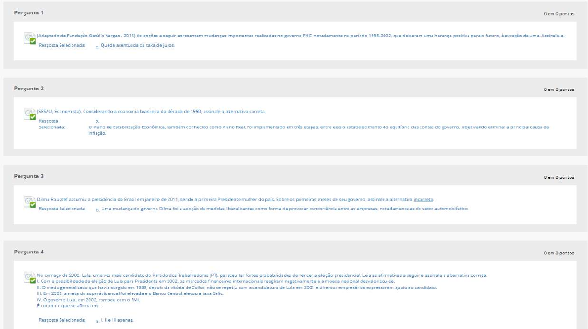 Pergunta 1 (Adaptado de Fundação Vargas 2016) As opções apresentam mudanças importantes realizadas no governo FHC no periodo que uma horança positiva para à do Resposta Selecionada: c Queda acentuada da taxa de juros Pergunta 2 em Considerando a economia brasileira da década de assinale alternativa Resposta b. Selecionada: de Econômica, também conhecido como Plano Real implementado em três entre elas do das contas do objetivando eliminar a principal causa da Pergunta 3 0 em assumiu a do Brasil emjaneiro de 2011. sendo a primeira Presidente muther do Sobre os primeiros meses de seu governo, assinale a alternativa Resposta b. Uma mudança do governo Dilma foi adação de medidas liberalizantes forma de provocar entre as netadamente as do Pergunta 4 No de uma vez mais do Partido dos Trabalhadores pareceur ter fortes probabilidades de vencer presidencial Leia as afirmativas seguir assinale a alternativa 1. Com possibilidade da eleição de Lula para Presidente em mercados financeiros internacionais reagiram negativamente moeda nacional medo generalizado que surgido em depois de não repetiu candidatura de Lule em 2001 diversos empresários expressaram Em a mete do superávit anual foi Central Selic IV. governo em com É o que se afirma em: Resposta Selecionada:Pergunta 5 0 em 0 pontos No seu discurso de posse como Presidente da e dirigindo-se ao Congresso de Mello "Conhecem Vossas Excelências a agenda de medidas básicas com que encetarei nossa estratégia de da praga Não poderemos edificar a estabilização financeira sem sanear, antes de as finanças do imperativo equilibrar o orçamento que supõe reduzir drasticamente os gastos públicos. Para atingir equilíbrio orçamentário é preciso adequar o tamanho da máquina estatal à verdade da receita. Mas isso não acabar com a concessão de com a definição de privilégios que, independentemente de seu são incompatíveis com a receita do No momento em que lograrmos esse equilíbrio o que ocorrerá com certeza teremos dado um passo gigantesco na luta contra a dispensando frenesi das emissões e controlando lançamento de títulos da dívida Tudo Senhores possui como premissa maior uma estratégia global de reforma do Para obter seu saneamento empreenderei sua reforma: fiscal, patrimonial e administrativa A dura verdade é que, no Brasil dos anos o Estado não só comprometeu suas mas perdeu também sua utilidade histórica como investidor complementar. Estado não apenas perdeu sua capacidade de investir, que é ainda mais por seu comportamento errático e perverso, passou a inibir o investimento nacional e estrangeiro". Nesse discurso e em relação à reforma pretendida do pode-se apreender que a equipe econômica de de Mello: Diagnosticou que a crise brasileira tinha origem na crise fiscal do II. Diagnosticou que Estado só conseguia se financiar através do processo inflacionário ou através da emissão de títulos de divida pública. III. Diagnosticou que Estado ao Estado apenas a responsabilidade de investir complementarmente à iniciativa privada. correto afirmar que: Resposta Selecionada: Todas as afirmativas estão Pergunta 6 0 em pontos No seu discurso de posse como Presidente da e dirigindo-se ao Congresso de Mello "[A] perversão das funções estatais agravada por singular na capacidade extrativa do Estado exige que se com toda a o papel do aparelho estatal entre Meu pensamento, neste ponto, é muito simples. Creio que compete primordialmente à livre-iniciativa não ao Estado criar riqueza e dinamizar a Ao Estado corresponde planejar sem dirigismo desenvolvimento e assegurar a justiça no sentido amplo e substantivo do termo. Estado deve ser apto, permanentemente apto, a garantir acesso das pessoas de renda a determinados bens Deve acesso à à à à educação e ao transporte coletivo a quantos deles dependam para alcançar ou manter uma existência digna, num contexto de iguais oportunidades pois outra coisa não é a entendida como dinâmica social da liberdade de todos e para assim, o Estado não como mas como promotor do bem- estar a convicção de que a economia de mercado é forma comprovadamente superior de geração de de desenvolvimento intensivo e a certeza de que, no plano internacional são as economias abertas as mais eficientes e competitivas, além de oferecerem bom nível de vida aos seus com melhor distribuição de Não a nenhum preconceito colonial ante capital estrangeiro. Ao contrário: tornaremos o uma vez hospitaleiro em relação a ele. é sem Não nos a ideia de discriminar nem contra nem a favor dos capitais mas esperamos que não falte seu concurso para a diversificação da a ampliação do emprego e a transferência de tecnologia em proveito do Neste e em relação ao papel do Estado na pode-se apreender que: Era seu objetivo a redução do Estado dentro da perspectiva de Estado II. Era seu objetivo promover bem-estar social através da adoção de mecanismos de controle da inclusive para cumprir papel de gerador de renda e III. Era objetivo eliminar grande parte das barreiras ao Assinale a alternativa correta. Resposta Selecionada: b. Apenas a afirmativa estáPergunta 7 Qual era, o diagnóstico da causa da inflação nos planos Bresser e Verão? Resposta inarcial c de Pergunta 8 0 em pontos Segundo colunista da Folha de no époco (do o presidente o primeiro depois de anos de ditadura por um grupo de do PUC do o serviu para Sorney chefia do governo que tinha o poder em março de 1985, depois da ocorrido com Tancredo No inicio, plano foi um sucesso presidente então ministro Fazenda, Dilson se da Nova plano meses. Em novembro, seis dias de governo ter alcançado uma nos umas o for substituido pelo Cruzado que decretou fim do de preços de Cruzado torno o maior plano de estelionato da do Entre as medidas adotadas pelo Plano não se inclui: Resposta Selecionada: a adoção do dólar como padrão para reajustes de contratos de financiamento a longo prazo, e apenas a longo prazo. Pergun