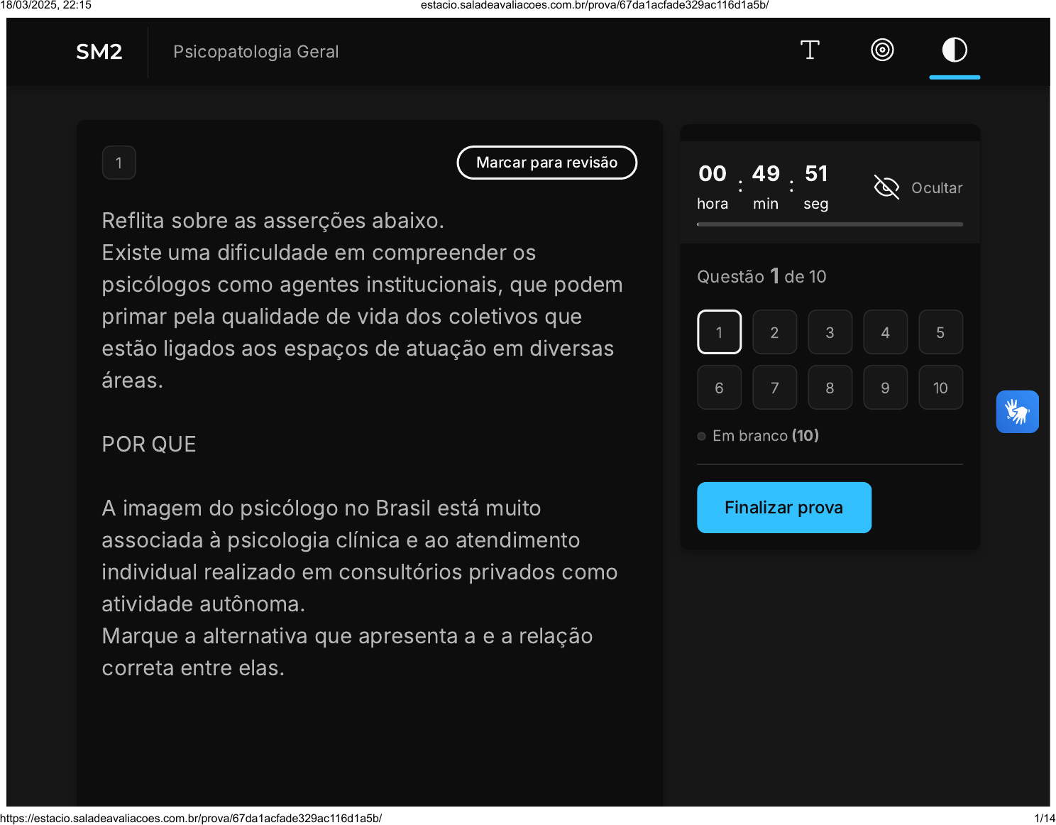 1 Marcar para revisão Reflita sobre as asserções abaixo. Existe uma dificuldade em compreender os psicólogos como agentes institucionais, que podem primar pela qualidade de vida dos coletivos que estão ligados aos espaços de atuação em diversas áreas. POR QUE A imagem do psicólogo no Brasil está muito associada à psicologia clínica e ao atendimento individual realizado em consultórios privados como atividade autônoma. Marque a alternativa que apresenta a e a relação correta entre elas. 00 hora : 49 min : 51 seg Ocultar Questão 1 de 10 Em branco (10) Finalizar prova 1 2 3 4 5 6 7 8 9 10 SM2 Psicopatologia Geral 18/03/2025, 22:15 estacio.saladeavaliacoes.com.br/prova/67da1acfade329ac116d1a5b/ https://estacio.saladeavaliacoes.com.br/prova/67da1acfade329ac116d1a5b/ 1/14 A B C D E As duas asserções são verdadeiras, e a segunda é uma justificativa correta da primeira. As duas asserções são verdadeiras, mas a segunda não é uma justificativa correta da primeira. A primeira asserção é uma proposição falsa, e a segunda é uma proposição verdadeira. A primeira asserção é uma proposição verdadeira, e a segunda é uma proposição falsa. Tanto a primeira como a segunda asserções são falsas. 2 Marcar para revisão 18/03/2025, 22:15 estacio.saladeavaliacoes.com.br/prova/67da1acfade329ac116d1a5b/ https://estacio.saladeavaliacoes.com.br/prova/67da1acfade329ac116d1a5b/ 2/14 A B C D E Frente aos crescentes índices de suicídio em todo o mundo, a OMS pensou em três áreas prioritárias para o desenvolvimento de atividades preventivas ao suicídio. Entre as orientações da Organização Mundial de Saúde identifica-se a Medicalização de pessoas com transtornos mentais Informação sobre os métodos de suicídio nos meios de comunicação. Restrição de acesso a métodos utilizados para comportamentos suicidas. Internação de pacientes com risco suicida. Restrição de palestras e informações sobre suicídio ao público. 18/03/2025, 22:15 estacio.saladeavaliacoes.com.br/prova/67da1acfade329ac116d1a5b/ https://estacio.saladeavaliacoes.com.br/prova/67da1acfade329ac116d1a5b/ 3/14 A B C 3 Marcar para revisão O suicídio é um problema complexo e difícil de predizer, resultado da interação de múltiplos fatores biológicos, psicológicos e sociais. Consenso sobre esse tópico define o suicídio como o modo intencional de colocar fim à própria vida. Com relação ao suicídio, assinale a alternativa correta. Os profissionais de saúde que não conseguiram prever que seus pacientes estavam prestes a cometer tal ato, negligenciaram seus pacientes. É determinado sempre por estados alterados de consciência. Quem diz que vai se matar, realmente não o faz. 18/03/2025, 22:15 estacio.saladeavaliacoes.com.br/prova/67da1acfade329ac116d1a5b/ https://estacio.saladeavaliacoes.com.br/prova/67da1acfade329ac116d1a5b/ 4/14 D E A B Os meios de comunicação não deveriam veicular notícias sobre o assunto. A Organização Mundial de Saúde atesta que está entre as dez principais causas de morte na maioria dos países. 4 Marcar para revisão Tendo em vista os crescentes índices de suicídio em todo o mundo, a OMS considera tal problemática uma questão de saúde pública. Marque a alternativa que apresenta alguns fatores de risco para o ato suicida apontados pela OMS. Tentativa prévia de suicídio, isolamento social e crise financeira e/ou desemprego. Isolamento social, uso de psicotrópicos e uso abusivo de drogas. 18/03/2025, 22:15 estacio.saladeavaliacoes.com.br/prova/67da1acfade329ac116d1a5b/ https://estacio.saladeavaliacoes.com.br/prova/67da1acfade329ac116d1a5b/ 5/14 C D E Fácil acesso a métodos suicidas, uso abusivo de álcool e personalidade antissocial. Separação conjugal, transtorno psiquiátrico e timidez. Tendências impulsivas, isolamento social e falta de interesses artísticos. 5 Marcar para revisão Durante os séculos de sua existência, os hospitais psiquiátricos abrigaram não somente os doentes mentais, mas todos os indesejados pela sociedade. Entre eles é possível destacar: Analise as afirmativas a seguir. I. Homossexuais e presos políticos. II. Crianças abandonadas e adolescentes rebeldes. III. Trabalhadores bem adaptados ao sistema fabril. IV. Mulheres não recatadas, meninas que engravidavam antes do casamento e prostitutas. 18/03/2025, 22:15 estacio.saladeavaliacoes.com.br/prova/67da1acfade329ac116d1a5b/ https://estacio.saladeavaliacoes.com.br/prova/67da1acfade329ac116d1a5b/ 6/14 A B C D E Assinale a alternativa que contenha as afirmativas corretas. I, II e IV estão corretas. I, II e III estão corretas. I, III e IV estão corretas. II, III e IV estão corretas. I e IV estão corretas. 6 Marcar para revisão Mulher, 30 anos, nega uso de medicação, uso de álcool e drogas ilícitas, buscou atendimento com queixa de insônia, aumento excessivo de irritabilidade, heteroagressividade, com aumento dos gastos em razão de compras exageradas de bens 18/03/2025, 22:15 estacio.saladeavaliacoes.com.br/prova/67da1acfade329ac116d1a5b/ https://estacio.saladeavaliacoes.com.br/prova/67da1acfade329ac116d1a5b/ 7/14 A B C D E supérfluos e aumento da libido. De acordo com o relato, trata-se de um quadro compatível com: Assinale a alternativa correta: Transtorno decorrente do uso de cocaína. Esquizofrenia Mania Demência precoce Delirium 7 Marcar para revisão O processo de diagnóstico diferencial pode ser estabelecido com base na diferenciação, seguida da exclusão de outros adoecimentos. 18/03/2025, 22:15 estacio.saladeavaliacoes.com.br/prova/67da1acfade329ac116d1a5b/ https://estacio.saladeavaliacoes.com.br/prova/67da1acfade329ac116d1a5b/ 8/14 A B C D E Desta maneira, quanto à realização do diagnóstico diferencial, marque a alternativa correta. É uma ciência médica, de uso exclusivo do psiquiatra, com objetivo de realizar diagnósticos. Uma ferramenta que amplia a gama de diagnósticos psiquiátricos. É um método sistematizado para, a par