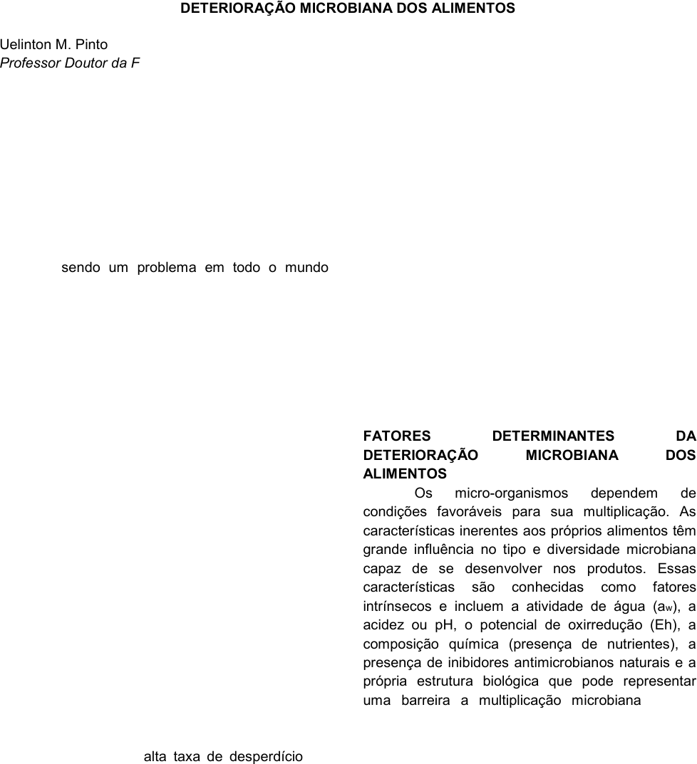 1 DETERIORAÇÃO MICROBIANA DOS ALIMENTOS Uelinton M. Pinto Professor Doutor da Faculdade de Ciências Farmacêuticas - Universidade de São Paulo, USP Mariza Landgraf Professora Associada da Faculdade de Ciências Farmacêuticas - Universidade de São Paulo, USP Bernadette D.G.M. Franco Professora Titular da Faculdade de Ciências Farmacêuticas - Universidade de São Paulo, USP INTRODUÇÃO A deterioração microbiana dos alimentos continua sendo um problema em todo o mundo, apesar da diversidade de técnicas de conservação disponíveis e da busca contínua por melhorias nos processos de produção, estocagem e distribuição dos alimentos. Os desafios enfrentados pelo setor alimentício vão desde o plantio em polos agrícolas, passando pela distribuição em centros urbanos distantes, até o consumidor final. A complexidade da cadeia produtiva de alimentos requer mais profissionalização do setor, maior nível de controle em todas as etapas de produção e educação do consumidor para reduzir as oportunidades de acesso desses aos alimentos. Além do impacto direto gerado pelas perdas dos alimentos por deterioração, é importante considerar o impacto gerado pela produção de alimentos sobre o meio ambiente, especialmente sobre a utilização de água, ocupação de terra, pegada de carbono e potencial impacto sobre a biodiversidade1. Segundo dados da Food and Agriculture Organization (FAO) (2011)2, aproximadamente 1/3 de todos os alimentos destinados ao consumo humano são perdidos em todo o mundo, o que equivale a uma quantidade de 1,3 bilhões de toneladas de alimentos desperdiçadas anualmente. As razões para essa alta taxa de desperdício são diversas e os alimentos são descartados ou perdidos durante toda a cadeia de produção, iniciando no campo até o consumidor final. O entendimento dos processos relacionados à deterioração microbiana dos alimentos, em especial as alterações químicas provocadas pelos micro-organismos, é essencial para a busca por métodos eficazes de preservação. Com a demanda global por sustentabilidade em todos os elos produtivos, a cadeia produtora de alimentos necessita minizar as perdas na produção, melhorar a produtividade do setor alimentício em todo o mundo, sem perder o foco no oferecimento de alimentos com qualidade e segurança para a população. Esse capítulo irá discutir as alterações provocadas pelos micro-organismos, inicialmente abordando os fatores determinantes relacionados aos processos de deterioração, seguindo por uma abordagem sobre as alterações químicas e sensoriais provocadas por bactérias, fungos filamentosos (bolores) e leveduras e terminando com uma discussão sobre a deterioração por grupos alimentícios específicos. FATORES DETERMINANTES DA DETERIORAÇÃO MICROBIANA DOS ALIMENTOS Os micro-organismos dependem de condições favoráveis para sua multiplicação. As características inerentes aos próprios alimentos têm grande influência no tipo e diversidade microbiana capaz de se desenvolver nos produtos. Essas características são conhecidas como fatores intrínsecos e incluem a atividade de água (aw), a acidez ou pH, o potencial de oxirredução (Eh), a composição química (presença de nutrientes), a presença de inibidores antimicrobianos naturais e a própria estrutura biológica que pode representar uma barreira a multiplicação microbiana. Já os fatores extrínsecos, relacionados ao ambiente em que o alimento está exposto, também são importantes para multiplicação dos micro- organismos, sendo exemplificados pela temperatura, umidade relativa de equilíbrio e a atmosfera gasosa. Os materiais das embalagens e a exposição à luz também podem influenciar nos processos de deterioração, assim como a qualidade da matéria-prima e dos ingredientes e as condições higiênicas do processamento3. Apesar dos vários fatores que afetam o desenvolvimento microbiano, os micro-organismos apresentam alta capacidade de adaptação, havendo grupos especializados para crescimento, de acordo com a disponibilidade de água, acidez do meio, composição química, potencial de oxirredução e temperatura. Além dessas características, eles são mireya_rizo Realce mireya_rizo Realce mireya_rizo Realce mireya_rizo Realce mireya_rizo Realce 2 capazes de interagir uns com os outros de forma positiva ou antagônica, por meio da produção de metabólicos e moléculas sinalizadoras, influenciando nos processos de deterioração4,5. A atividade de água é a quantidade de água disponível para crescimento microbiano e outras funções biológicas como reações enzimáticas e químicas. Esta não deve ser confundida com a umidade do alimento, pois a água disponível ou livre depende das interações com os componentes dos alimentos, não apresentando, necessariamente, uma relação direta com a umidade do produto6,7. A aw dos alimentos é fator determinante no potencial de deterioração dos mesmos, sendo que a humanidade utiliza a desidratação há milhares de anos como forma de aumentar a vida útil de diversos alimentos. A redução da aw dos produtos alimentícios pode ser obtida por diversos mecanismos como a desidratação pelo calor (secagem), desidratação a frio e a vácuo pelo processo de liofilização, adição de solutos como sal ou açúcar, dentre outros. Portanto, alimentos com aw alta, como os produtos frescos, tendem a se deteriorar mais rapidamente que aqueles com baixo conteúdo de água disponível, devido à multiplicação acelerada das bactérias. Cada micro-organismo apresenta valores mínimos, ótimos e máximos de aw para seu desenvolvimento. Geralmente a maioria das bactérias deterioradoras não cresce bem em aw inferior a 0,91; já o mesmo grupo de leveduras inicia crescimento em aw de 0,88, enquanto que os bolores podem deteriorar produtos com aw superior a 0,808. A diminuição da aw de um alimento provoca um aumento na fase lag do crescimento microbiano, uma dimi