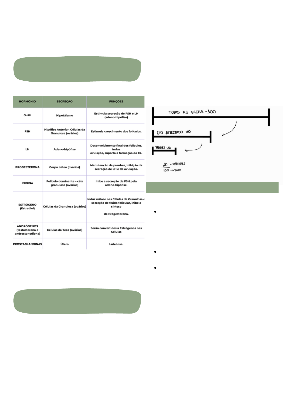 Relembrando os hormônios: Tudo começa no hipotálamo, produz GnRH (hormônio proteíco liberador de gonadotrofina). O LH estimula a adeno hipófise Biotecnologia da reprodução manipulação hormonal do ciclo estral conceitos sobre eficiência reprodutiva O sucesso do sistema de criação está relacionado ao sucesso de reprodução dos animais Taxa de serviço (TS): % de fêmeas que são detectadas no cio (ou seja, de todas as fêmeas que tenho, quantas dela consigo detectar o cio) Taxa de concepção (TC): % de fêmeas que ficam prenhes após terem inseminadas 1x Taxa de prenhez: TS X TC (relação entre de quantas fêmeas tinha no plantel no cio X quantas ficaram prenhes) Taxa de serviço: Principais fatores que influenciam: identificação dessa fêmea no cio: quanto mais o cio dura, os sinais, como se manifesta. Observar a fêmea (mugir mais, monta, muco) para reconhecer precisa de alguém olhando saúde da fêmea: qualidade dos gametas, se tem endometrite outras doenças O sistema de reprodução só vai funcionar se tiver um sistema de reprodução (eficiência reprodutiva) Indução: escolher fêmea que estava em anestro e estimular essa fêmea a ciclar (entrar no estro) pode fazer com hormônio ou prática de manejo Sincronização: pega várias fêmeas que estão ciclando (cada uma em seu momento) e com hormônio faz com que todas ciclem igualmente nesse momento https://classroom.google.com/c/NzM2OTkyNjQwMTYz https://classroom.google.com/c/NzM2OTkyNjQwMTYz 2 Ponto de sincronização: sincronizar o ciclo (ou seja, todas vão estar na mesma fase reprodutiva mais ou menos ao mesmo tempo) sincronizar o momento da ovulação, é muito mais específico (vão ovular no mesmo dia) Os hormônios usados para isso são os mesmo que já estão no organismo da fêmea, ao aplicar nela esse hormônio vai fazer a exata função que o do corpo faz (ex: prostaglandina → luteólise) Protocolo hormonal→ tem que fazer exatamente o mesmo em todas as fêmeas do plantel (mesmo que algumas não precisem de hormônio vão receber igual as outras). O protocolo deve ser construído para que no final 90% delas esteja ovulando Progesterona→ produzida no corpo lúteo, no eixo faz feedback negativo, sempre que tem progesterona alta não vai ter desenvolvimento folicular e ovulação. Então se aplicar enquanto ela estiver em onda folicular →induzir atresia folicular na onda e degeneração. Precisa de que a progesterona fique alguns dias no organismo da fêmea Implante de progesterona e deixa por 9-10 dias, tempo suficiente para manter o nível alto e a onda que estava subindo sofreu degeneração folicular implante subcutâneo (orelha ou tábua interna de pescoço) menos usado por ser muito invasivo implante vaginal, feito de silicone impregnado de progesterona, coloca com um aplicador, fica com um fio pendurado, libera a progesterona e é absorvido pela mucosa vaginal, dá para ser reutilizado Prostaglandina→ injeção IM, não funciona no metaestro, ( aplica em 2 doses com um intervalo de 4-5 dias de diferença, pq se a primeira dose caiu no metaestro a segunda dose vai cair em um diestro e aí vai fazer lise de corpo lúteo→ ter garantia de que em alguma das 2 doses vão cair no dia certo ) Estrógeno→ pode ter mais de uma função no organismo (função biológica normalmente é liberado quando o folículo já está bem grande e faz feedback positivo em hipotálamo e hipófise ) pode ser usado como indutor INDIRETO de ovulação ao aplicar estrógeno e junto com isso uma alta concentração de progesterona vai ajudar na degeneração folicular (ajuda na atresia folicular→ vai ser mais rápido) Gonadotrofina→ estimular a onda e desenvolvimento folicular, com o uso a longo prazo a fêmea cria anticorpo→ começa a não ter resposta tão boa protocolo→ coloca implante de progesterona e no mesmo dia da estrógeno (para fazer degeneração e indutor indireto de luteólise), um dia antes de tirar o implante da gonadotrofina e depois de 3 dias aplica GnRH para fazer ter um pico de LH e a fêmea vai ovular em 16 horas conceitos sobre ia e iatf Pirâmide de biotécnicas: Inseminação artificial: é a biotécnica onde mais ocorre melhoramento genético. Ferramenta reprodutiva engliba a colheita do sêmen, análise, processamento e manutenção até a introdução no aparelho genital da fêmea por meio de recursos artificiais gerando a concepção Vantagens: controle da transmissão de doenças infecto-contagiosas que aconteceriam na monta natural (ex: brucelose, tuberculose, tricomoníase) Incremento do melhoramento genético e da produção animal devivo ao maior número de descendentes por reprodutor aprimoramento do controle zootécnico (encurtamento da estação reprodutiva e concentração de partos sempre fazer o protocolo ao contrário, escolhe o dia que vai inseminar e aí começa a construir de trás para frente racionalização do manejo reprodutivo (sem necessidade de ter touros na propriedade, formação de banco de germoplasma, prevenção de acidentes, possibilidade de usar animais que já morreram e amortização mais rápida do reprodutor) Desvantagens: má escolha do touro processamento errado do sêmen armazenamento incorreto redução da variabilidade genética sucesso depende da detecção de cio falta de higiene pode predispor a doenças Em fêmeas não sincronizadas se o cio ocorrem pela manhã inseminar a tarde, já se o cio for pela tarde inseminar na manhã seguinte Técnica de IA: 1.Colheita do sêmen 2.Avaliação do sêmens 3.processamento (congelação/refrigeração) 4. manipulação (sexagem) 5. técnica de IA O sêmen deve ser descongelado a 35°C em 30 segundos (palheta fina ou média) A plaheta deve ser montada no aplicador universal, inseminar com auxílio da palpação retal Limpeza do reto e região perivulvar, introduzir aplicador via vaginal transpassando os anéis cervicais. Depositar o sêmen no corpo do útero e depois massagear o clitóris Devemos