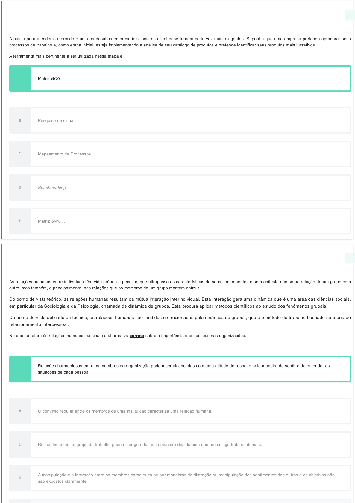 A busca para atender o mercado é um dos desafios empresariais, pois os clientes se tornam cada vez mais exigentes. Suponha que uma empresa pretenda aprimorar seus processos de trabalho e, como etapa inicial, esteja implementando a análise de seu catálogo de produtos e pretende identificar seus produtos mais lucrativos. A ferramenta mais pertinente a ser utilizada nessa etapa é: A Matriz BCG. Resposta correta Questão 1 Questão objetiva 1 /1 B Pesquisa de clima. C Mapeamento de Processos. D Benchmarking. E Matriz SWOT. As relações humanas entre indivíduos têm vida própria e peculiar, que ultrapassa as características de seus componentes e se manifesta não só na relação de um grupo com outro, mas também, e principalmente, nas relações que os membros de um grupo mantêm entre si. Do ponto de vista teórico, as relações humanas resultam da mútua interação interindividual. Esta interação gera uma dinâmica que é uma área das ciências sociais, em particular da Sociologia e da Psicologia, chamada de dinâmica de grupos. Esta procura aplicar métodos científicos ao estudo dos fenômenos grupais. Do ponto de vista aplicado ou técnico, as relações humanas são medidas e direcionadas pela dinâmica de grupos, que é o método de trabalho baseado na teoria do relacionamento interpessoal. No que se refere às relações humanas, assinale a alternativa correta sobre a importância das pessoas nas organizações. A Relações harmoniosas entre os membros da organização podem ser alcançadas com uma atitude de respeito pela maneira de sentir e de entender as situações de cada pessoa. Resposta correta Questão 2 Questão objetiva 1 /1 B O convívio regular entre os membros de uma instituição caracteriza uma relação humana. C Ressentimentos no grupo de trabalho podem ser gerados pela maneira ríspida com que um colega trata os demais. D A manipulação e a interação entre os membros caracteriza-se por manobras de distração ou manipulação dos sentimentos dos outros e os objetivos não são expostos claramente. E Pessoas com estilo agressivo conseguem respeito dos demais membros da equipe e, geralmente, estão abertos à negociação. A matriz ou análise SWOT é uma abreviação das palavras em inglês strengths, weaknesses, opportunities e threats, que significam respectivamente forças, fraquezas, oportunidades e ameaças, respectivamente. No Brasil, ela é conceituada de “análise FOFA”, seguindo o acrônimo de forças, oportunidades, fraquezas e ameaças. Ela é considerada uma das mais poderosas ferramentas do planejamento e estratégia de uma empresa. Assinale a alternativa que demonstre o que a influência dos fatores externos podem gerar quando eles são analisados de forma positiva por esta ferramenta. A Oportunidades. Resposta correta Questão 3 Questão objetiva 1 /1 B Forças. C Fraquezas. D Ameaças. E Armadilhas. As empresas estão sempre abertas para novidades, assim, elas buscam constantemente informações sobre novas ferramentas ou outras formas de uso das que ela possui internamente para aplicar de maneira mais eficiente. A respeito destas ferramentas, assinale a opção que demonstre a ferramenta utilizada para gerar trocas de ações e metodologias de sucesso entre organizações: A Benchmarking. Resposta correta Questão 4 Questão objetiva 1 /1 B Análise SWOT. C Gestão de Pessoas. D Brainstorming. E Gestão de Processos. A empresa é um sistema de processos organizacionais correlacionados e interligados com vistas a exercer uma atividade produtiva que atenda às necessidades do cliente. Para uma execução eficiente destes processos, a Administração sugere que a empresa esteja organizada em três níveis organizacionais, respeitando uma hierarquia que desempenhará funções diferentes, do planejamento à execução dos mesmos. O Nível de Planejamento de uma organização responsável pela definição do planejamento a longo prazo e pelo levantamento de demandas externas é o: A Estratégico. Resposta correta Questão 5 Questão objetiva 1 /1 B Operacional. C Tático. D Gerencial. E Estrutural. A gestão das organizações são facilitadas através das ferramentas e técnicas de suporte, consideradas como instrumentos pelos quais se torna possível controlar as melhorias implantadas em qualquer empresa. Cada ferramenta possui características específica e muitas vezes estão relacionadas a setores ou ações específicas. Assinale a alternativa que demonstre a ferramenta utilizada para a geração de ideias entre um grupo de pessoas. A Brainstorming. Resposta correta Questão 6 Questão objetiva 1 /1 B Reunião de equipe. C Endomarketing.. D Benchmarking. E Matriz SWOT. As organizações contemporâneas estão em constante mudanças, seja para adequações para seus mercados, seus colaboradores ou para planejar seu futuro na frente dos concorrentes. Para se manter atualizada e traçar estratégias inovadores ela utiliza diversas ferramentas, sendo uma das ferramentas mais difundidas a Matriz SWOT. Assinale a alternativa que demonstre a função desta ferramenta: A Representa, graficamente, os aspectos internos identificados a partir do diagnóstico institucional (forças e fraquezas) e os aspectos externos (ameaças e oportunidades). Resposta correta Questão 7 Questão objetiva 1 /1 B Apontar as competências necessárias para os objetivos perseguidos pela organização e as contrapõem àquelas efetivamente disponíveis, indicando a lacuna existente. C Corresponde a um diagrama de causas e efeitos das falhas identificadas na organização, voltado à elaboração de metas e indicadores. D Apresenta uma comparação estruturada dos principais aspectos da organização com referenciais de entidades de qualidade reconhecida (benchmarkings). E Corresponde a um gráfico de barras verticais (histograma) que permite identificar os fatores críticos a serem enfrentados para o aprimoramento dos processos de trabalho. Um dos desafios ma