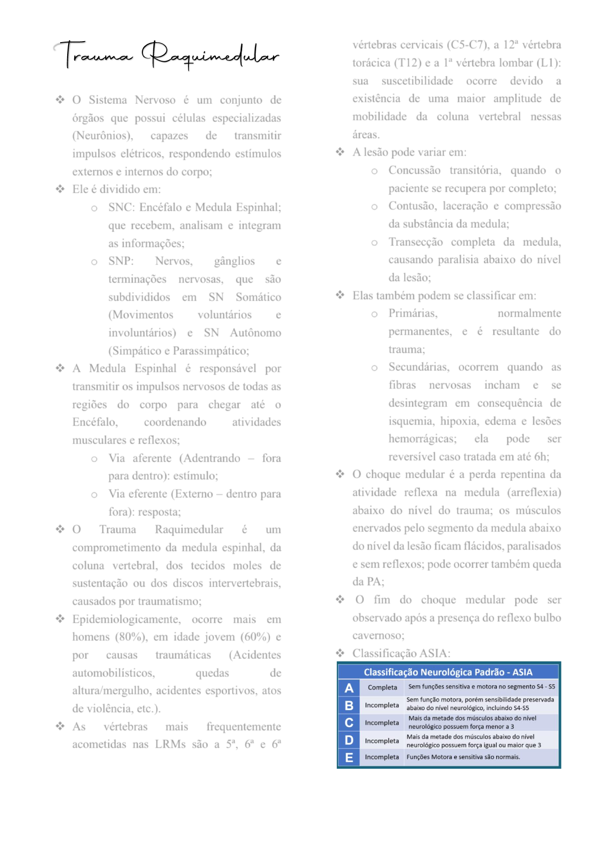 Feito por Luana Arruda Soares Acadêmica de Enfermagem – UECE (luana.arruda@aluno.uece.br) ❖ O Sistema Nervoso é um conjunto de órgãos que possui células especializadas (Neurônios), capazes de transmitir impulsos elétricos, respondendo estímulos externos e internos do corpo; ❖ Ele é dividido em: o SNC: Encéfalo e Medula Espinhal; que recebem, analisam e integram as informações; o SNP: Nervos, gânglios e terminações nervosas, que são subdivididos em SN Somático (Movimentos voluntários e involuntários) e SN Autônomo (Simpático e Parassimpático; ❖ A Medula Espinhal é responsável por transmitir os impulsos nervosos de todas as regiões do corpo para chegar até o Encéfalo, coordenando atividades musculares e reflexos; o Via aferente (Adentrando – fora para dentro): estímulo; o Via eferente (Externo – dentro para fora): resposta; ❖ O Trauma Raquimedular é um comprometimento da medula espinhal, da coluna vertebral, dos tecidos moles de sustentação ou dos discos intervertebrais, causados por traumatismo; ❖ Epidemiologicamente, ocorre mais em homens (80%), em idade jovem (60%) e por causas traumáticas (Acidentes automobilísticos, quedas de altura/mergulho, acidentes esportivos, atos de violência, etc.). ❖ As vértebras mais frequentemente acometidas nas LRMs são a 5ª, 6ª e 6ª vértebras cervicais (C5-C7), a 12ª vértebra torácica (T12) e a 1ª vértebra lombar (L1): sua suscetibilidade ocorre devido a existência de uma maior amplitude de mobilidade da coluna vertebral nessas áreas. ❖ A lesão pode variar em: o Concussão transitória, quando o paciente se recupera por completo; o Contusão, laceração e compressão da substância da medula; o Transecção completa da medula, causando paralisia abaixo do nível da lesão; ❖ Elas também podem se classificar em: o Primárias, normalmente permanentes, e é resultante do trauma; o Secundárias, ocorrem quando as fibras nervosas incham e se desintegram em consequência de isquemia, hipoxia, edema e lesões hemorrágicas; ela pode ser reversível caso tratada em até 6h; ❖ O choque medular é a perda repentina da atividade reflexa na medula (arreflexia) abaixo do nível do trauma; os músculos enervados pelo segmento da medula abaixo do nível da lesão ficam flácidos, paralisados e sem reflexos; pode ocorrer também queda da PA; ❖ O fim do choque medular pode ser observado após a presença do reflexo bulbo cavernoso; ❖ Classificação ASIA: Feito por Luana Arruda Soares Acadêmica de Enfermagem – UECE (luana.arruda@aluno.uece.br) ❖ Manifestações clínicas: o Sinal cardinal (processo inflamatório); o Alteração de sensibilidade e/ou força muscular; o Priapismo (ereção contínua); o Aumento dos reflexos tendinosos profundos e tônus muscular; o Respostas extensora plantar (dedo do pé para cima); o Clônus (contrações musculares involuntárias, rítmicas e rápidas); o Reflexo de Hoffmann; ❖ Plegia, conhecida por “paralisia” é a perda total da capacidade de movimentar um ou mais membros (perda da contração muscular voluntária) o Monoplegia: apenas um membro; o Diplegia: dois membros; o Paraplegia: membros inferiores; o Tetraplegia: quatro membros; o Hemiplegia: paralisia dos membros superior e inferior do mesmo lado; ❖ Paresia é a diminuição da força e da sensibilidade em um ou mais grupos musculares, é um grau menor de paralisia o Monoparesia: Perda da força dos nervos ou músculos de um só membro; o Diparesia: Perda de força do nervo ou músculo dos dois membros inferiores; o Hemiparesia: Perda de força do nervo ou músculo de um membro superior e inferior do mesmo lado; o Tetraparesia: Perda de força do nervo ou músculo dos quatro membros; ❖ Processo de Enfermagem: o Condição geral; o Complicações: ▪ Paralisia ou paresia dos membros; ▪ Alteração dos tônus muscular; ▪ Alteração dos reflexos superficiais e profundos; ▪ Alteração ou perda das diferentes sensibilidades; ▪ Perda do controle esfincteriano; ▪ Disfunção sexual; ▪ Alterações autonômicas como vasoplegia (diminuição da resistência vascular); ▪ Alteração da sudorese; ▪ Controle de temperatura; o Anamnese; o Exame físico; ❖ Diagnósticos, resultados e intervenções de Enfermagem: o Mobilidade física prejudicada, no leito, relacionada a perda da função motora ▪ Resultado: Mobilidade; ▪ Intervenções: Aumento da mobilidade; fortalecimento muscular; prevenir diminuição da massa corporal magra, redução da densidade mineral óssea e aumentar IMC; o Risco de síndrome do desuso ▪ Intervenções: Prevenir atrofia; realizar exercícios de amplitude de movimento; o Risco de integridade da pele prejudicada, relacionada com a perda sensorial permanente e a imobilidade; ▪ Resultado: Manutenção de pede intacta e saudável; ▪ Intervenções: Monitorar quanto ao surgimento de abrasões e feridas; Feito por Luana Arruda Soares Acadêmica de Enfermagem – UECE (luana.arruda@aluno.uece.br) o Eliminação urinária alterada, relacionada com o nível da lesão; ▪ Resultado: Controle vesical sem infecção; ▪ Intervenções: Melhora do controle da bexiga; realizar o esvaziamento controlado da bexiga; orientar sobre o autocuidado; o Constipação intestinal, relacionada com efeitos da ruptura da medula espinhal; ▪ Resultado: Controle intestinal; ▪ Intervenções: Orientar sobre os sintomas de impactação. Realizar alterações na dieta, se necessário; o Disfunção sexual, relacionada com a disfunção neurológica; ▪ Resultado: Expressão sexual; ▪ Intervenções: Aconselhamento sobre a expressão sexual; orientar sobre técnicas e posições especiais para a exploração das sensações corporais; informar sobre o uso de próteses e medicamentos; orientar sobre o uso de contraceptivos (e riscos de TEV); o Enfrentamento inefetivo, relacionado com o impacto da incapacidade sobre as atividades da vida diária; ▪ Resultados: Fortaleci