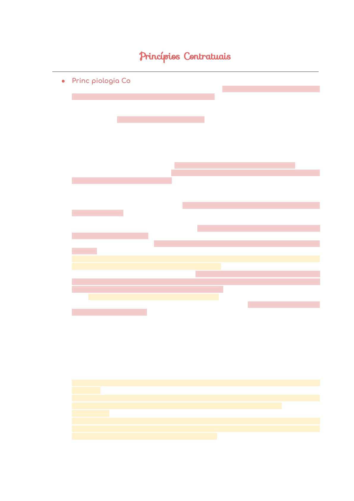Princípios Contratuais ● Principiologia Contratual: ↳ Os princípios podem ser explicados como regramentos básicos que são aplicados a um determinado instituto jurídico, nesse caso os contratos. ↳ Eles são “gerados” das normas, costumes, doutrinas jurisprudência e aspectos sociais, políticos e econômicos. ↳ Podem estar expressos na norma ou não. ↳ São elementos caracterizadores do pós-constitucionalismo: a) força normativa da CF; b) força normativa dos princípios; c) cláusula gerais (conceitos abertos) para a formulação do ordenamento. ↳ Desses caracterizadores, decorre a teoria da aplicação horizontal dos direitos fundamentais, ou seja, a aplicação desses às relações privadas. ↳ Os princípios do Código Civil não são aplicados somente aos contratos, mas no ordenamento como um todo. ● Princípio da Autonomia Privada: ↳ A declaração de vontade é o elemento central e mais característico do negócio jurídico. ↳ Liberdade de contratar: liberdade plena para celebrar pactos e avenças com determinadas pessoas; ligado com a escolha do indivíduo com quem o contrato será celebrado. ↳ Liberdade contratual: autonomia para escolher o conteúdo do negócio jurídico. ↳ Liberdade de contratar + Liberdade contratual = AUTONOMIA PRIVADA → liberdade para regular seus próprios interesses (não é absoluta). ↳ Dessa forma, autonomia privada é o poder que os particulares possuem de regular, pelo exercício de sua vontade, as relações que participam, estabelecendo o conteúdo e a disciplina jurídica - Francisco Amaral. ↳ É o princípio mais importante do Código Civil. ↳ Como dito anteriormente, não é absoluto, pois a função social reduz o alcance desse princípio. ↳ “ A função social do contrato prevista no art. 421 do novo Código Civil, não elimina o princípio da autonomia privada, mas atenua ou reduz o alcance desse princípio quando presentes interesses metaindividuais ou interesse individual relativo à dignidade da pessoa humana.” - Enunciado 23, IJDC. ↳ “O descumprimento de contrato pode gerar dano moral quando envolver valor fundamental protegido pela CF de 1988.” - Enunciado 411, VJDC. ● Princípio da Função Social dos Contratos: ⇘ Art. 421. A liberdade contratual será exercida nos limites da função social do contrato. Parágrafo único. Nas relações contratuais privadas, prevalecerão o princípio da intervenção mínima e a excepcionalidade da revisão contratual. ⇘ Art. 2.035. Parágrafo único. Nenhuma convenção prevalecerá se contrariar preceitos de ordem pública, tais como os estabelecidos por este Código para assegurar a função social da propriedade e dos contratos. ↳ Nosso Código Civil é o único no mundo a prever a função social do contrato. ↳ A liberdade contratual só pode ser exercida em consonância com os fins sociais do contrato, implicando os valores da boa-fé e probidade. ↳ É um preceito fundamental. ↳ Os contratos devem ser interpretados tendo em vista o meio social em que estão inseridos para que não se tenha onerosidade excessiva para as partes envolvidas, e que sejam tratadas com igualdade. ↳ Dessa forma, entende-se que a função social visa proteger a parte vulnerável da relação contratual. ↳ “A lei aplicável aos efeitos atuais dos contratos celebrados antes do Novo Código Civil será vigente na época da celebração; todavia, havendo alteração legislativa que evidencia anacronismo da lei revogada, o juiz equilibrará as obrigações das partes contratantes, ponderando os interesses traduzidos pela regra revogada e revogadora, bem como a natureza e a finalidade do negócio.” - Enunciado 300, IVJDC. 1) Eficácia interna e externa da função social: ↳ Função social: princípio contratual de ordem pública, pelo qual o contrato deve ser interpretado de acordo com o contexto atual da sociedade. ↳ “O princípio da função social dos contratos também tem eficácia interna entre as partes contratantes.” - Enunciado 360, IVJDC. ↳” A violação do art. 421 conduz à invalidade ou à ineficácia do contrato ou de cláusulas contratuais.” - Enunciado 431, VJDC. ↳ Eficácia Interna: relacionado a efeitos quanto às partes contratantes. ↳ Eficácia Externa: relacionado a efeitos além das partes contratantes. 2) Dinâmicas legais: ↳ Diálogo das Fontes. ↳ É necessário interpretar o contrato de acordo com o meio que o cerca, não podendo mais ser concebido como uma “bolha” que envolve somente as partes envolvidas. ⇘ Art. 423. Quando houver no contrato de adesão cláusulas ambíguas ou contraditórias, dever-se-á adotar a interpretação mais favorável ao aderente. ⇘ Art. 424. Nos contratos de adesão, são nulas as cláusulas que estipulem a renúncia antecipada do aderente a direito resultante da natureza do negócio. ⇘ Art. 425. É lícito às partes estipular contratos atípicos, observadas as normas gerais fixadas neste Código. ⇘ Art. 426. Não pode ser objeto de contrato a herança de pessoa viva. 3) Lei de Liberdade Econômica: ⇘ Art. 421-A. Os contratos civis e empresariais presumem-se paritários e simétricos até a presença de elementos concretos que justifiquem o afastamento dessa presunção, ressalvados os regimes jurídicos previstos em leis especiais, garantido também que: I - as partes negociantes poderão estabelecer parâmetros objetivos para a interpretação das cláusulas negociais e de seus pressupostos de revisão ou de resolução; II - a alocação de riscos definida pelas partes deve ser respeitada e observada; e III - a revisão contratual somente ocorrerá de maneira excepcional e limitada. ● Princípio do “Pacta Sunt Servanda”: ↳ Decorre do princípio da autonomia privada. ↳ Força obrigatória dos contratos. ↳ Esse principio prevê que o que foi estipulado pelas partes no contrato tem força de lei, constrangendo os contratantes à cumprir o conteúdo co