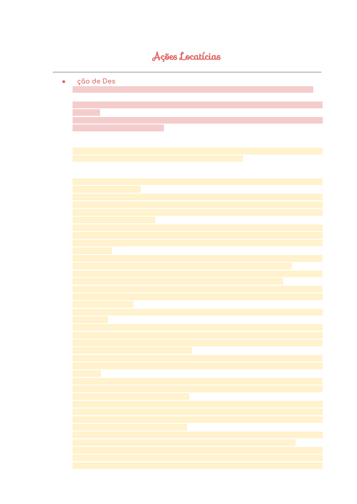 Ações Locatícias ● Ação de Despejo: ↳ Principal ação que pode ser movida pelo locador a fim de retomar o imóvel. ↳ Segue o procedimento comum. ↳ Pode ter como motivação a denúncia CHEIA (com motivos) ou VAZIA (sem motivos). ↳ O pedido de rescisão pode ser cumulado com o de cobrança, quando forem citados o locatário e o fiador. ⇘ quando for ação de despejo por falta de pagamento, possui regras próprias, de acordo com o art. 62. ⇘ “O fiador qe não integrou a relação processual na ação de despejo não responde pela execução do julgado.” - Súmula 286 STJ. ↳ A contestação deve vir acompanhada do depósito do débito e de eventual pedido de retenção das benfeitorias. ⇘ Art. 59. Com as modificações constantes deste capítulo, as ações de despejo terão o rito ordinário. § 1º Conceder - se - á liminar para desocupação em quinze dias, independentemente da audiência da parte contrária e desde que prestada a caução no valor equivalente a três meses de aluguel, nas ações que tiverem por fundamento exclusivo: I - o descumprimento do mútuo acordo (art. 9º, inciso I), celebrado por escrito e assinado pelas partes e por duas testemunhas, no qual tenha sido ajustado o prazo mínimo de seis meses para desocupação, contado da assinatura do instrumento; II - o disposto no inciso II do art. 47, havendo prova escrita da rescisão do contrato de trabalho ou sendo ela demonstrada em audiência prévia; III - o término do prazo da locação para temporada, tendo sido proposta a ação de despejo em até trinta dias após o vencimento do contrato; IV - a morte do locatário sem deixar sucessor legítimo na locação, de acordo com o referido no inciso I do art. 11, permanecendo no imóvel pessoas não autorizadas por lei; V - a permanência do sublocatário no imóvel, extinta a locação, celebrada com o locatário. VI – o disposto no inciso IV do art. 9o, havendo a necessidade de se produzir reparações urgentes no imóvel, determinadas pelo poder público, que não possam ser normalmente executadas com a permanência do locatário, ou, podendo, ele se recuse a consenti-las; VII – o término do prazo notificatório previsto no parágrafo único do art. 40, sem apresentação de nova garantia apta a manter a segurança inaugural do contrato; VIII – o término do prazo da locação não residencial, tendo sido proposta a ação em até 30 (trinta) dias do termo ou do cumprimento de notificação comunicando o intento de retomada; IX – a falta de pagamento de aluguel e acessórios da locação no vencimento, estando o contrato desprovido de qualquer das garantias previstas no art. 37, por não ter sido contratada ou em caso de extinção ou pedido de exoneração dela, independentemente de motivo. § 2º Qualquer que seja o fundamento da ação dar - se - á ciência do pedido aos sublocatários, que poderão intervir no processo como assistentes. § 3o No caso do inciso IX do § 1o deste artigo, poderá o locatário evitar a rescisão da locação e elidir a liminar de desocupação se, dentro dos 15 (quinze) dias concedidos para a desocupação do imóvel e independentemente de cálculo, efetuar depósito judicial que contemple a totalidade dos valores devidos, na forma prevista no inciso II do art. 62. ⇘ Art. 60. Nas ações de despejo fundadas no inciso IV do art. 9º, inciso IV do art. 47 e inciso II do art. 53, a petição inicial deverá ser instruída com prova da propriedade do imóvel ou do compromisso registrado. ⇘ Art. 61 Nas ações fundadas no § 2º do art. 46 e nos incisos III e IV do art. 47, se o locatário, no prazo da contestação, manifestar sua concordância com a desocupação do imóvel, o juiz acolherá o pedido fixando prazo de seis meses para a desocupação, contados da citação, impondo ao vencido a responsabilidade pelas custas e honorários advocatícios de vinte por cento sobre o valor dado à causa. Se a desocupação ocorrer dentro do prazo fixado, o réu ficará isento dessa responsabilidade; caso contrário, será expedido mandado de despejo. ⇘ Art. 62. Nas ações de despejo fundadas na falta de pagamento de aluguel e acessórios da locação, de aluguel provisório, de diferenças de aluguéis, ou somente de quaisquer dos acessórios da locação, observar-se-á o seguinte: I – o pedido de rescisão da locação poderá ser cumulado com o pedido de cobrança dos aluguéis e acessórios da locação; nesta hipótese, citar-se-á o locatário para responder ao pedido de rescisão e o locatário e os fiadores para responderem ao pedido de cobrança, devendo ser apresentado, com a inicial, cálculo discriminado do valor do débito; II – o locatário e o fiador poderão evitar a rescisão da locação efetuando, no prazo de 15 (quinze) dias, contado da citação, o pagamento do débito atualizado, independentemente de cálculo e mediante depósito judicial, incluídos: a) os aluguéis e acessórios da locação que vencerem até a sua efetivação; b) as multas ou penalidades contratuais, quando exigíveis; c) os juros de mora; d) as custas e os honorários do advogado do locador, fixados em dez por cento sobre o montante devido, se do contrato não constar disposição diversa; III – efetuada a purga da mora, se o locador alegar que a oferta não é integral, justificando a diferença, o locatário poderá complementar o depósito no prazo de 10 (dez) dias, contado da intimação, que poderá ser dirigida ao locatário ou diretamente ao patrono deste, por carta ou publicação no órgão oficial, a requerimento do locador; IV – não sendo integralmente complementado o depósito, o pedido de rescisão prosseguirá pela diferença, podendo o locador levantar a quantia depositada; V - os aluguéis que forem vencendo até a sentença deverão ser depositados à disposição do juízo, nos respectivos vencimentos, podendo o locador levantá - los desde que incontroversos; VI - havendo cumu