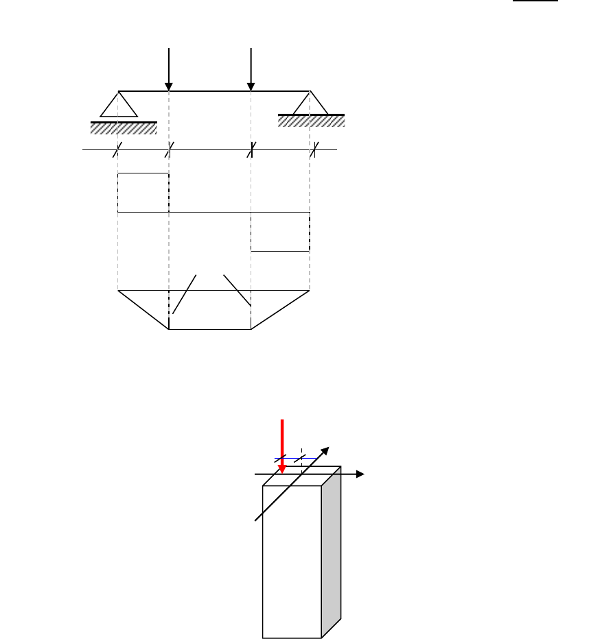 Tipos de Flexão: - Quanto ao plano de solicitação 1) Normal: plano perpendicular ao da barra 2) Oblíqua: plano oblíquo ao da barra. - Quanto ao tipo de carga atuante: 1) Simples 2) Composta Flexão Normal Simples: o plano de solicitação coincidirá com um dos planos de simetria da seção transversal, atuando como esforço solicitante o Momento Fletor. Poderá atuar Esforço Cortante que será responsável pelo surgimento das tensões de cisalhamento que serão vistas posteriormente. Flexão Pura: O plano de solicitação coincide com um dos planos de simetria, atuando apenas Momento Fletor. Flexão Normal Composta: O plano de solicitação coincide com um dos planos de simetria da seção. Atuam Momento Fletor e Esforço Normal. P P A B A A B C D P P P*A DEC DMF Trecho AB e CD – Flexão Normal Simples Trecho BC – Flexão Pura Z Y P E Flexão Oblíqua Simples: O plano de solicitação não coincide com os planos de simetria da seção, atuando Momento Fletor. Flexão Oblíqua Composta: quando a carga não coincide com nenhum dos eixos de simetria da peça. Atuam momento fletor e esforço normal. Princípios Básicos da Resistência dos Materiais: 1º) As seções transversais permanecem planas depois da deformação produzida pela Flexão – Axioma de Bernoulli 2º) As deformações das fibras longitudinais são proporcionais as distâncias da fibra ao eixo baricêntrico. As fibras não fazem pressão entre si e sob a ação das tensões normais sofrem esforços de compressão e tração linear. Axioma de Navier. 3º) As deformações das fibras independem de sua posição transversalmente à seção (sua posição em relação ao eixo vertical de simetria), dessa forma as tensões normais só variam com a altura e não com a largura da seção. Y Z Q Z Y P E1 E2 4º) O material da peça obedece a Lei de Hooke e é homogêneo. = E* 5º) O módulo de elasticidade a tração “E” é o mesmo da compressão. Cálculo da tensão em uma fibra qualquer Considerando o trecho infinitesimal dx, após a deformação, tem-se: ac – encurtamento da fibra ac bd – alongamento da fibra bd ef – transição da região comprimida para a tracionada, que não está sujeita a esforços. Todas as fibras tais como ef formam a superfície neutra, que passa no CG da seção. Deformação de uma fibra qualquer: Considere a fibra gh (em vermelho), cuja distância da LN é de “y” (em azul) P P A C B D DX DΘ O R A C E F B D Traçando uma paralela a reta ab (em verde), passando pelo ponto f, tem-se: Fibra gh – comprimento da fibra deformada Fibra gh’ – comprimento inicial da fibra Comparando o triângulo obc e o triângulo fh’h, tem-se: DΘ O R A C E F G H B D Y DΘ O R A C E F G H B D Y Y F H’ H DΘ tg dθ ~ dθ = ef tg dθ ~ dθ = h’h r y Logo: ef = r dθ e h’h = y dθ Logo a deformação específica longitudinal será: = l = h’h = y dθ = y L ef r dθ r Pela lei de Hooke: = E* Onde: 1 = __ (1) r E*y Considerando a seção transversal, um elemento de área dA onde atua uma força dF a uma distância “y” do eixo z Fazendo o equilíbrio da seção dF = *dA Fx = 0 r E *y*dA = 0 0dA*y r E = E* Y R Z Y D A DF (2) O que comprova que a superfície neutra coincide com o CG da seção. Para equilibrar o conjugado de forças interiores (tensões) que deverá equilibrar o conjugado exterior tem-se? dM = dF*y dM = *dA.y dM = E*y*dA*y r dM = E*y2*dA r MdM MdA*y r E 2 E * Iz = M r _1_ = _M_ (2) r E* Iz Comparando (1) e (2), tem-se: __ = _M_ E*y E*Iz Logo a tensão normal será dada por: = M*y Iz O que permite calcular a tensão em qualquer ponto da viga. O momento será dado pelo DMF, a inércia pela seção transversal e y é dado pela distância do ponto ao eixo z da seção transversal. MOMENTO DE INÉRCIA 30 cm 20 cm 10 77 Exercícios 1) Para a viga abaixo determinar as tensões normais nas seções A e B indicadas na figura nas seguintes fibras: a) Sobre a LN (linha neutra); b) 5 cm acima da LN; c) 10 cm abaixo da LN; d) Nas extremidades da seção. 2) Determinar as máximas tensões que ocorrem na viga abaixo: 3) a) Construir o DEC e DMF b) As tensões máximas; c) A tensão na fibra situada a 8 cm da borda inferior na seção indicada (E) 10 KN 0,8 KN/m 40 cm 20 cm 0,8 m 1,2m 2m A B C 20 cm 10KN 0,5 KN/m 1,0mĪ 0,5 0,5 1,5 m 3 KNm A B C D 5,0 KN 8,KN 1m 1,5 m 0,8m E 1,0 KN/m 7 cm 5 cm 7 cm 5 cm 15 cm 5 cm 0,5 m