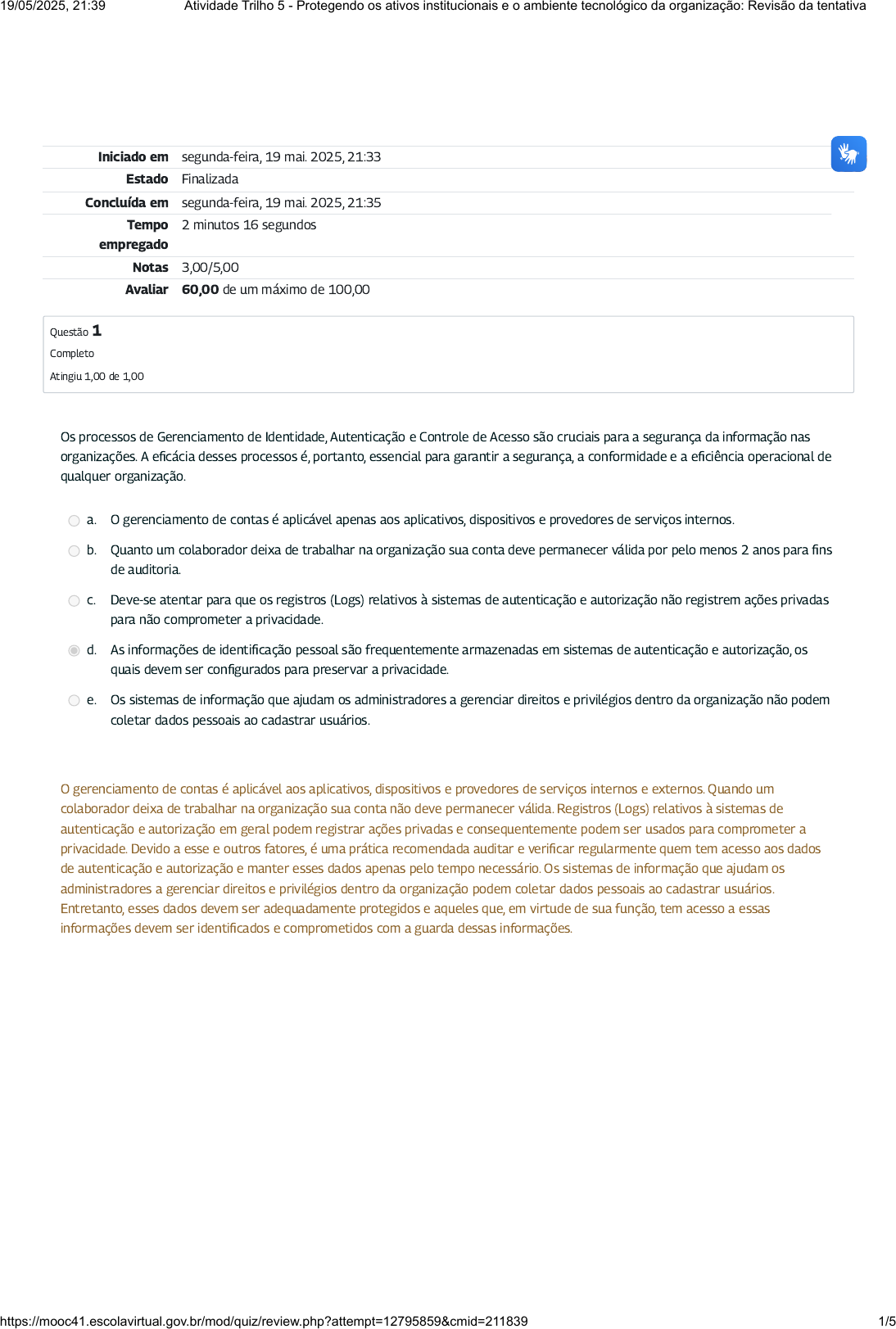 Iniciado em segunda-feira, 19 mai. 2025, 21:33 Estado Finalizada Concluída em segunda-feira, 19 mai. 2025, 21:35 Tempo empregado 2 minutos 16 segundos Notas 3,00/5,00 Avaliar 60,00 de um máximo de 100,00 Questão 1 Completo Atingiu 1,00 de 1,00 Os processos de Gerenciamento de Identidade, Autenticação e Controle de Acesso são cruciais para a segurança da informação nas organizações. A eficácia desses processos é, portanto, essencial para garantir a segurança, a conformidade e a eficiência operacional de qualquer organização. a. O gerenciamento de contas é aplicável apenas aos aplicativos, dispositivos e provedores de serviços internos. b. Quanto um colaborador deixa de trabalhar na organização sua conta deve permanecer válida por pelo menos 2 anos para fins de auditoria. c. Deve-se atentar para que os registros (Logs) relativos à sistemas de autenticação e autorização não registrem ações privadas para não comprometer a privacidade. d. As informações de identificação pessoal são frequentemente armazenadas em sistemas de autenticação e autorização, os quais devem ser configurados para preservar a privacidade. e. Os sistemas de informação que ajudam os administradores a gerenciar direitos e privilégios dentro da organização não podem coletar dados pessoais ao cadastrar usuários. O gerenciamento de contas é aplicável aos aplicativos, dispositivos e provedores de serviços internos e externos. Quando um colaborador deixa de trabalhar na organização sua conta não deve permanecer válida. Registros (Logs) relativos à sistemas de autenticação e autorização em geral podem registrar ações privadas e consequentemente podem ser usados para comprometer a privacidade. Devido a esse e outros fatores, é uma prática recomendada auditar e verificar regularmente quem tem acesso aos dados de autenticação e autorização e manter esses dados apenas pelo tempo necessário. Os sistemas de informação que ajudam os administradores a gerenciar direitos e privilégios dentro da organização podem coletar dados pessoais ao cadastrar usuários. Entretanto, esses dados devem ser adequadamente protegidos e aqueles que, em virtude de sua função, tem acesso a essas informações devem ser identificados e comprometidos com a guarda dessas informações. 19/05/2025, 21:39 Atividade Trilho 5 - Protegendo os ativos institucionais e o ambiente tecnológico da organização: Revisão da tentativa https://mooc41.escolavirtual.gov.br/mod/quiz/review.php?attempt=12795859&cmid=211839 1/5 Questão 2 Completo Atingiu 1,00 de 1,00 As organizações possuem uma série de dados, que são importantes para o negócio, dentre eles os dados pessoais. O tratamento desses dados deve estar de acordo com as regulamentações de proteção de dados e privacidade, pois a não conformidade pode afetar os direitos e garantias dos titulares de dados, além de acarretar prejuízos financeiros e reputacionais. Além disso, a perda de controle da organização sobre os dados protegidos ou sensíveis é um sério e frequente impacto relatado no negócio. Sobre a proteção de dados, ativos e infraestrutura tecnológica, escolha a opção correta: a. Um esquema de classificação de dados precisa necessariamente ser realizado de forma automatizada por meio de software, mas os administradores de TI e os responsáveis pela privacidade devem ter um conhecimento geral dos tipos de dados coletados. b. A restauração de backups durante o teste deve ser feita com cuidado. Se os dados confidenciais forem restaurados, esse sistema deve ser devidamente protegido e excluído com segurança após a conclusão do exercício. c. s logs são muito úteis, tanto para desenvolvedores quanto para equipe de TI, na melhoria e na solução de problemas, porém não devem armazenar informações pessoais, para que não tragam implicações para privacidade. d. Os servidores de e-mail devem reter informações por muito tempo para fins de auditoria. e. O uso de HTTP pode fornecer confidencialidade de dados pessoais no transporte quando um conjunto de cifras apropriado é necessário. Isso deve ser feito para informações pessoais sensíveis, a menos que a confidencialidade possa ser garantida por outros meios. Um esquema de classificação de dados não precisa necessariamente ser realizado de forma automatizada por meio de software. Os logs são muito úteis, tanto para desenvolvedores quanto para equipe de TI, na melhoria e na solução de problemas, podem armazenar informações pessoais e trazer implicações para privacidade. Por isso é necessária sua adequada proteção. Os servidores de e-mail não devem reter informações por muito tempo pois podem agravar o risco de violação de dados. HTTP não fornece um serviço de transporte de dados com confiabilidade, devendo ser adotada sua versão segura HTTPS. 19/05/2025, 21:39 Atividade Trilho 5 - Protegendo os ativos institucionais e o ambiente tecnológico da organização: Revisão da tentativa https://mooc41.escolavirtual.gov.br/mod/quiz/review.php?attempt=12795859&cmid=211839 2/5 Questão 3 Completo Atingiu 1,00 de 1,00 Não podemos confiar que as defesas da rede sejam perfeitas. Os adversários continuam a evoluir e amadurecer à medida que compartilham ou vendem informações. As ferramentas de segurança somente são eficazes se oferecerem suporte a um processo de monitoramento contínuo que permita à equipe ser alertada e responder rapidamente a incidentes de segurança. Ter uma consciência situacional abrangente aumenta a velocidade de detecção e resposta, que é fundamental para minimizar um possível impacto negativo para o órgão, por exemplo, ao responder rapidamente quando um malware é descoberto, credenciais são roubadas ou quando dados sensíveis são comprometidos. Sobre os processos de monitoramento contínuo do ambiente tecnológico da organização, selecione a opção INCORRETA: a. As informações de tráfego de rede col