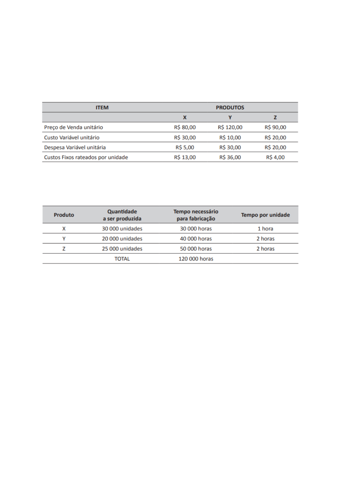QUESTÃO 34 Na tabela a seguir, apresentam-se dados contábeis de uma indústria de brinquedos que fabrica três produtos diferentes . A diretoria dessa indústria projetou, em seu orçamento, as quantidades de produtos a ser produzidas no ano seguinte, apresentadas na tabela a seguir. Para produzir a quantidade prevista, a indústria precisaria ter, no mínimo, 120 000 horas, porém sua capacidade máxima é de 100.000 horas. Em vista da limitação da capacidade de produção, a decisão tomada pela diretoria da empresa foi diminuir a quantidade de produção do produto que estivesse dando menor resultado. Para a tomada de decisão, a empresa pretende utilizar a Margem de Contribuição. Caso a diretoria da empresa adote, para tomada de decisão, a margem de contribuição unitária por fator limitante (horas de produção), a ordem de prioridade para a produção de X, Y e Z e o resultado de cada produto serão, respectivamente, A. produto X = R$ 45,00, produto Y = R$ 40,00, produto Z = R$ 25,00. B. produto X = R$ 32,00, produto Z = R$ 23,00, produto Y = R$ 22,00. C. produto Y = R$ 55,00, produto X = R$ 50,00, produto Z = R$ 35,00. D. produto Y = R$ 80,00, produto Z = R$ 50,00, produto X = R$ 45,00. E. produto Z = R$ 46,00, produto Y = R$ 44,00, produto X = R$ 32,00.