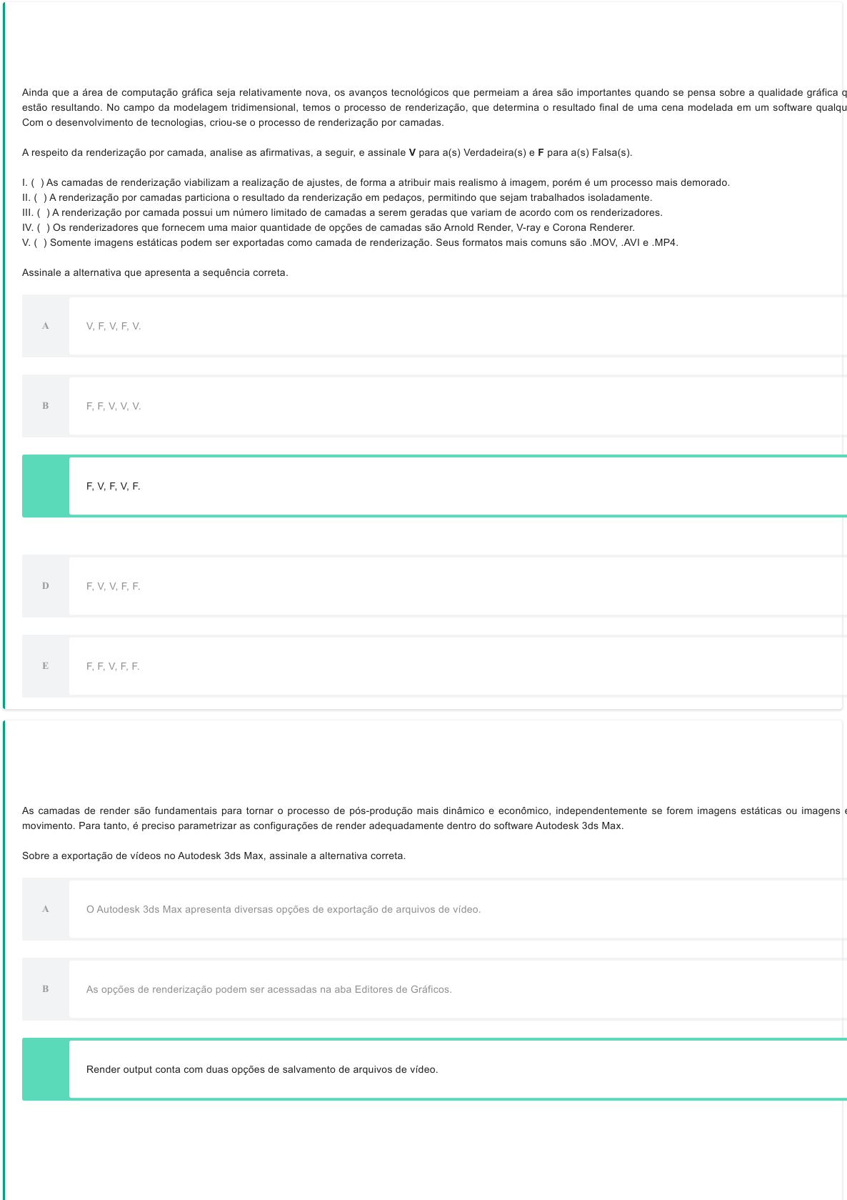 Ainda que a área de computação gráfica seja relativamente nova, os avanços tecnológicos que permeiam a área são importantes quando se pensa sobre a qualidade gráfica q estão resultando. No campo da modelagem tridimensional, temos o processo de renderização, que determina o resultado final de uma cena modelada em um software qualqu Com o desenvolvimento de tecnologias, criou-se o processo de renderização por camadas. A respeito da renderização por camada, analise as afirmativas, a seguir, e assinale V para a(s) Verdadeira(s) e F para a(s) Falsa(s). I. ( ) As camadas de renderização viabilizam a realização de ajustes, de forma a atribuir mais realismo à imagem, porém é um processo mais demorado. II. ( ) A renderização por camadas particiona o resultado da renderização em pedaços, permitindo que sejam trabalhados isoladamente. III. ( ) A renderização por camada possui um número limitado de camadas a serem geradas que variam de acordo com os renderizadores. IV. ( ) Os renderizadores que fornecem uma maior quantidade de opções de camadas são Arnold Render, V-ray e Corona Renderer. V. ( ) Somente imagens estáticas podem ser exportadas como camada de renderização. Seus formatos mais comuns são .MOV, .AVI e .MP4. Assinale a alternativa que apresenta a sequência correta. C F, V, F, V, F. Resposta correta Questão 1 Questão objetiva A V, F, V, F, V. B F, F, V, V, V. D F, V, V, F, F. E F, F, V, F, F. As camadas de render são fundamentais para tornar o processo de pós-produção mais dinâmico e econômico, independentemente se forem imagens estáticas ou imagens e movimento. Para tanto, é preciso parametrizar as configurações de render adequadamente dentro do software Autodesk 3ds Max. Sobre a exportação de vídeos no Autodesk 3ds Max, assinale a alternativa correta. C Render output conta com duas opções de salvamento de arquivos de vídeo. Resposta correta Questão 2 Questão objetiva A O Autodesk 3ds Max apresenta diversas opções de exportação de arquivos de vídeo. B As opções de renderização podem ser acessadas na aba Editores de Gráficos. D A extensão .AVI é conhecida por apenas um sistema operacional. E A extensão .MOV não é executada por muitos leitores de vídeo. Ao ter em vista que a pós-produção de imagens renderizadas de softwares tridimensionais serve para agregar valor gráfico às imagens geradas nesses softwares, é preci considerar que a pós-produção pode acontecer, inclusive, em imagens em movimento, ou seja, aquelas que resultam em um vídeo. Referente à pós-produção de imagens em movimento, analise as afirmativas a seguir. I. Adobe Premiere Pro e Adobe After Effects são amplamente difundidos na pós-produção de imagens em movimento. II. Na pós-produção de imagens em movimento, é possível adicionar efeitos de transição e trilhas sonoras, por exemplo. III. Apenas o After Effects permite que correções e ajustes básicos sejam realizados em imagens em movimento. IV. O processo de humanização somente acontece na pós-produção de imagens estáticas. V. Apenas em imagens estáticas é possível trabalhar com camadas; portanto, os softwares para imagens em movimento trabalham somente com uma linha do tempo do vídeo. Está correto o que se afirma em: A I e II, apenas. Resposta correta Questão 3 Questão objetiva B II e III, apenas. C III e IV, apenas. D IV e V, apenas. E I e V, apenas. As camadas de renderização são sinônimo de economia para o processo de render. A forma como as categorias das camadas estão organizadas permite que o processo de pó produção seja mais assertivo em relação aos ajustes a serem executados. Sobre o processo de pós-produção em imagens estáticas e em movimento, analise as afirmativas a seguir. I. Tanto imagens estáticas quanto imagens em movimento possuem camadas que permitem a realização de correções, ajustes básicos, adição de efeitos e humanização. II. O processo de pós-produção de imagens em movimento se difere do processo realizado em imagens estáticas. III. A diferença entre a pós-produção de imagens estáticas e em movimento é que, nessa última, faz-se possível adicionar elementos de multimídia. IV. Sons e transições compõem o processo de pós-produção de imagens estáticas. V. Humanização é um recurso exclusivo de imagens estáticas. Está correto o que se afirma em: Questão 4 Questão objetiva A I e II, apenas. C I e III, apenas. Resposta correta B II e III, apenas. D III e IV, apenas. E IV e V, apenas. O Photoshop é uma ferramenta de grande potencial quando se pretende trabalhar na pós-produção de imagens estáticas. Dentre seus recursos, destacam-se os modos mesclagem entre camadas que, basicamente, realizam o controle da interação das camadas superiores em relação às superiores. Considerando os modos de mesclagem de camadas no Photoshop, analise as afirmativas, a seguir, e assinale V para a(s) Verdadeira(s) e F para a(s) Falsa(s). I. ( ) O Photoshop possui 27 modos de mesclagem agrupados em 6 categorias de interferência. II. ( ) Apenas o modo de mesclagem normal pode ser considerado básico, uma vez que interfere apenas na granulação entre as camadas. III. ( ) Os modos de mesclagem para clareamento possibilitam que tudo aquilo que for preto fique transparente na imagem. IV. ( ) Os modos diferença, exclusão, subtração e divisão fazem parte do modo de mesclagem de composição entre as cores das camadas. V. ( ) Os modos que compõem a mesclagem de comparação entre camadas são sobrepor, luz indireta, luz direta, luz linear, luz do pino e mistura sólida. Assinale a alternativa que apresenta a sequência correta. E V, F, V, F, F. Resposta correta Questão 5 Questão objetiva A F, F, F, V, V. B F, V, F, F, V. C V, V, V, F, F. D V, F, V, F, V. Para agilizar o processo de correção e ajustes nas imagens renderizadas, é possível separar as imagens em camadas de render. Estas, por sua vez, recebem nomenc
