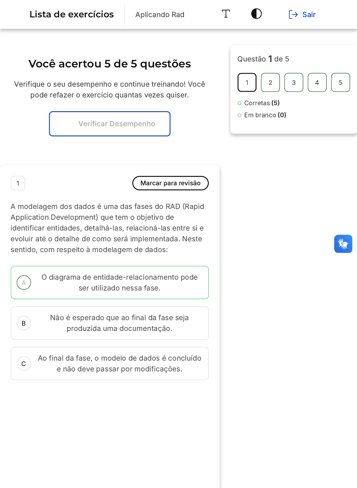 Você acertou 5 de 5 questões Verifique o seu desempenho e continue treinando! Você pode refazer o exercício quantas vezes quiser. Verificar Desempenho A B C 1 Marcar para revisão A modelagem dos dados é uma das fases do RAD (Rapid Application Development) que tem o objetivo de identificar entidades, detalhá-las, relacioná-las entre si e evoluir até o detalhe de como será implementada. Neste sentido, com respeito à modelagem de dados: O diagrama de entidade-relacionamento pode ser utilizado nessa fase. Não é esperado que ao final da fase seja produzida uma documentação. Ao final da fase, o modelo de dados é concluído e não deve passar por modificações. Questão 1 de 5 Corretas (5) Em branco (0) 1 2 3 4 5 Lista de exercícios Aplicando Rad Sair D E O sistema gerenciador de banco de dados sempre deve ser o mais eficiente na gerência dos dados. O modelo de dados deve ser baseado no diagrama de classes da UML (Unified Modeling Language). Resposta correta Parabéns, você selecionou a alternativa correta. Confira o gabarito comentado! Gabarito Comentado A alternativa correta é a letra A. A modelagem de dados é uma fase crucial no desenvolvimento de aplicações e o diagrama de entidade-relacionamento é uma ferramenta comumente utilizada nessa etapa. Este diagrama permite representar as entidades envolvidas, bem como as relações entre elas, facilitando a compreensão e a implementação do modelo de dados. Portanto, é perfeitamente possível e até recomendado o uso do diagrama de entidade- relacionamento durante a fase de modelagem de dados. 2 Marcar para revisão A linguagem de programação Python possui muitos pacotes disponíveis. Tem uma grande comunidade de colaboradores engajados na solução de problemas e disseminação de conteúdo. Sobre a linguagem de programação Python: A B C D E Não é ideal para projetos RAD, dado que é orientada a objetos. Por ter uma sintaxe muito simples, não é necessário que o desenvolvedor precise programar linhas de código. Aplica-se perfeitamente bem para a RAD, dado que é considerada a melhor linguagem de programação. É usada para construir a lógica do sistema, mas não a interface gráfica com o usuário. Licença e simplicidade de sintaxe fazem da linguagem Python uma forte candidata para desenvolvimentos de projetos RAD. Resposta correta Parabéns, você selecionou a alternativa correta. Confira o gabarito comentado! Gabarito Comentado A alternativa correta é a E. A linguagem Python é conhecida por sua simplicidade de sintaxe, o que facilita a leitura e compreensão do código, tornando- a uma escolha popular para projetos de Desenvolvimento Rápido de Aplicações (RAD). Além disso, a licença de Python permite que ela seja usada e distribuída livremente, o que contribui para sua popularidade e uso em uma variedade de projetos, incluindo RAD. Portanto, a afirmação "Licença e simplicidade de sintaxe fazem da linguagem Python uma forte candidata para desenvolvimentos de projetos RAD" é verdadeira. A B C D E 3 Marcar para revisão O levantamento de requisitos é uma etapa fundamental do ciclo de vida de um sistema, pois é nessa etapa que são identificadas as necessidades do sistema. Uma das técnicas que auxiliam no levantamento de requisitos é a de entrevistas. A respeito das técnicas utilizadas para otimizar os resultados obtidos pelas entrevistas, selecione a opção CORRETA: Os casos de uso são usados para descrever como os usuários devem usar o sistema. Os cenários são usados para simular situações de desastre e como os usuários devem proceder. A observação e análise social auxilia a mapear o comportamento do usuário. Os grupos focais participam de debates para analisar possíveis vulnerabilidades do sistema. O brainstorming estimula que as partes interessadas apresentem suas ideias sobre o sistema e como devem ser priorizadas. Resposta correta Parabéns, você selecionou a alternativa correta. Confira o gabarito comentado! Gabarito Comentado A alternativa correta é a letra C, que afirma que a observação e análise social auxiliam a mapear o comportamento do usuário. Isso é verdadeiro, pois ao observar e analisar o comportamento do usuário, é possível entender melhor suas necessidades e expectativas em relação ao sistema. Essa A B C D E compreensão é fundamental para o levantamento de requisitos, pois permite que o sistema seja desenvolvido de forma a atender às necessidades do usuário de maneira eficaz. 4 Marcar para revisão A Modelagem de Negócios é uma das fases da RAD. Nela, aspectos como necessidades do negócio e propósito do sistema são tratados. Nesse sentido, selecione a opção correta a respeito da Modelagem de Negócios: Identifica as entidades de dados e como se relacionam com o negócio. É caracterizada por um processo rígido que vai determinar como será a versão final. É uma fase voltada para os desenvolvedores do sistema com interações técnicas. Identifica as informações relevantes sobre o negócio. Nela, os testes do sistema são tratados de modo a validar os requisitos do sistema. Resposta correta Parabéns, você selecionou a alternativa correta. Confira o gabarito comentado! Gabarito Comentado A alternativa correta é a D, que afirma que a Modelagem de Negócios identifica as informações A B C D E relevantes sobre o negócio. Isso ocorre porque a Modelagem de Negócios é uma fase crucial na Análise de Requisitos de Desenvolvimento (RAD), onde o foco é entender as necessidades do negócio e o propósito do sistema. Portanto, é essencial identificar as informações que são relevantes para o negócio para garantir que o sistema atenda às suas necessidades e objetivos. 5 Marcar para revisão O desenvolvimento de interface com o usuário é um grande desafio, apesar da existência de muitos frameworks e ferramentas que facilitam esse trabalho. Um desses desafios está na escolha das ferramentas, ou frameworks adequados. Nesse sentido,