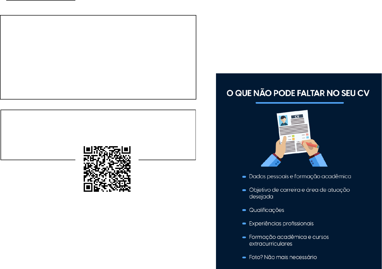 DICAS DE CURRÍCULO Mesmo com as referências em dia, é evidente que é necessário adaptar o texto para cada novo processo seletivo que participar. No entanto, a maioria dos profissionais deixa para fazer tudo isso às pressas ou apenas quando já foi desligado da empresa. O seu currículo é a peça-chave de sua empregabilidade e é essencial no momento da sua recolocação profissional. Como preparar esse documento para que seja chamado para a tão desejada entrevista de emprego? Esse é o resultado que um bom curriculum deve gerar e vamos dar algumas dicas para ajudar nesse desafio. Manter o curriculum atualizado e direcionado para o objetivo de carreira é tarefa que exige tempo e dedicação e deve fazer parte do planejamento de carreira. Por isso, o ideal é mantê-lo atualizado, mesmo que esteja trabalhando. Modelos de currículo grátis: Algumas dicas essenciais para contribuir com a conquista de um novo emprego: #1 - Dados pessoais e formação acadêmica Comece o documento incluindo um cabeçalho com seus dados pessoais e informações para contato de forma obietiva como: · Nome completo · E-mail · Telefone · Endereço do seu perfil em redes profissionais, como o LinkedIn · Cidade onde mora · Idade ou data de nascimento #2 - Qual seu objetivo de carreira e área de atuação desejada Deixe claro a vaga que está buscando. A informação exata demonstra que sabe onde quer chegar e tem metas definidas. #3 - Suas qualificações Quem é você e porque optou por atuar neste segmento; quais são suas habilidades, competências, resultados atingidos e o seu objetivo nesse momento da sua carreira. Inclua um breve relato das suas qualificações e liste os motivos e conhecimentos que o fazem exercer a profissão. #4 - Sobre as experiências profissionais Essa é uma das partes mais importantes do currículo. É preciso tratá-la com atenção especial. Comece informando sua experiência profissional mais recente até a mais antiga, incluindo o cargo ocupado e a duração da experiência com ano de começo e fim. Além disso, insira uma ou duas linhas de texto apresentando a empresa e sua presença no mercado ao lado e cada período da sua atuação. Em seguida, resuma suas principais atividades desempenhadas, bem como resultados atingidos e responsabilidades, sempre com foco para as necessidades da vaga que está concorrendo. #5 – Formação acadêmica, cursos extracurriculares Descreva, de forma sucinta, seus cursos de graduação e pós-graduação. Use sempre a ordem do mais recente para o antigo. Conhecimentos em informática, certificações e treinamentos na sua área de atuação mostram seu interesse no contínuo desenvolvimento profissional, o que é muito valorizado pelas empresas. Idiomas O conhecimento em outros idiomas faz parte dos investimentos mandatórios para quem deseia assumir cargo de Alta Gerência. Com a facilidade de conectar profissionais em diversos países, a habilidade no uso do Inglês e Espanhol é um diferencial no mercado e forte aliada. Lembre-se sempre de indicar o seu nível de fluência, que pode ser básico, intermediário ou avançado. Seja verdadeiro nesta informação. Perceber seu real nível de conhecimento é muito simples e pode lhe colocar em uma situação constrangedora ainda no momento da entrevista. #6 - Colocar foto ou não? Essa é uma das principais dúvidas que recebemos. Há alguns anos, era uma exigência das empresas colocar fotos anexadas ao conteúdo. Hoje, isso não é mais necessário. No entanto, tome cuidado com sua foto de perfil em suas redes sociais, principalmente no Linkedln, pois a rede sempre será consultada. Nas suas redes sociais, inclusive Whatsapp, insira uma foto com boa qualidade, em um fundo preferencialmente neutro. Selfies ou fotos descontraídas estão fora de cogitação. Essa será sua imagem profissional para a empresa, por isso, mantenha uma expressão e aparência formais. #7 - Cuidados com os erros de português e ortografia: Nada mais comprometedor para um profissional do que apresentar um currículo com erros de português! Invista em uma revisão detalhada de todo o seu currículo. De acordo com o livro Carreira e Pós-Carreira, de Adilson Mirante, presidente da M1 Alta Gerência: "… O currículo não reflete apenas a formação e a experiência técnica, mas é o retrato de sua personalidade. A construção de uma carreira é a construção de uma vida, é fruto de suas opções, erros e acertos profissionais e pessoais". Saber se vender e valorizar suas experiências do passado é fator fundamental para seu sucesso. Reveja hoje mesmo seu currículo e deixe planejado seus próximos passos na carreira. image1.png image2.png