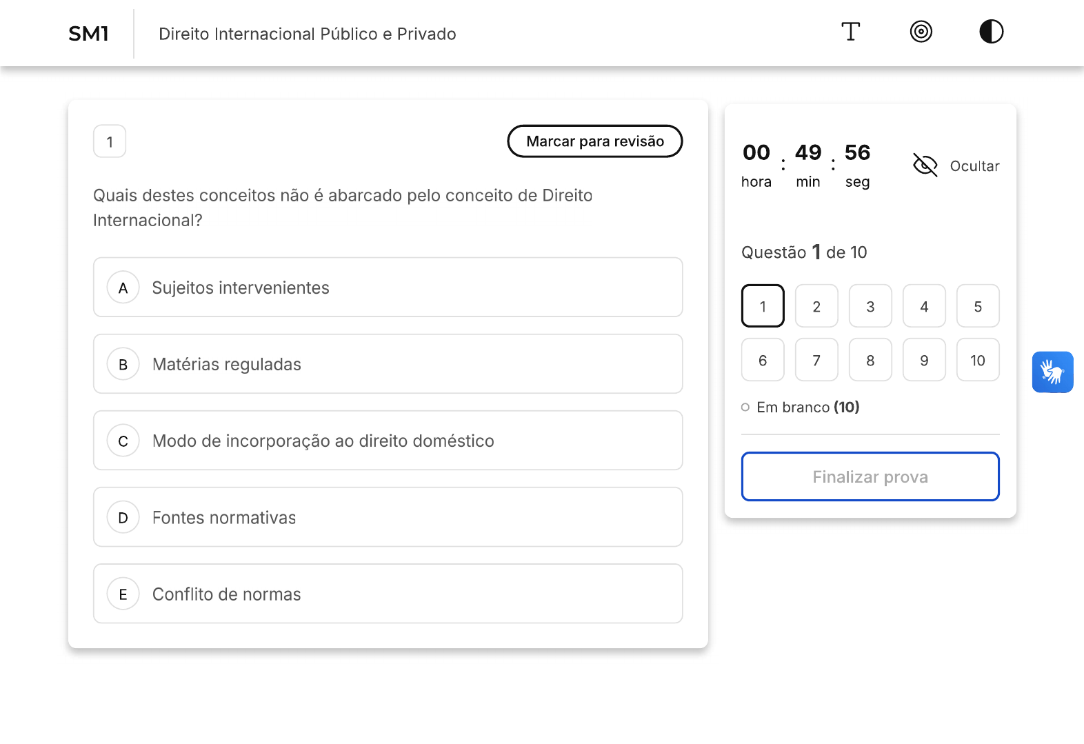 SM1 Direito Internacional Público e Privado T 1 Marcar para revisão 00 : 49 : 56 Ocultar hora min seg Quais destes conceitos não é abarcado pelo conceito de Direito Internacional? Questão 1 de 10 A Sujeitos intervenientes 1 2 3 4 5 Matérias reguladas 678910 Em branco (10) c Modo de incorporação ao direito doméstico Finalizar prova D Fontes normativas E Conflito de normas2 Marcar para revisão Um problema perene que envolve discussões teóricas e práticas é a coexistência de normas internacionais com normas nacionais. A esse respeito, assinale a opção correta. As correntes teóricas que estabelecem critérios para justificar a solução de conflitos normativos entre as normas internacionais e as normas internas prescindem dos ordenamentos jurídicos nacionais. O fato de um Estado não poder invocar uma norma jurídica doméstica para se escusar de uma obrigação internacional significa que direito internacional ignora direito interno. Na hipótese de conflito entre uma norma constitucional e uma norma internacional prevalecerá a primeira, pois apregoa-se a c obrigatoriedade do direito internacional às regras do direito interno, em decorrência de uma percepção teórica de um monismo do tipo internacionalista.As correntes teóricas dualistas, ainda que moderadas, apregoam D uma visão que engloba de forma indistinta tratados internacionais, costumes e princípios gerais de direito. Considera-se monismo do tipo internacionalista dialógico uma corrente adequada para tratar de conflitos normativos que E envolvam direitos humanos, visto que poderia haver a aplicação da norma de direito interno em detrimento da de direito internacional ou vice-versa. 3 Marcar para revisão Para os dualistas, tais como Alfred von Verdross e Dionísio Anzilotti, no tocante à incorporação de tratados de direitos humanos à ordem jurídica interna, O Direito Internacional aplica-se na ordem jurídica dos Estados A independentemente da sua transformação em norma interna. B Em caso de conflito, prevalece ordenamento jurídico interno.Em caso de conflito, prevalece ordenamento jurídico c internacional. Apresentando os dois ordenamentos jurídicos nas diferentes esferas de atuação, não poderia haver nenhum tipo de conflito D entre os dois e nem que se falar de supremacia de um sobre outro. Perde a eficácia ordenamento jurídico internacional em caso de E arbítrio de um Estado estrangeiro sobre nosso País. 4 Marcar para revisão Qual dos temas abaixo não é objeto de normas do Direito Internacional? A Meio ambiente Armas nucleares Tráfico de drogasD Planos de saúde E Comércio exterior 5 Marcar para revisão Tratados são, por excelência, normas de Direito Internacional Público. No modelo jurídico brasileiro, como nas demais democracias modernas, tratados passam a integrar Direito Interno Estatal, após a verificação de seu iter de incorporação. A respeito dessa temática, assinale a opção correta, de acordo com ordenamento jurídico brasileiro. Uma vez ratificados pelo Congresso Nacional, os tratados A passam, de imediato, a compor Direito Brasileiro. Aprovados por decreto legislativo no Congresso Nacional, os tratados podem ser promulgados pelo Presidente da República.Uma vez firmados, os tratados relativos ao MERCOSUL, ainda que criem compromissos gravosos à União, são automaticamente c incorporados, visto que são aprovados por parlamento comunitário. Após firmados, os tratados passam a gerar obrigações imediatas, D não podendo os Estados se eximir de suas responsabilidades por razões de Direito Interno. Uma vez assinados pelo Presidente da República, os tratados E internacionais passam a fazer parte do ordenamento jurídico brasileiro, dando ensejo à responsabilidade internacional. 6 Marcar para revisão Em razão de sua natureza descentralizada, Direito Internacional Público desenvolveu-se no sentido de admitir fontes de Direito diferentes daquelas admitidas no Direito Interno. Que fonte, entre as listadas a seguir, não pode ser considerada fonte de Direito Internacional?A Tratado Decisões de tribunais constitucionais dos Estados. c Costume D Princípios gerais de Direito E Atos unilaterais dos Estados 7 Marcar para revisão As normas peremptórias de Direito Internacional, também conhecidas como jus cogens, possuem uma série de características que as colocam num nível hierárquico superior em relação às demais. Sobre tais atributos, é correto afirmar que:As normas de jus cogens são passíveis de derrogação por A tratados ordinários. As normas peremptórias de Direito Internacional possuem mesmo status dos costumes internacionais. As normas de jus cogens se diferenciam das obrigações erga omnes, por conta da sua característica formal de norma hierarquicamente superior. Dada a sua plasticidade, as normas de jus cogens demandam D interpretação da forma soft law. As normas de jus cogens não têm força para suplantar as E determinações internas dos Estados. 8 Marcar para revisão Considere que Estado A tenha adentrado espaço aéreo do Estado sem a sua autorização e que, após tratativas diplomáticas, ele tenha reconhecido que cometera uma violação ao direito do Estado tendo apresentado pedido formal de desculpa pelo ocorrido. Nessa situação, de acordo com os artigos da Comissão de Direito Internacional da ONU sobreResponsabilidade Internacional dos Estados, reconhecimento da violação e pedido de desculpas realizado pelo Estado A caracterizam a forma de reparação denominada A Danos morais. Garantia de não repetição. c Restituição. D Compensação. E Satisfação. 9 Marcar para revisão Raul, nacional do Estado X, solicitou asilo diplomático na embaixada do Estado Y, localizada no território do Estado alegando que tem sofrido perseguição política por ação conjunta dos Estados X e Z. asilo diplomático foi concedido pelo Estado Y, que reconhece como norma dedireito internacional costumeiro asilo diplomático, ao pa