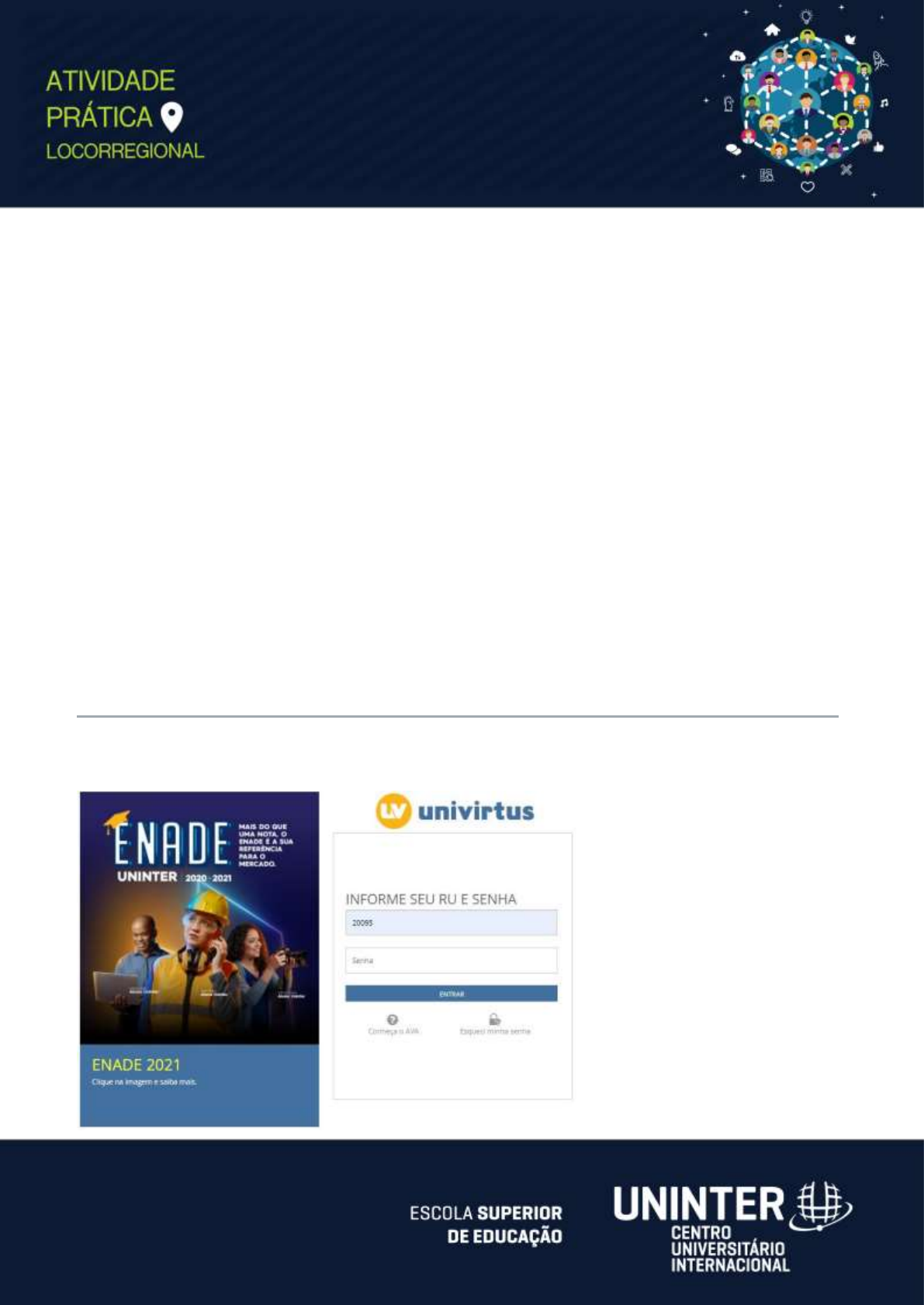 TUTORIAL DE POSTAGEM DA PRODUÇÃO ATIVIDADE PRÁTICA LOCORREGIONAL Olá, alunos dos cursos de graduação da Escola Superior de Educação - Uninter. A Atividade Prática Locorregional é uma metodologia de pesquisa e prática, considerando o macro e o micro territorial para o desenvolvimento da aprendizagem do estudante e da comunidade em seu entorno. A referida atividade apropria-se de diferentes instrumentos de avaliação na perspectiva de competências, que se caracterizam por selecionar, organizar e mobilizar, na ação, diferentes recursos para enfrentamento de uma situação-problema específica. Dessa forma, o estudante é colocado como protagonista de sua transformação individual e social. Assim, a Atividade Prática Locorregional faz parte do sistema de avaliação e corresponde 40% da média. Cada atividade prática possui especificidade, tanto na parte teórica como na prática. Dessa forma, leia sempre com atenção a proposta de prática disponibilizada em Material Complementar da disciplina. Acompanhe no decorrer do Tutorial como você deverá proceder para realizar a produção da Atividade Prática Locorregional. 1. Postagem da produção 1º Passo – Você deverá acessar com o seu número de RU e Senha o seu AVA Univirtus. 2º Passo – Você deverá clicar no ícone UV Univirtus. 3º Passo – Ao visualizar as disciplinas do seu curso, selecione uma disciplina da Fase vigente. 4º Passo – Na disciplina selecionada, você deverá localizar e clicar no ícone Trabalhos. 5º Passo – Agora, você deverá clicar no botão ENTREGAR, do link Trabalho 1 – Atividade Prática Locorregional. 6º Passo – Após acessar ENTREGAR, clique no botão ANEXAR ARQUIVOS. Atenção! Em caso de trabalho em grupo, após anexar o trabalho, você deverá inserir o número do RU dos demais integrantes do seu grupo. Lembramos que é possível realizar a Atividade Prática Locorregional em grupos de até 4 integrantes, contanto que sejam do mesmo polo e da mesma disciplina. 7º Passo – Após inserir o arquivo da Prática Locorregional, clique em SALVAR. 8º Passo – Anote o número do protocolo de postagem do seu arquivo Prática Locorregional. 2. Critérios de Avaliação A sua atividade postada no ícone Trabalhos será avaliada por um professor corretor, seguindo os critérios de avaliação: Questão 1/4 O trabalho apresenta desenvolvimento que contempla criação própria (autoria) e/ou demonstra contextualização e criatividade em seu desenvolvimento, articulados à proposta da atividade prática locorregional. Nota: 25.0 Questão 2/4 O trabalho apresenta um entendimento pessoal ou do grupo sobre o tema que foi objeto da atividade prática locorregional. Nota: 25.0 Questão 3/4 O trabalho apresentado está de acordo com a proposta e contemplou os itens solicitados no template. Nota: 25.0 Questão 4/4 O trabalho apresenta sequência lógica, coesão, coerência, objetividade, linguagem e vocabulário científicos adequados, estando de acordo com a norma padrão da língua. Nota: 25.0 3. Observações Complementares • Siga corretamente as orientações que constam neste material e na proposta de Atividade Prática Locorregional da disciplina; • Lembre-se de que sua produção deve ser original, de sua autoria. Tenha cuidado para referenciar corretamente citações diretas, indiretas e paráfrases;No caso de produção em grupo, lembre-se de que é preciso estar cursando a mesma disciplina e ser do mesmo polo, e de que somente um dos integrantes posta o arquivo e insere o número do RU dos colegas; • Há somente uma tentativa para a postagem da sua produção. No caso de nota abaixo da média 70, o estudante terá nova oportunidade caso solicite o serviço de Segunda Chamada. Ou ainda não alcance a média 70 na disciplina e necessite realizar o Exame; • Qualquer dúvida, escreva para os seus professores na tutoria da disciplina. Escola Superior de Educação – ESE