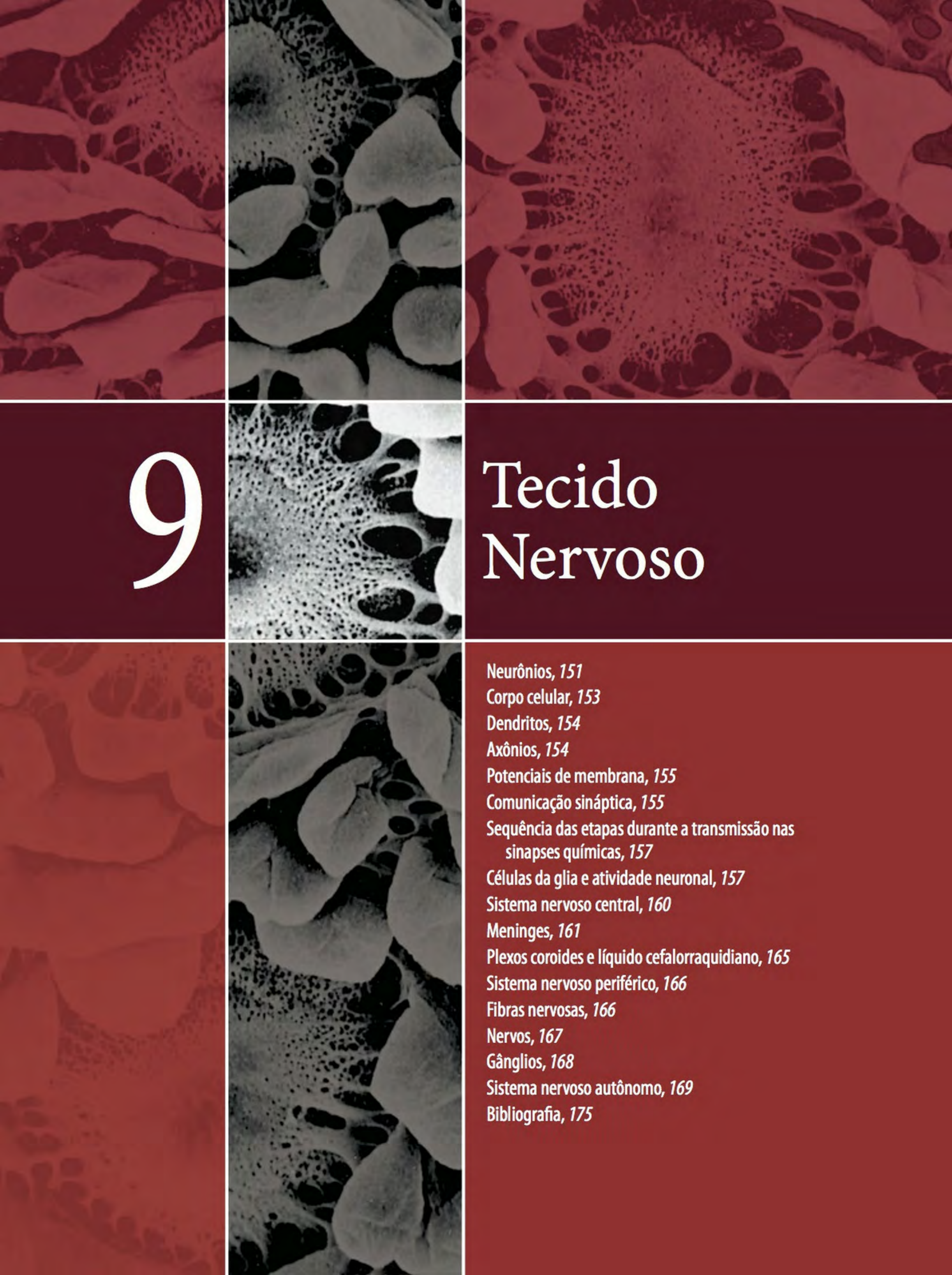 Tecido Nervoso Neurônios, 151 Corpo celular, 153 Dendritos, 154 Axônios, 154 Potenciais de membrana, 155 Comunicação sináptica, 155 Sequência das etapas durante a transmissão nas sinapses químicas, 157 Células da glia e atividade neuronal, 157 Sistema nervoso central, 160 Meninges, 161 Plexos coroides e líquido cefalorraquidiano, 165 Sistema nervoso periférico, 166 Fibras nervosas, 166 Nervos, 167 Gânglios, 168 Sistema nervoso autônomo, 169 Bibliografia, 175150 Histologia Básica Durante a evolução dos metazoários surgiram dois sis- mielina, que envolve determinados prolongamentos dos temas de integração para coordenar as funções dos vários neurônios (axônios). órgãos especializados que apareceram nesses animais: sis- Os neurônios têm a propriedade de responder a altera- tema nervoso e endócrino. ções do meio em que se encontram (estímulos) com modi- o tecido nervoso é distribuído pelo organismo, inter- ficações da diferença de potencial elétrico que existe entre ligando-se e formando uma rede de comunicações, que as superfícies externa e interna da membrana celular. As constitui o sistema nervoso. Anatomicamente, este sistema células que exibem essa propriedade (neurônios, células é dividido em: (1) sistema nervoso central (SNC), formado musculares e de algumas glândulas) são ditas "excitáveis". pelo encéfalo, constituintes neurais do sistema fotorreceptor Os neurônios reagem prontamente aos estímulos, e a modi- e medula espinal, e (2) sistema nervoso periférico (SNP), ficação do potencial pode restringir-se ao local do estímulo formado pelos nervos e por pequenos agregados de células ou propagar-se ao restante da célula, através da membrana. nervosas denominados gânglios nervosos (Figura 9.1). Os Essa propagação constitui o que se denomina impulso ner- nervos são constituídos principalmente por prolongamen- voso, cuja função é transmitir informações a outros neurô- tos dos neurônios (células nervosas) situados no SNC ou nios, músculos ou glândulas. nos gânglios nervosos. Os neurônios, por meio de seus prolongamentos geral- o tecido nervoso apresenta dois componentes princi- mente longos e numerosos, formam circuitos. Da mesma pais: (1) os neurônios, células geralmente com longos pro- maneira que os circuitos eletrônicos, os circuitos neuro- longamentos, e (2) vários tipos de células da glia ou neu- nais são de diversos tamanhos e complexidades. o circuito róglia, que sustentam os neurônios e participam de outras neural pode ser simples, porém, na maioria das vezes, tra- funções importantes. ta-se da combinação de dois ou mais circuitos que intera- No SNC há uma segregação entre os corpos celulares gem para executar uma função. Muitos circuitos elementa- dos neurônios e os seus prolongamentos. Isso faz com que res se comunicam em grau crescente de complexidade para sejam reconhecidas no encéfalo e na medula espinal duas desempenhar funções cada vez mais complexas. porções distintas, denominadas substância branca e subs- As funções fundamentais do sistema nervoso são: (1) tância cinzenta. detectar, transmitir, analisar e utilizar as informações A substância cinzenta é assim chamada porque mostra geradas pelos estímulos sensoriais representados por essa coloração quando observada macroscopicamente. É calor, luz, energia mecânica e modificações químicas do formada principalmente por corpos celulares dos neurô- ambiente externo e interno; (2) organizar e coordenar, nios e células da glia, contendo também prolongamentos direta ou indiretamente, o funcionamento de quase todas de neurônios. as funções do organismo, entre as quais as funções moto- A substância branca não contém corpos celulares de ras, viscerais, endócrinas e psíquicas. Assim, o sistema neurônios, sendo constituída por prolongamentos de neu- nervoso estabiliza as condições intrínsecas do organismo, rônios e por células da glia. Seu nome origina-se da grande como pressão sanguínea, tensão de e de teor de quantidade de um material esbranquiçado denominado glicose, de hormônios e pH do sangue, e participa dos Recepção de Sistema Transmissão para a informações do nervoso central (SNC) periferia de impulsos ambiente gerados no SNC Entradas (inputs) Saídas (outputs) Cérebro Mucosa olfatória Retina (SNC) Glândulas salivares Ouvido interno Gânglios do sistema nervoso autônomo Gânglios sensoriais Botões gustativos Medula espinhal Músculos lisos Nervos motores Pele, músculos, Músculos esqueléticos articulações, vísceras Nervos sensoriais Nervos gânglios Cérebro e medula espinhal Nervos gânglios Figura 9.1 Desenho esquemático e simplificado que mostra a organização funcional do sistema nervoso.9 Tecido Nervoso 151 padrões de comportamento, como os relacionados com a Axônio, prolongamento único, especializado na condução alimentação, reprodução, defesa e interação com outros de impulsos que transmitem informações do neurônio seres vivos. para outras células (nervosas, musculares, glandulares). As dimensões e a forma das células nervosas e seus pro- Neurônios longamentos são muito variáveis (Figura 9.3). o corpo celular pode ser esférico, piriforme ou anguloso. Em geral, As células nervosas ou neurônios são responsáveis as células nervosas são grandes, podendo 0 corpo celular pela recepção, transmissão e processamento de estímulos. medir até 150 µm. Uma célula com esta dimensão, quando isolada, é visível a olho nu. Todavia, os neurônios denomi- Além disso, influenciam diversas atividades do organismo e liberam e outras moléculas informa- nados células granulosas do cerebelo estão entre as menores cionais. Os neurônios são formados pelo corpo celular ou células dos mamíferos, tendo seu corpo celular 4 a 5 mm de diâmetro. pericário, que contém o núcleo e do qual partem prolon- gamentos. Em geral, o volume total dos prolongamentos 