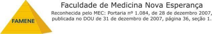 Av. Frei Galvão, 12 - Bairro Gramame - João Pessoa - Paraíba - Brasil CEP.: 58.067-695 - Fone/Fax : +55 (83) 2106-4777 EDITAL Nº 36/2024 A Diretora da Faculdade de Medicina Nova Esperança – Famene, no uso de suas atribuições legais, tendo em vista o disposto na Lei 9394/96 e na legislação pertinente, torna públicas as normas e condições estabelecidas neste Edital, aprovado no CTA pela Resolução nº 10/2024 de 02/08/2024, que rege o Processo Seletivo 2025.1. Referido Processo Seletivo obedecerá às seguintes disposições: 1. Destina-se a classificar candidatos para o preenchimento de 90 (noventa) vagas/horário integral no Curso de Graduação em Medicina, da Faculdade de Medicina Nova Esperança, para o semestre letivos de 2025.1; 2. A Famene não dispõe de vagas ao programa do FIES (Fundo de Financiamento Estudantil), em nenhuma de suas modalidades; 3. Adere ao PROUNI (Programa Universidade para Todos), dispondo de bolsas de acordo com a legislação vigente; 4. É oferecido o Crédito Bradesco Universitário, Santander Universidades e SICREDI (toda proposta para abertura de conta está sujeita à aprovação). Para mais informações, procurar o setor de Financiamento Estudantil/Convênios. 5. Poderá participar desse processo o candidato que tenha concluído o Ensino Médio ou equivalente. Da inscrição: a) A inscrição será realizada até o dia 16 de outubro de 2024, exclusivamente pelo site www.famene.com.br, até as 22h, e realizada mediante o preenchimento do Requerimento de Inscrição, do Questionário Socioeconômico, disponíveis somente no ícone “Inscrições pela Internet”, anexando os arquivos dos seguintes documentos escaneados (arquivos de imagem permitidos JPG, PEG, PJPEG, GIF, PNG, X-PNG): RG (frente e verso), CPF e uma foto 3x4 recente, quando for o caso. Realizar o pagamento no valor de R$ 200,00 (duzentos reais), a ser pago por meio do cartão de crédito ou PIX, impreterivelmente até as 22h do dia 16/10/2024. b) É de exclusiva responsabilidade do candidato, ou de seu representante legal, o correto preenchimento e o envio de todos os documentos escaneados e anexados no sistema de inscrição, e do pagamento da taxa de inscrição e a conferência dos documentos enviados, quando da inscrição, conforme letra a; http://www.famene.com.br/ Av. Frei Galvão, 12 - Bairro Gramame - João Pessoa - Paraíba - Brasil CEP.: 58.067-695 - Fone/Fax : +55 (83) 2106-4777 c) Realizar o pagamento por meio do cartão de crédito ou PIX no valor de R$ 200,00 (duzentos reais), que deverá ser pago até às 22h do dia 16/10/2024. d) Não serão aceitas e realizadas inscrições de forma presencial, por e-mail, via postal ou fax; e) A Comvest não se responsabiliza por solicitação de inscrição via internet não recebida por motivos de ordem técnica dos computadores, falhas de comunicação, congestionamento das linhas de comunicação ou por outros fatores de ordem técnica que impossibilitem a transferência de dados; f) Também não serão aceitas inscrições pagas por depósito em caixa eletrônico, via postal, cartão de débito, transferência ou depósito em conta corrente, ordem de pagamento ou por qualquer outra via que não a especificada neste Edital e no Manual do Candidato; g) O candidato deve estar ciente de que se o pagamento não puder ser realizado por qualquer motivo, a inscrição não será efetivada. O comprovante de agendamento ou o extrato bancário da conta debitada não será aceito para fins de comprovação do pagamento; h) A confirmação do pagamento poderá ser consultada pelo site www.famene.com.br em até 01 (um) dia útil após a realização do pagamento, acessando a área referente a este concurso e fazendo a consulta de sua inscrição a partir da informação do seu CPF e e-mail; i) Para a realização da prova, o candidato que necessitar de atendimento diferenciado ou possuir alguma deficiência deverá requerer tal tratamento, juntamente com sua inscrição, até o dia 16 de outubro, justificando seu caso e comprovando sua necessidade com laudo médico escaneado, frente e verso, em um dos arquivos de imagem aceitos, contendo o nome da patologia e o CID e assinatura do médico, com número do CRM. O laudo médico apresentado deverá ser atualizado e terá validade somente para este Concurso, e não será devolvido; j) O candidato usuário de aparelho auricular, ou marcapasso, ou qualquer medicação controlada deverá comprovar sua necessidade, no dia da prova, através de laudo médico atualizado, justificando a utilização desses aparelhos durante a revista com o detector de metais; k) O candidato que não fizer sua solicitação até o dia 16 de outubro, seja qual for o motivo alegado, não terá atendimento à condição especial requerida. l) A Comvest analisará cada caso conforme solicitação, ficando sujeito à análise da legalidade, viabilidade e razoabilidade do pedido, num prazo máximo de até 24 horas antes do início oficial das provas. m) A Comvest informa que NÃO será realizado atendimento domiciliar em nenhuma hipótese. 8. A não integralização dos procedimentos de inscrição (que envolvem o preenchimento correto do requerimento de inscrição próprio, o envio dos documentos escaneados e anexados ao requerimento de inscrição e o pagamento da taxa de inscrição), implicará o cancelamento da inscrição e a consequente eliminação no presente concurso vestibular. 9. Não haverá, em hipótese alguma, devolução da taxa de inscrição. 10. Ao candidato só será permitida uma inscrição, por apenas um CPF. 11. O candidato habilitado deverá realizar a impressão e conferência do cartão de inscrição disponível no site da Famene a partir do dia 17 de outubro, devendo assinar o cartão de inscrição conforme a identidade (RG). http://www.famene.com.br/ Av. Frei Galvão, 12 - Bairro Gramame - João Pessoa - Paraíba - Brasil CEP.: 58.067-695 - Fone/Fax : +55 (83) 2106-4777 12. O candid