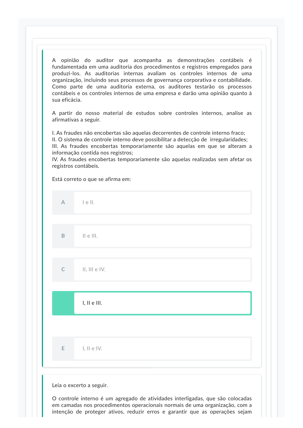 A opinião do auditor que acompanha as demonstrações contábeis é fundamentada em uma auditoria dos procedimentos e registros empregados para produzi-los. As auditorias internas avaliam os controles internos de uma organização, incluindo seus processos de governança corporativa e contabilidade. Como parte de uma auditoria externa, os auditores testarão os processos contábeis e os controles internos de uma empresa e darão uma opinião quanto à sua eficácia. A partir do nosso material de estudos sobre controles internos, analise as afirmativas a seguir. I. As fraudes não encobertas são aquelas decorrentes de controle interno fraco; II. O sistema de controle interno deve possibilitar a detecção de irregularidades; III. As fraudes encobertas temporariamente são aquelas em que se alteram a informação contida nos registros; IV. As fraudes encobertas temporariamente são aquelas realizadas sem afetar os registros contábeis. Está correto o que se afirma em: D I, II e III. Resposta correta A I e II. B II e III. C II, III e IV. E I, II e IV. Leia o excerto a seguir. O controle interno é um agregado de atividades interligadas, que são colocadas em camadas nos procedimentos operacionais normais de uma organização, com a intenção de proteger ativos, reduzir erros e garantir que as operações sejam conduzidas de forma aprovada. Outra forma de observar os controles internos é que estas atividades são necessárias para reduzir a quantidade e os tipos de risco aos quais possam vir a ocorrer. A partir do nosso material de estudos, sobre os controles internos, analise as afirmativas a seguir. I. As organizações, no geral, possuem controles internos, adequados ou não; II. Informações contábeis distorcidas podem levar a conclusões imprecisas pela empresa; III. Um sistema de controle interno independe de relatórios operacionais periódicos, o controle orçamentário e programas de treinamento do pessoal; IV. Os controles internos da segurança inadequada às atividades praticadas ao longo de toda a organização, de forma vertical e horizontal. Está correto o que se afirma em: A I e II. Resposta correta B II e III. C II, III e IV. D I, II e III. E I, II e IV. Leia o excerto a seguir. Uma organização pode realizar auditorias de acompanhamento para verificar se ações preventivas foram tomadas como resultado de problemas de desempenho, que podem ser relatados como oportunidades de melhoria. Outras vezes, as organizações podem encaminhar problemas de desempenho identificados ao gerenciamento para acompanhamento. A respeito das fases do trabalho de auditoria, analise as afirmativas a seguir e assinale V para a(s) verdadeira(s) e F para a(s) falsa(s). I. ( ) A prova de fonte interna possui mais validade que a conseguida externamente; II. ( ) Os relatórios complementares são compostos por revisões mais detalhadas; III. ( ) A partir da execução, o auditor define o parecer de auditoria a ser emitido; IV. ( ) As evidências obtidas permitem dar base à opinião do auditor. Assinale a alternativa que apresenta a sequência correta. A F, V, F, V. Resposta correta B V, V, F, F. C F, F, F, F. D V, V, F, V. E V, V, V, V. O planejamento é a fase de auditoria em que podemos influenciar melhor os resultados do trabalho de auditoria. É um componente chave, mas facilmente negligenciado durante o processo de auditoria. É algo que necessita ser enfatizado, de forma a resultar no sucesso da auditoria. Considerando o nosso material de estudos, sobre o planejamento e execução de auditoria, analise as afirmativas a seguir. I. A revisão dos papéis de trabalho do auditor posterior é um item que deve ser pensado no planejamento da primeira auditoria; II. Os eventos relevantes subsequentes ao exercício anterior devem ser discutidos com a administração da empresa; III. A uniformidade dos procedimentos contábeis depende dos procedimentos contábeis uniformes adotados; IV. No planejamento de auditoria, o auditor deve certificar-se dos procedimentos contábeis adotados no exercício anterior. Está correto o que se afirma em: A I e II. C II, III e IV. Resposta correta B II e III. D I, II e III. E I, II e IV. Leia o excerto a seguir. A NBC TA 260 “foi escrita no contexto da auditoria de demonstrações contábeis, mas pode também ser aplicável, adaptada, conforme necessário nas circunstâncias, aos trabalhos de auditoria de outras informações contábeis históricas quando os responsáveis pela governança têm a responsabilidade de supervisionar de forma geral a elaboração das outras informações contábeis históricas” (BRASIL, 2016, on-line). BRASIL. Norma Brasileira de Contabilidade - NBC TA 260 (R2), de 17 de junho de 2016. Dá nova redação à NBC TA 260 (R1) que dispõe sobre a comunicação com os responsáveis pela governança. CCoonnsseellhhoo FFeeddeerraall ddee CCoonnttaabbiilliiddaaddee, Brasília, DF, 17 jun. 2016. Disponível em: https://www1.cfc.org.br/sisweb/SRE/docs/ NBCTA260R2.pdf. Acesso em: 22 jul. 2022. A respeito da NBC TA 260, analise as afirmativas a seguir e assinale VV para a(s) verdadeira(s) e FF para a(s) falsa(s). I. ( ) A comunicação efetiva recíproca é importante no contexto da auditoria; II. ( ) A comunicação efetiva recíproca é importante para obter informações relevantes para a auditoria; III. ( ) A comunicação efetiva recíproca é importante para auxiliar os auditores na tomada de decisões de investimentos empresariais; IV. ( ) A comunicação efetiva recíproca é importante para auxiliar na redução dos riscos de distorção relevante nas demonstrações contábeis. Assinale a alternativa que apresenta a sequência correta. A F, V, F, V. D V, V, F, V. Resposta correta B V, V, F, F. C F, F, F, F. E V, V, V, V. Leia o excerto a seguir. Controles internos são políticas e procedimentos definidos para garantir a confiabilidade contínua dos sistemas contábeis. Precisão e confiabilidade são fundamentais para a contabilid