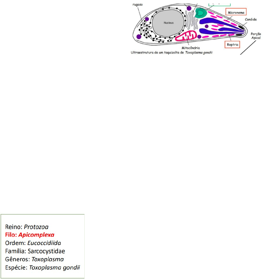 Toxoplasmose Nome científico : Toxoplasma gondii É um parasita intracelular obrigatório É popularmente conhecida como a doença do gato- são os hospedeiros definitivos do parasita, ou seja, é no intestino deles que esse parasita se reproduz sexualmente / Eles eliminam os oócitos pelas fezes, que podem contaminar a água, alimentos e outros animais Muitos casos são assintomáticos / Nos casos mais graves, o sistema imune é gravemente comprometido causando encefalite( inflamação do cérebro) , retinite( inflamação na retina, pode causar cegueira) ou doença disseminativa(atinge vários órgãos) É uma zoonose frequente em várias espécies de mamíferos CLASSIFICAÇÃO TAXONÔMICA MORFOLOGIA DO PARASITA Complexo apical> Formado pelo conóide, roptrias e micronemas , que auxiliam na adesão e invasão das formas do parasito na células hospedeiras CICLO DE VIDA ● Hospedeiro definitivo- Gatos ● Hospedeiro intermediário- Mamíferos, principalmente homens e aves ASPECTOS MORFOLÓGICOS FORMA → Taquizoítas São a forma ativa e proliferativa do Toxoplasma gandii durante a fase aguda da infecção, ou seja, logo após o contato com o parasita Altamente ativo- usa nutrientes da célula hospedeira para se replicar rapidamente Acomete várias células e se alojam nelas : como nos líquidos orgânicos, excreções, células do SMF( sistema mononuclear fagocitário), células hepáticas, pulmonares, nervosas , submucosas e musculares Possui metabolismo ativo A sua função é a multiplicação e disseminação do parasita pelo organismo ASPECTOS MORFOLÓGICOS FORMA: Bradizoítas São a forma lenta e “adormecida” do parasita. Ou seja, são metabolicamente inativos ou muito pouco ativos Representam a forma crônica da toxoplasmose, quando o sistema imunológico consegue conter a infecção , mas não elimina totalmente o parasita Encontrados em tecido musculares esqueléticos, músculo cardíaco, sistema nervoso central e retina Possui uma parede resistente e elástica, que protege os bradizóitos da ação do sistema imune Os oocistos são a forma resistente do parasita no ambiente/ Eliminado pelas fezes dos felídeos, que são os únicos hospedeiros definitivos desse parasita Possuem parede dupla e espessa, o que os torna altamente resistentes a variações ambientais No ambiente, após 1 a 5 dias, os oocistos amadurecem e se transformam em oocistos esporulados ( com esporozoítos dentro) – que são a forma infectante para outros animais e humanos Eles são produzidos nas células intestinais TRANSMISSÃO O ser humano é infectado por três vias principais> 1) FECAL/ORAL → Ingestão de oocistos maduros, presentes nos alimentos ou água contaminadas, jardins , caixas de areis, latas de lixo ou disseminados mecanicamente por moscar, baratas, minhocas. …. 2) CARNIVORISMO → Ingestão de bradizoítos encontrados em carne de porco e carneiro. Os cistos resistem por semana ao frio, mas o congelamento a 12 graus ou o aquecimento acima de 67 graus os mata 3) CONGÊNITA OU TRANSPLACENTÁRIA → Ocorre quando a mão se infecta durante a gravidez ou ocorre reagudização da doença ( presença de taquizoítos) SINTOMATOLOGIA Pode ser assintomática ou apresentar sintomas brandos como febre, dores de cabeça e musculares, … Infecção adquirida durante a gestação pode ser transmitida ao feto e causar grave comprometimento da criança, com sequelas neurológicas e oculares de gravidade variável – Pode ocorrer abortos, partos prematuros nos primeiros meses de gestação,. Nos últimos meses, a criança pode nascer normal e apresentar evidências da doença alguns dias, semanas ou meses depois / A gravidade depende da idade do feto, no início da gravidez gera consequências mais graves e severas e no final da gestação relativamente menos severas/ O parasita atravessa a placenta Infecção congênita ocorre somente quando a mãe é infectada na gravidez Muito comum ocorrer a TRÍADE DE SABIN: conjunto de três sinais clínicos clássicos observado em recém nascidos com toxoplasmose congênita Coriorretinite; Calcificações intracranianas;▪ Hidrocefalia ou microcefalia; Retardo▪ ▪ mental. Coriorretinite → Inflamação da coroide e retina. Pode causar problemas visuais graves e até cegueira. Pode se manifestar no nascimento ou anos depois. Calcificações intracranianas → Pequenos depósitos de cálcio no cérebro, visíveis em exames de imagem. Indicam lesões cerebrais causadas pelo parasita. Estão associadas a comprometimento neurológico. Hidrocefalia ou Microcefalia → Hidrocefalia: acúmulo anormal de líquor no cérebro, causando aumento do crânio e pressão intracraniana./ Microcefalia: crânio e cérebro menores que o normal, com atraso no desenvolvimento. Indivíduos imunossuprimidos ( HIV positivo, transplantado, quimioterapia) podem sofrer danos maiores tais como cegueira, lesões cerebrais, podendo em casos extremos , levar a morte TAXOPLASMOSE OCULAR A lesão na retina é frequentemente associada a essa doença. É uma consequência de uma infecção aguda com a presença de traquizóitos ou crônica com a presença de cistos contendo bradizoítos localizados na retina Coriorretinite é a lesão mais frequentemente associada a Toxoplasmose e, em 30 a 60% dos pacientes com esta enfermidade, a etiologia pode ser atribuída ao toxoplasma. Dois tipos de lesões de retina podem ser observados: a retinite aguda, com intensa inflamação, e a retinite crônica, com perda progressiva de visão, algumas vezes chegando a cegueira. TAXOPLASMOSE CÉREBRO-ESPINAL Os parasitos . Atacando as células nervosas , provocarão lesões focais múltiplas . Como consequência, podem causar cefaleia, febre, anomalias focais manifestando hemiparesia (paralisia) leve até perda da capacidade de coordenação muscular, confusão mental, convulsões, letargia, coma, até a morte do paciente A manifestação clínica principal da toxoplasmose é a linfadenopatia cervical, por