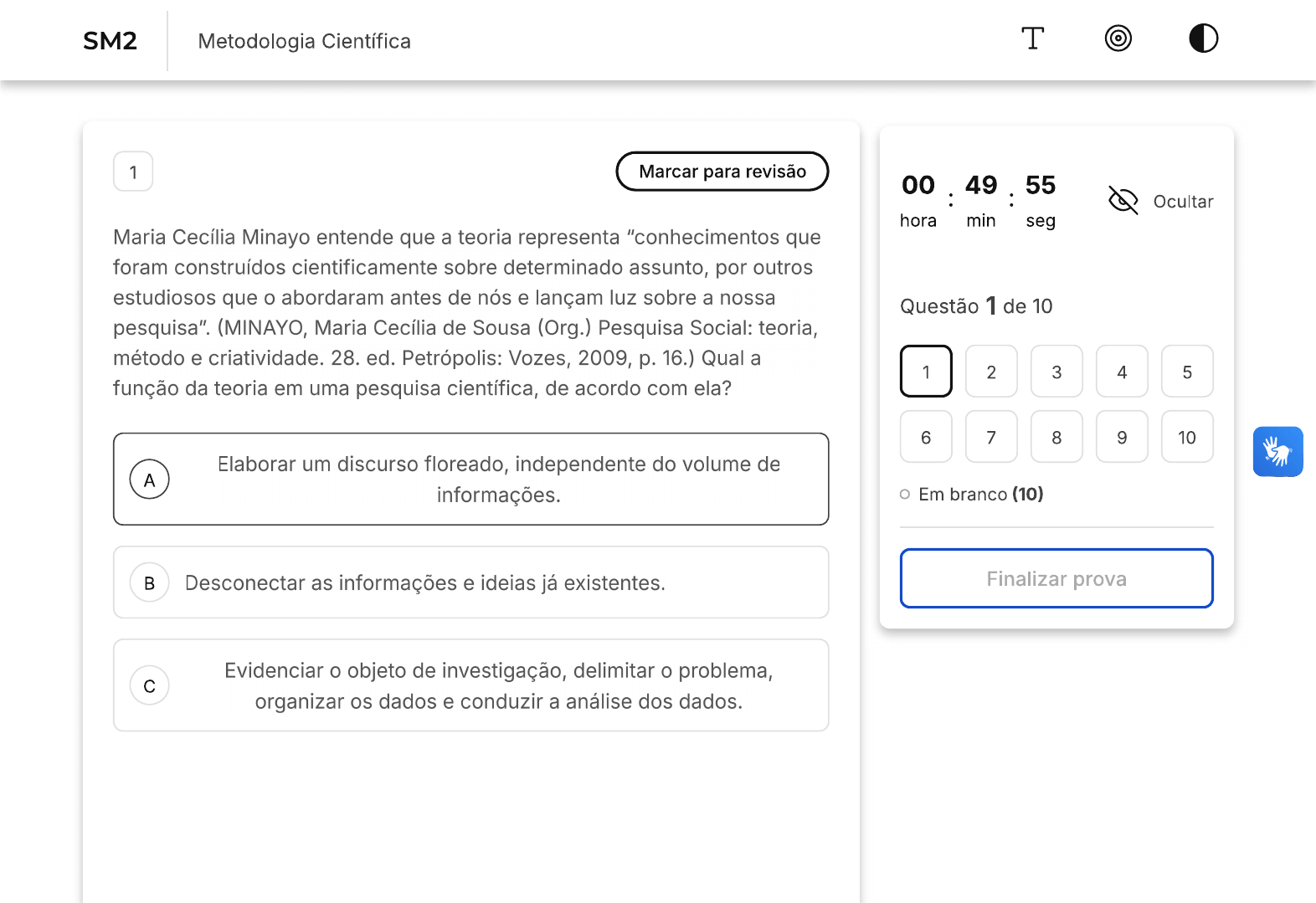 SM2 Metodologia Científica T 1 Marcar para revisão 00 : 49 : 55 Ocultar hora min seg Maria Cecília Minayo entende que a teoria representa "conhecimentos que foram construídos cientificamente sobre determinado assunto, por outros estudiosos que o abordaram antes de nós e lançam luz sobre a nossa Questão 1 de 10 pesquisa". (MINAYO, Maria Cecília de Sousa (Org.) Pesquisa Social: teoria, método e criatividade. 28. ed. Petrópolis: Vozes, 2009, p. 16.) Qual a 1 2 3 4 5 função da teoria em uma pesquisa científica, de acordo com ela? 6 7 8 9 10 Elaborar um discurso floreado, independente do volume de A informações. Em branco (10) Desconectar as informações e ideias já existentes. Finalizar prova Evidenciar objeto de investigação, delimitar problema, c organizar os dados e conduzir a análise dos dados.D Ser a única base para a produção de novos conhecimentos. E Impedir que pesquisador possa inovar em sua área de atuação. 2 Marcar para revisão plágio, além de ser considerado uma prática antiética na pesquisa científica, também é criminalizado, em razão da violação do direito autoral. Qual é a importância de citar as fontes de informação em um trabalho científico? Não há necessidade de citar as fontes de informação, uma vez A que trabalho é original. As citações são importantes apenas para evitar plágio. As citações são importantes para fortalecer os argumentos do c autor do trabalho.As citações são importantes apenas para dar crédito a trabalhos D anteriores. As citações são importantes para apresentar as fontes de E informação usadas e permitir a verificação e reprodução do trabalho. 3 Marcar para revisão A construção escrita do embasamento teórico do um trabalho acadêmico, especialmente aquele que se refere ao resultado de uma Pesquisa muito bem elaborada e estruturada, é um elemento essencial. Mas nem sempre de fácil execução. Por isso, torna-se necessária uma atenção especial a esse processo. Assinale a opção que melhor traduz essa ação necessária ao pesquisador:Estabelecer uma articulação lógica de ideias, que pode ser feita através de uma sequência cronológica de articulações com seu A tema, por exemplo, ou de outras estratégias que demonstrem coerência e situem leitor / incluir citações. Incluir citações diretas apenas, formatando adequadamente de acordo com as normas técnicas / contextualizar o tema Incluir as ideias dos autores apenas pelas suas palavras, para c evitar plágio / contextualizar o tema. Fazer uma ampla contextualização do tema, em uma perspectiva D geral. Deixar a abordagem específica do problema para a introdução apenas / incluir citações indiretas. Estabelecer uma articulação lógica de ideias, que pode ser feita através de uma sequência cronológica de articulações com seu E tema, por exemplo, ou de outras estratégias que demonstrem coerência e situem leitor / não incluir citações. 4 Marcar para revisãoUm trabalho científico deve ser realizado respeitando as normas da ABNT, a Associação Brasileira de Normas Técnicas. Qual é a função das normas técnicas? A Determinar tema a ser abordado na pesquisa. Formalizar a apresentação dos elementos constituintes do B trabalho. c Apontar as falhas do projeto de pesquisa. D Alterar a configuração gráfica do trabalho. E Identificar os resultados obtidos pela pesquisa. 5 Marcar para revisão Um artigo científico é um trabalho que pode ser elaborado tanto como uma revisão de um trabalho já existente quanto para um tema inédito e original. Para garantir que os tópicos principais, opcionais e obrigatórios estejampresentes no artigo, a Associação Brasileira de Normas Técnicas publicou qual norma? A NBR 6022. ABNT 2260. c NBR 3044. D NBR 9062. E NBR 1010. 6 Marcar para revisão Os resumos consistem em um recurso cuja exigência pelo uso é universal. Desse modo, verificamos seu emprego não só em fichamentos e resenhas acadêmicas, mas também nos elementos pré-textuais de artigos científicos e trabalhos de conclusão. Devido à sua múltipla utilização, a NBR 6028 (ABNT, 2003b) prevê a existência de resumos indicativos e informativos.Assinale a alternativa que contempla, exclusivamente, as características do resumo informativo: Presença de palavras-chave. Referência à metodologia. c Necessidade de leitura do texto completo. D Referência aos objetivos. E Dispensa da leitura do texto completo. 7 Marcar para revisão A tese consiste em um grande esforço de sistematização de uma pesquisa ou, pelo menos, dos pontos principais. Espera-se que ela apresente um alto grau de autonomia, seja original e contribua significativamente para avanço do conhecimento científico de suaárea. Assinale a alternativa que apresenta a característica esperada de uma tese: A Exaustão. Brevidade. Reflexões prolixas. D Extensão de páginas em detrimento da profundidade da análise. E Repetição de experiências anteriores. 8 Marcar para revisão Os artigos científicos são a produção mais comum no meio acadêmico, como resultado de um processo de pesquisa. E há muitos motivos para sua produção. Assinale a alternativa que apresenta um motivo mais coerente com outra forma de produção acadêmica que artigo:Registrar os resultados de uma pesquisa. Refutar um erro presente no campo de estudo. Dar visibilidade a uma questão que se revela secundária na c pesquisa. D Discutir, de maneira inovadora, uma questão antiga. Apresentar inovações ou descobertas significativas para a E ciência. 9 Marcar para revisão A respeito da produção acadêmica e dos diferentes tipos de trabalho científico produzidos, analise as afirmativas abaixo e responda: I. termo Tese de mestrado é aplicado de forma errônea, uma vez que produto de um mestrado acadêmico é a dissertação II. Trabalho de Conclusão de Curso ou monografia geralmente são produzidos ao final de um curso de graduaçãoIII. termo tese é usado de ma
