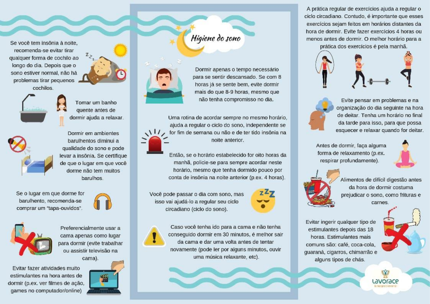 A prática regular de exercícios ajuda a regular o ciclo circadiano. Contudo, é importante que esses exercícios sejam feitos em horários distantes da hora de dormir. Evite fazer 4 horas ou Higiene do sono menos antes de dormir. o melhor horário para a Se você tem insônia à noite, prática dos exercícios é pela manhã. recomenda-se evitar tirar qualquer forma de cochilo ao longo do dia. Depois que Dormir apenas 0 tempo necessário sono estiver normal, não há para se sentir descansado. Se com 8 problemas tirar pequenos horas já se sente bem, evite dormir cochilos. mais do que 8-9 horas, mesmo que Tomar um banho não tenha compromisso no dia. Evite pensar em problemas e na quente antes de organização do dia seguinte na hora dormir ajuda a relaxar. Uma rotina de acordar sempre no mesmo horário, de deitar. Tenha um horário no final ajuda a regular o ciclo do sono, independente se da tarde para isso, para que possa Dormir em ambientes for fim de semana ou não e de ter tido insônia na esquecer e relaxar quando for deitar. barulhentos diminui a noite anterior. qualidade do sono e pode Antes de dormir, faça alguma levar a insônia. Se certifique Então, se o horário estabelecido for oito horas da forma de relaxamento (p.ex. de que 0 lugar em que você manhã, policie-se para sempre acordar neste respirar profundamente). dorme não tem muitos horário, mesmo que tenha dormido pouco por barulhos. conta de insônia na noite anterior (p.ex. 4 horas). Alimentos de difícil digestão antes da hora de dormir costuma Se 0 lugar em que dorme for Você pode passar 0 dia com sono, mas prejudicar sono, como frituras e barulhento, recomenda-se isso vai ajudá-lo a regular seu ciclo carnes. comprar um "tapa-ouvidos". circadiano (ciclo do sono). Evitar ingerir qualquer tipo de Preferencialmente usar a Caso você tenha ido para a cama e não tenha estimulantes depois das 18 cama apenas como lugar ! conseguido dormir em 30 minutos, é melhor sair horas. Estimulantes mais para dormir (evite trabalhar da cama e dar uma volta antes de tentar comuns são: café, coca-cola, ou assistir televisão na novamente (pode ler por alguns minutos, ouvir guaraná, cigarros, chimarrão e cama). uma música relaxante, etc). alguns tipos de chás. Evitar fazer atividades muito estimulantes na hora antes de dormir (p.ex. ver filmes de ação, games no computador/online)