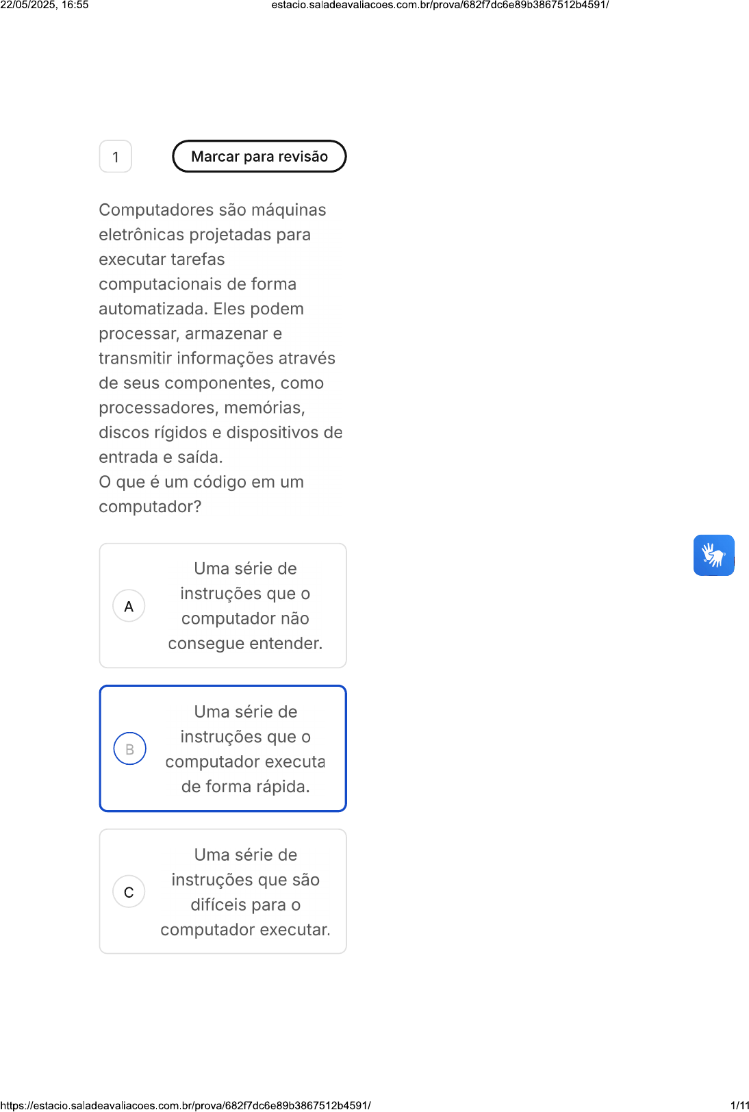 22/05/2025, 16:55 estacio.saladeavaliacoes.com.br/prova/682f7dc6e89b3867512b4591/ 1 Marcar para revisão Computadores são máquinas eletrônicas projetadas para executar tarefas computacionais de forma automatizada. Eles podem processar, armazenar e transmitir informações através de seus componentes, como processadores, memórias, discos rígidos e dispositivos de entrada e saída. que é um código em um computador? Uma série de instruções que A computador não consegue entender. Uma série de instruções que computador executa de forma rápida. Uma série de instruções que são c difíceis para computador executar. 1/1122/05/2025, 16:55 Uma série de instruções que são D difíceis para usuário compreender. Uma série de instruções que só E podem ser criadas por Inteligência Artificial. 2 Marcar para revisão Grande parte da vida profissional de um programador é dedicada ao estudo de diferentes linguagens de programação e como elas podem atender a uma necessidade específica da melhor maneira possível. Acerca dos princípios fundamentais da computação, que é um algoritmo? 2/1122/05/2025, 16:55 estacio.saladeavaliacoes.com.br/prova/682f7dc6e89b3867512b4591/ Um algoritmo é uma sequência não ordenada de instruções complexas e executáveis a serem A seguidas para a solução de um determinado problema, especialmente por computadores. É outra denominação para código de computador. O processador do computador, que processa instruções escritas em alguma linguagem para, c através de uma sequência de instruções bastante simples, gerar uma aplicação útil. https://estacio.saladeavaliacoes.com.br/prova/682f7dc6e89b3867512b4591/ 3/1122/05/2025, 16:55 estacio.saladeavaliacoes.com.br/prova/682f7dc6e89b3867512b4591/ ser humano, que escreve códigos em alguma linguagem para, através de uma D sequência de instruções complexas, gerar uma aplicação útil. Um algoritmo é uma sequência finita de instruções simples e SM1 Pensamento Computacional T determinado problema, especialmente por computadores. 00 : 35 : 23 Ocultar hora min seg Questão 9 de 10 3 Marcar para revisão 1 2 3 4 5 Linguagens de programação são conjuntos de símbolos, 6 7 8 9 10 palavras e regras sintáticas que permitem ao programador Respondidas (10) Em branco (0) escrever códigos. Qual é objetivo da utilização de uma linguagem de programação na Finalizar prova escrita de códigos para computador? 4/1122/05/2025, 16:55 estacio.saladeavaliacoes.com.br/prova/682f7dc6e89b3867512b4591/ Para tornar os A códigos mais complexos Para tornar os B códigos mais chiques e chamativos Para que computador c compreenda que fazer Para que sejam utilizados somente os D recursos principais da linguagem Para imprimir na tela E instruções simplificadas 4 Marcar para revisão (Avança SP/2022) Um software é um serviço computacional utilizado para realizar ações nos sistemas de computadores. Ou seja: Um software é todo programa presente nos diversos dispositivos (computadores, celulares, televisores, entre outros). Considerando a temática, não se enquadra como Software: 5/1122/05/2025, 16:55 estacio.saladeavaliacoes.com.br/prova/682f7dc6e89b3867512b4591/ A Android. iOS. c Microsoft Word. D Alexa. E Webcam. 5 Marcar para revisão (UNIOESTE/2022) Hardwares e Softwares são partes responsáveis pelo funcionamento que compõem um sistema computacional. Assinale a alternativa correta que indica um hardware e um software, respectivamente: Mouse e Editor de A Textos Monitor e Pendrive Scanner e Caneta c ótica 6/1122/05/2025, 16:55 estacio.saladeavaliacoes.com.br/prova/682f7dc6e89b3867512b4591/ Adobe Reader e D Mozilla Firefox MS Windows 10 e MS E Office 6 Marcar para revisão Analise as afirmações abaixo, e marque a opção correta. - Programas escritos em linguagens compiladas em geral rodam mais rapidamente nas CPUs, se comparados a programas escritos em linguagens interpretadas; Programas escritos em linguagem compiladas em geral rodam mais lentamente nas CPUs, se comparados a programas escritos em linguagens interpretadas; III Programas escritos em linguagens interpretadas em geral rodam mais rapidamente nas CPUs, se comparadas a programas escritos em linguagens compiladas; IV Programas escritos em linguagens interpretadas em geral rodam mais lentamente nas CPUs, se comparados a programas escritos em linguagens compiladas. 7/1122/05/2025, 16:55 Somente I e III estão A corretas. Apenas está correta. c Apenas está correta. Apenas III está D correta. Somente I e IV estão E corretas. 7 Marcar para revisão A conversão de grandezas nem sempre é uma tarefa trivial, mas entendimento das unidades de medida e sua lógica de utilização são fundamentais para profissional de TI. Nesse sentido, quantos bits possui um Megabyte? A 8.388.608 bits 1.048.576 bits c 1024 bits 8/1122/05/2025, 16:55 estacio.saladeavaliacoes.com.br/prova/682f7dc6e89b3867512b4591/ D 8.192 bits E 1.073.741.824 bits 8 Marcar para revisão Conforme estudamos, a Lei de Moore é uma observação, feita originalmente por Gordon Moore, cofundador da Intel. Analise as afirmações abaixo, e selecione as que podem ser atribuídas como consequências da Lei de Moore, ao longo das últimas décadas I A redução do custo de computadores, a ponto de serem usados em todos os setores do mercado de trabalho, tanto na esfera pública quanto privada. Aumento do poder computacional disponível ao público. Por exemplo, um computador pessoal (PC) modelo possui, atualmente, mais poder de processamento do que todo poder computacional do planeta nos anos 60. III aumento do custo de computadores. Mesmo assim, eles têm sido usados em todos os setores do mercado de trabalho, tanto na esfera pública quanto privada. 9/1122/05/2025, 16:55 estacio.saladeavaliacoes.com.br/prova/682f7dc6e89b3867512b4591/ A I e III lell c Somente I D Somente III E e III 9 Marcar para revisão Atualmente, a capacidade de armazenamento das memórias comercializadas po