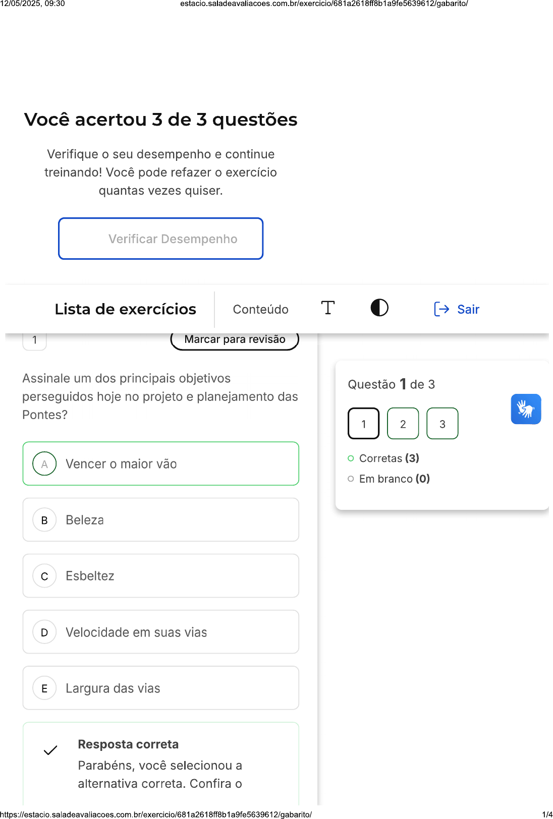 12/05/2025, 09:30 estacio.saladeavaliacoes.com.br/exercicio/681a2618ff8b1a9fe5639612/gabarito/ Você acertou 3 de 3 questões Verifique seu desempenho e continue treinando! Você pode refazer exercício quantas vezes quiser. Verificar Desempenho Lista de exercícios Conteúdo T Sair 1 Marcar para revisão Assinale um dos principais objetivos Questão 1 de 3 perseguidos hoje no projeto e planejamento das Pontes? 1 2 3 A Vencer maior vão Corretas (3) Em branco (0) Beleza c Esbeltez D Velocidade em suas vias E Largura das vias Resposta correta Parabéns, você selecionou a alternativa correta. Confira o https://estacio.saladeavaliacoes.com.br/exercicio/681a2618f8b1a9fe5639612/gabarito/ 1/412/05/2025, 09:30 estacio.saladeavaliacoes.com.br/exercicio/681a2618ff8b1a9fe5639612/gabarito/ gabarito comentado! Gabarito Comentado Hoje as Pontes são projetadas e planejadas objetivando vencer maior vão possível, com menor tempo de construção possível e gastando a menor quantidade de recursos possível. 2 Marcar para revisão Aponte um elemento geotécnico necessário para a elaboração do projeto de uma Ponte. A Relatório de Prospecção de Geologia Relatório Topográfico c Relatório de Contaminação D Relatório Hídrico E Relatório Orçamentário Resposta correta Parabéns, você selecionou a alternativa correta. Confira gabarito comentado! 2/412/05/2025, 09:30 Gabarito Comentado relatório de prospecção de geologia realizada no local de provável implantação da obra é um elemento geotécnico necessário para a elaboração do projeto de uma Ponte. relatório de prospecção de geologia é um documento que descreve as características geológicas do local onde a obra será construída. Ele é importante para a elaboração do projeto porque fornece informações sobre a resistência do solo, a presença de rochas e a existência de possíveis riscos geológicos, como a ocorrência de terremotos ou deslizamentos de terra. 3 Marcar para revisão que é Planejamento de Transportes? A Construir Pontes Construir Rodovias Estabelecer rotas e escolher modo c de transportes mais eficiente Implantar o Transporte Público nas D Cidades E Planejar as restrições veículares https://estacio.saladeavaliacoes.com.br/exercicio/681a2618ff8b1a9fe5639612/gabarito/ 3/412/05/2025, 09:30 Resposta correta Parabéns, você selecionou a alternativa correta. Confira gabarito comentado! Gabarito Comentado Desde que homem começou a realizar viagens, ele passou a realizar Planejamento de Transportes. Este Planejamento de Transportes significa estabelecer rotas e escolher modo de transportes mais eficiente para se chegar ao seu objetivo. 4/4